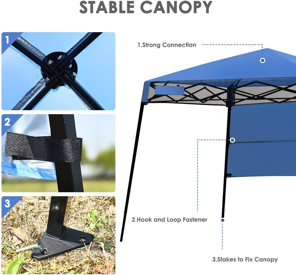 - Sturdy & Stable Frame: The frame of this folding canopy is made of premium steel, which is sturdy and can be used for long term. And the height of canopy can be adjusted in two positions. With slightly slant legs and stakes, the tent will be stable in breezy days.