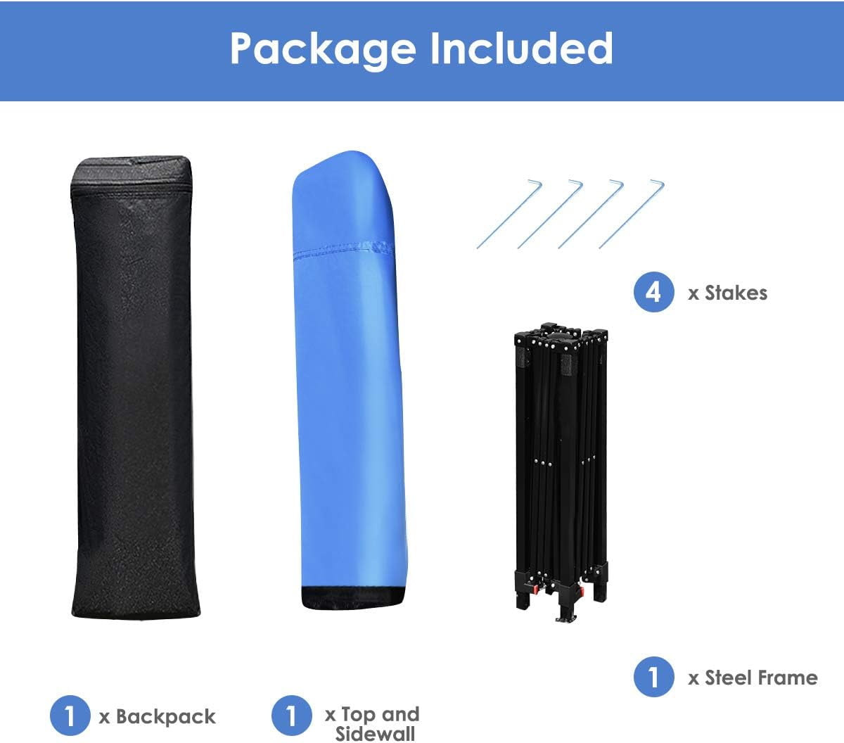 Stable Metal Construction: Supported by slanted metal legs and heavy-duty truss bars, the instant folding shelter offers a sturdy structure. Moreover, the base plates and 4 ground stakes help anchor the gazebo tent firmly to ground, preventing tipping over.