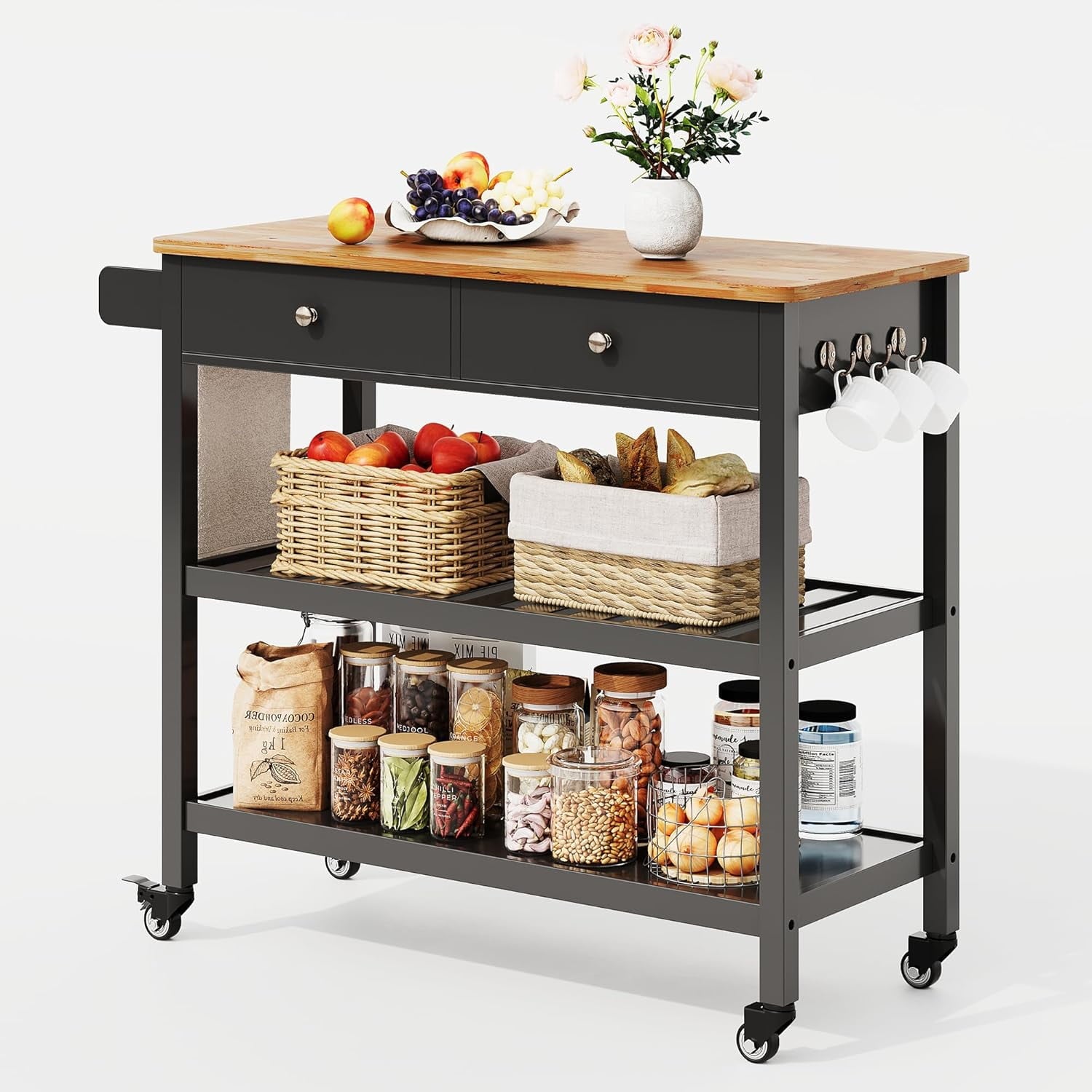 Movable and Lockable Wheels: This kitchen cart has four wheels for easy mobility and a long, comfortable handle for effortless maneuvering. It also features two locking castors to secure the cart in place