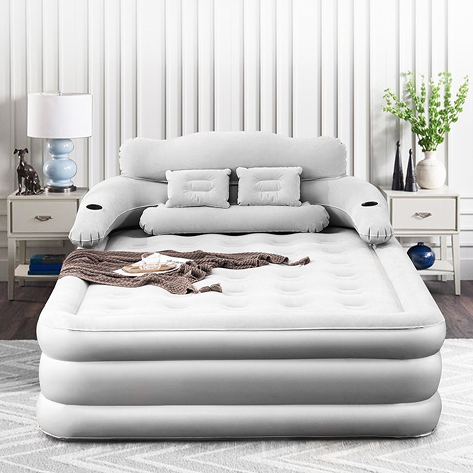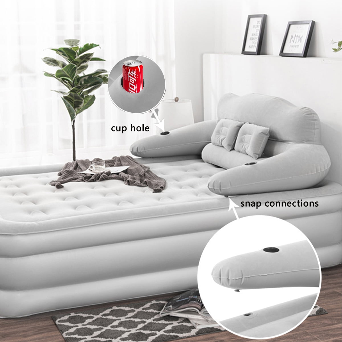 • Perfect Headboard Support: The headboard of queen air mattress is easy to remove/install, it has an ergonomic design to provide perfect support for your neck, back and lumbar, giving you extra comfort. The double cup hole design, you can place cups and other small objects, easily assemble and disassemble with snap connections for added convenience.