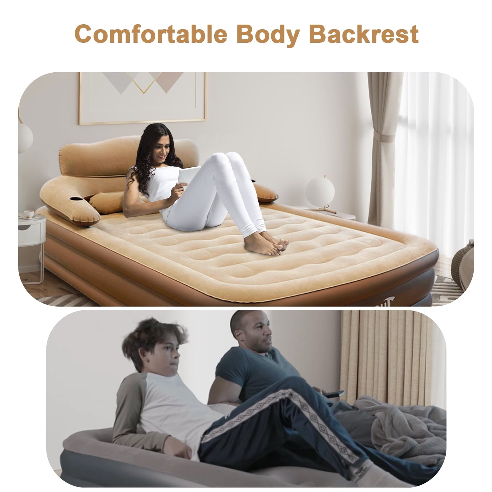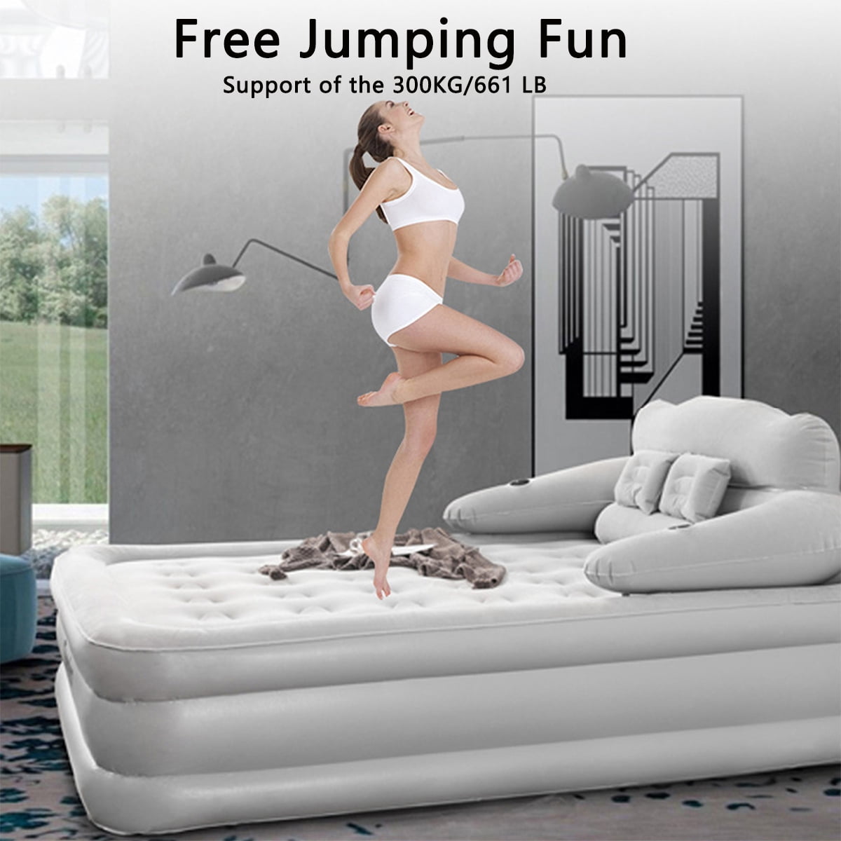 AJONALAA Our queen air mattress is made of 0.25mm plush+0.4mm PVC fabric, which is skin friendly, breathable, comfortable, waterproof, and wear-resistant. The inflation pump can quickly inflate and can be folded and stored in a storage bag when not in use. It is lightweight and easy to carry. Equipped with a three section headboard, providing comfortable support for your neck, back, and waist, with cup holes on both sides. The column combination structure ensures even force distribution on the body and prevents collapse. The blow up mattress leak proof design – double layer leak proof structure and precise fusion connection. The mattress has strong load-bearing capacity and can withstand a weight of 661 lb(300KG). The air mattress, waterproof blow up mattress can be used as a floor mattress at home, a portable bed for traveling, and even as a camping mattress in the great outdoors.