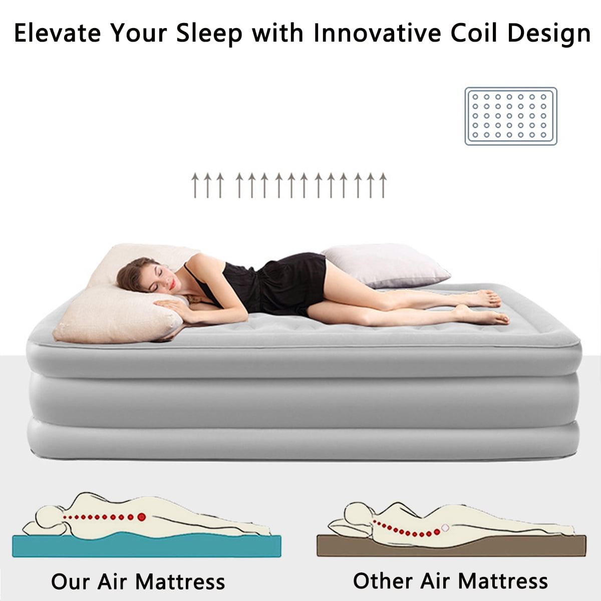 • Quick inflation and leak proof design: The inflation process is simple and fast. The inflatable mattress is equipped with a double-layer leak proof nozzle, which performs 85% better than a regular nozzle. The inflatable mattress adopts precise fusion connection, which is not prone to air leakage.