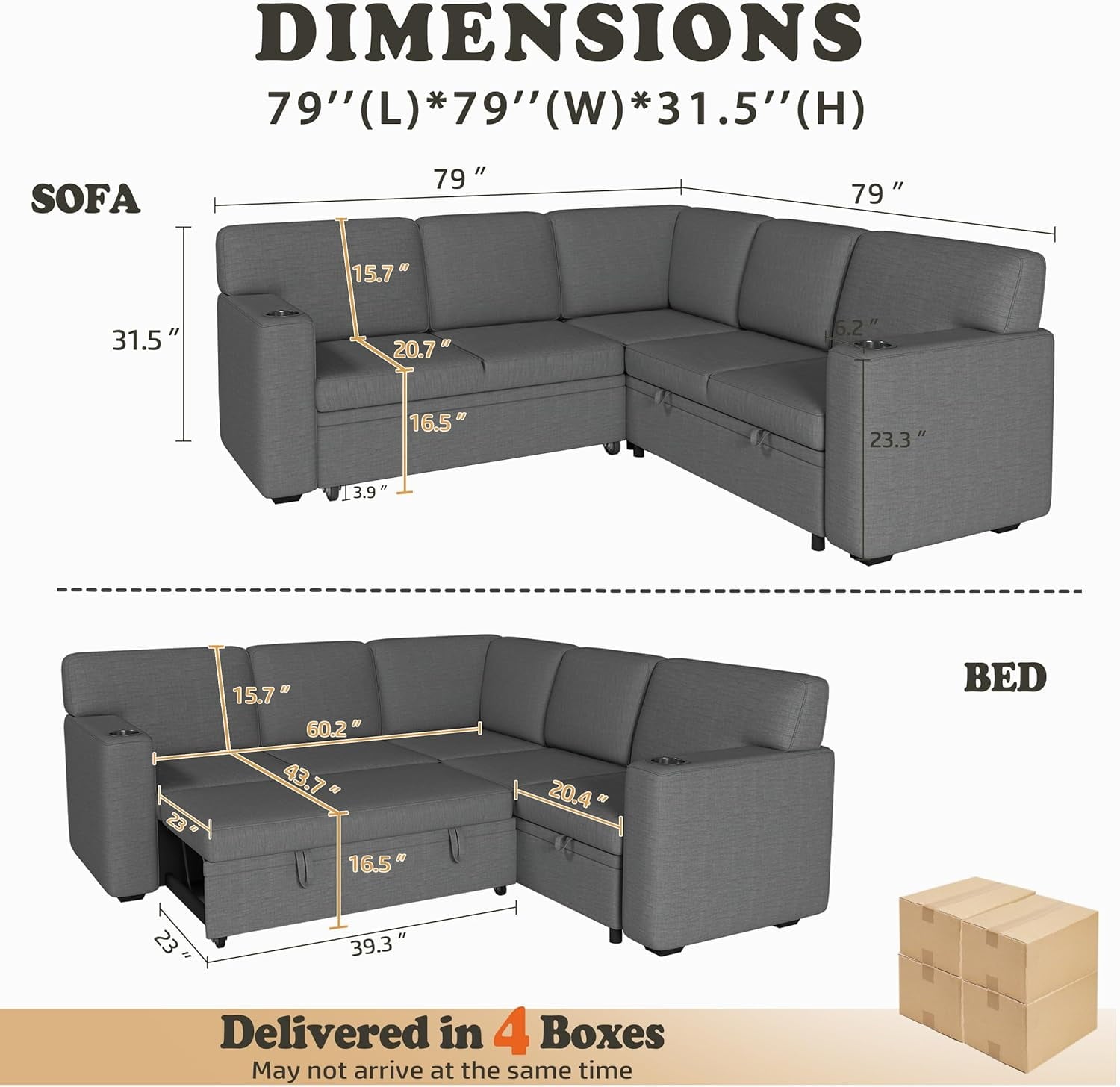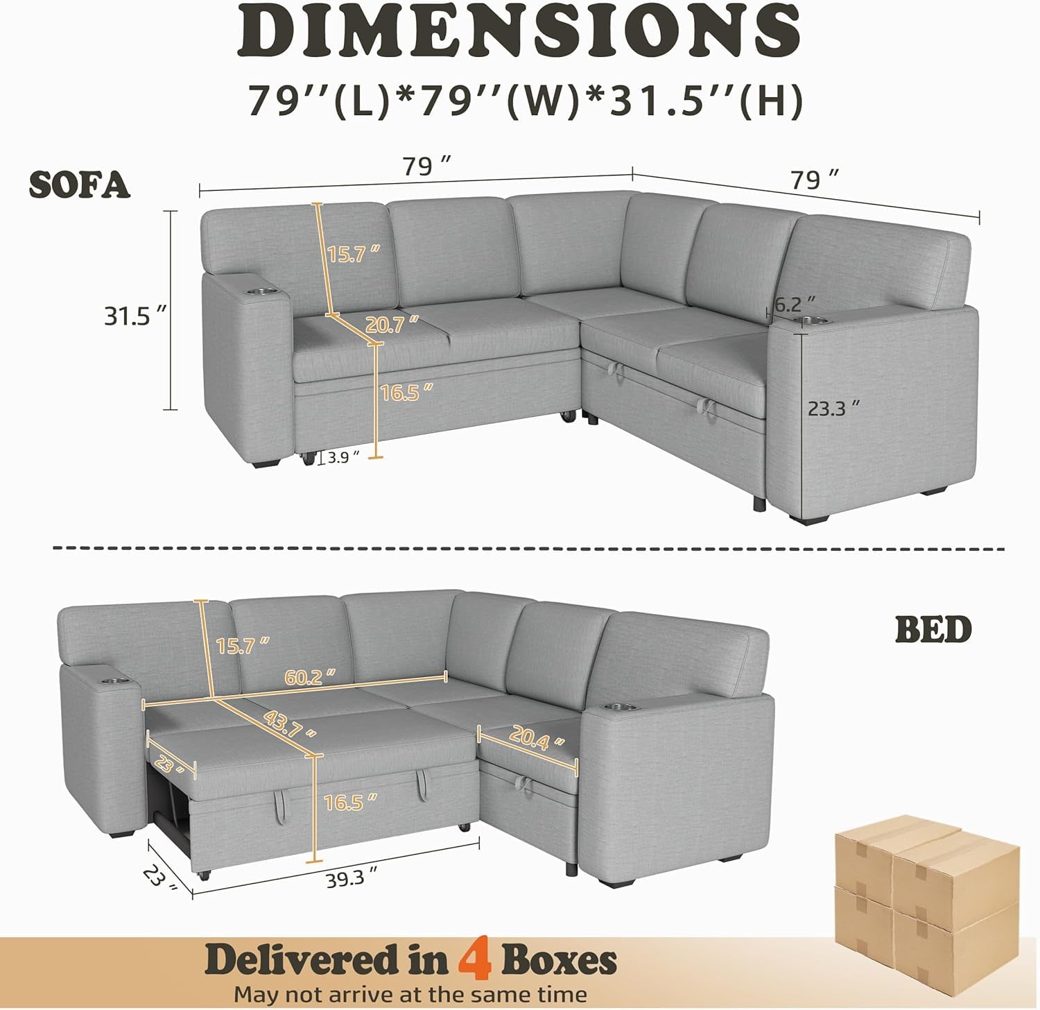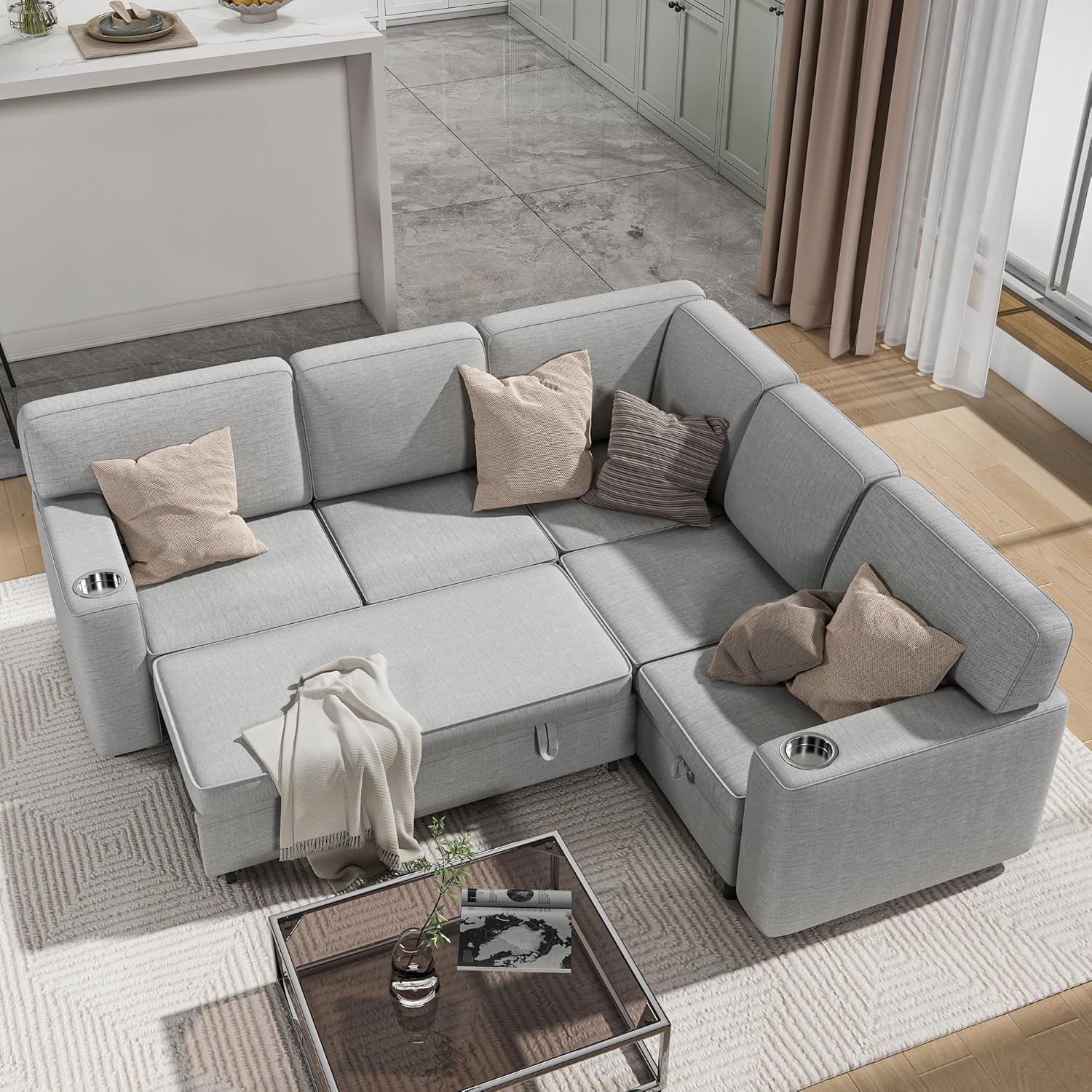 Akaber Modular 5-Seat L-Shaped Sleeper Sofa – Transform your space with this convertible sectional sofa bed featuring a pull-out trundle bed, built-in storage. Engineered for small apartments and living rooms, this modern track-arm sofa supports 1,500 lbs with 5 deep seats (79″×79″×31.5″). Enjoy cup holders for drinks, under-seat storage for essentials, and modular flexibility to reconfigure your layout. Easy assembly included!