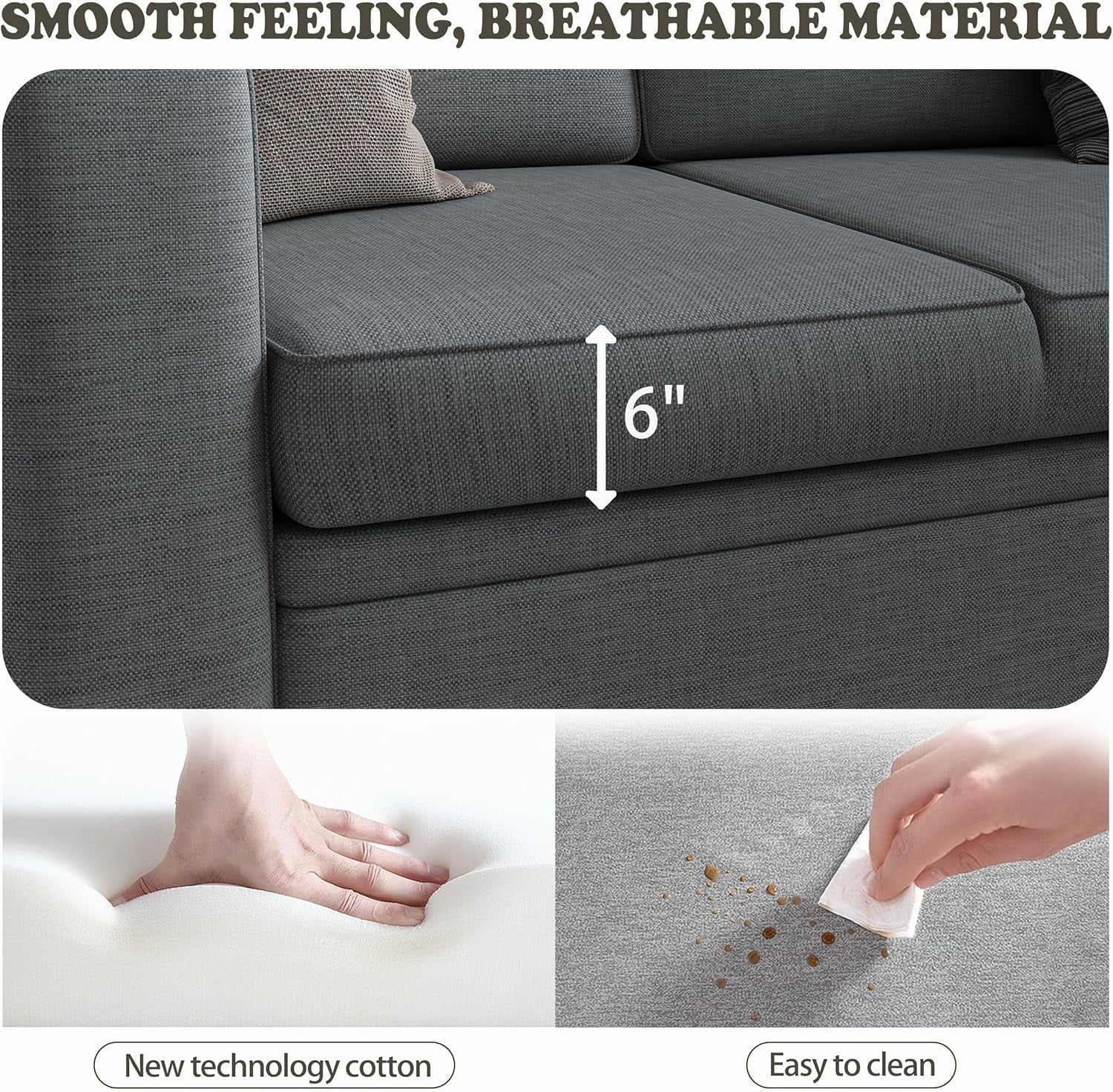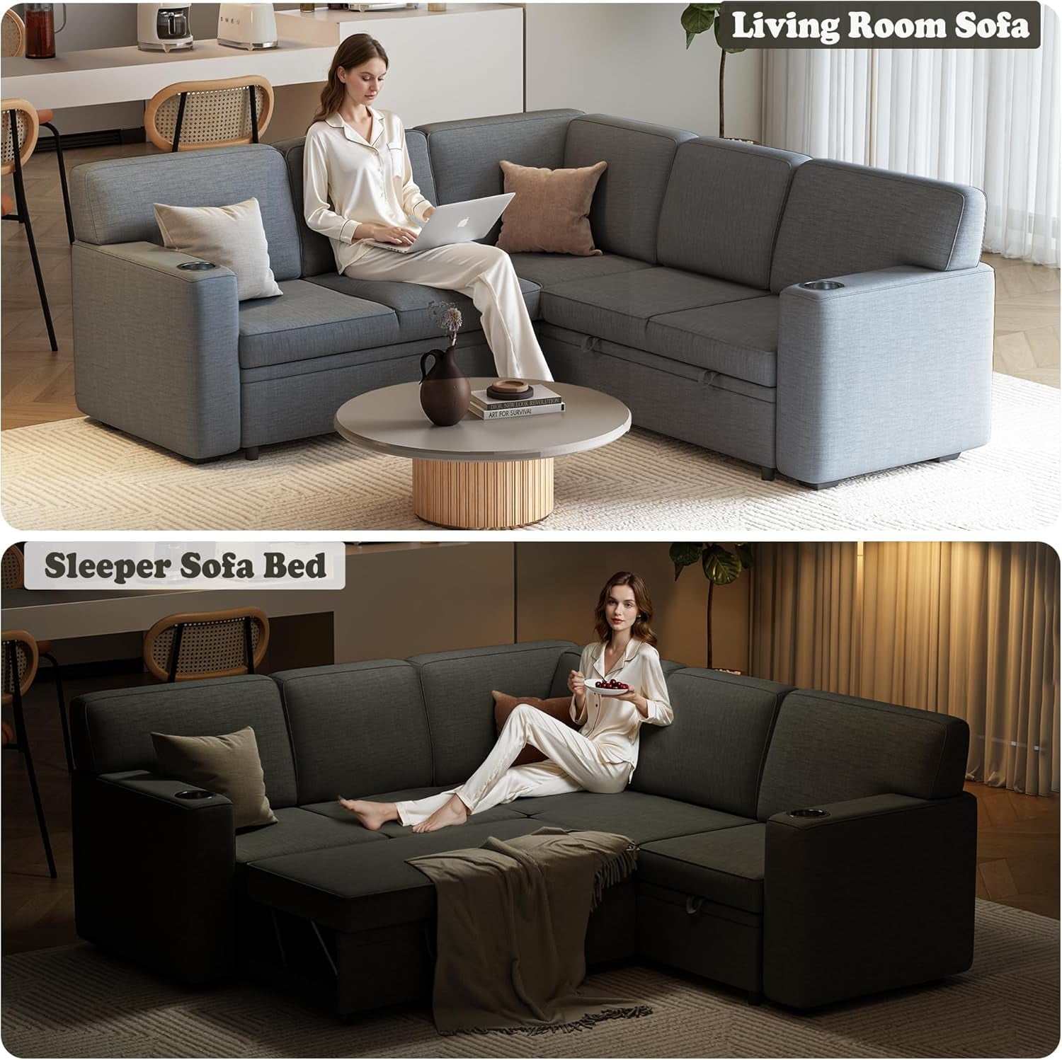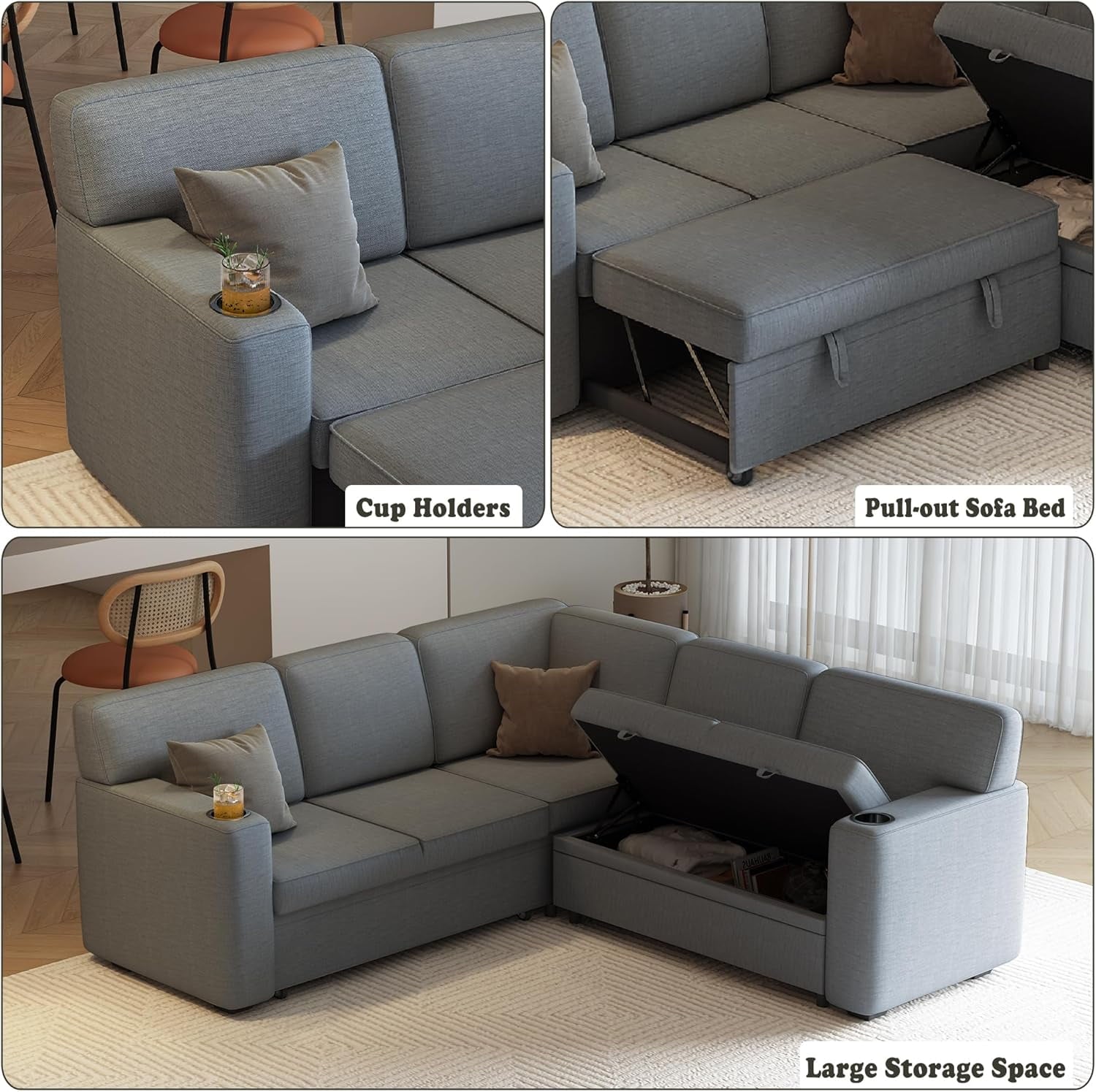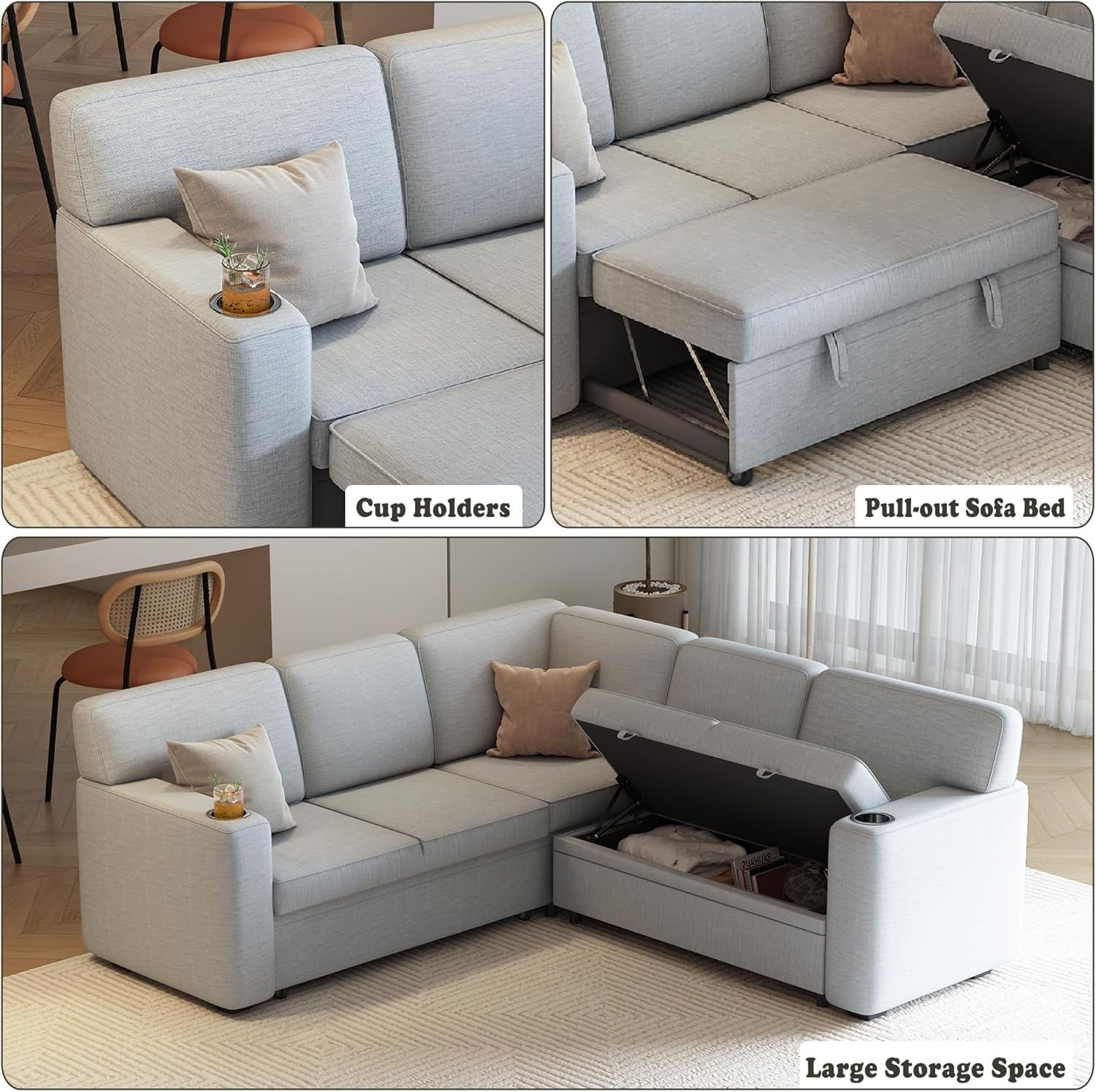 • 5-in-1 Modular Sleeper Sofa: Convert this L-shaped sectional from 5-seat couch to pull-out bed via hidden cord mechanism, maximizing space in small apartments and living rooms.