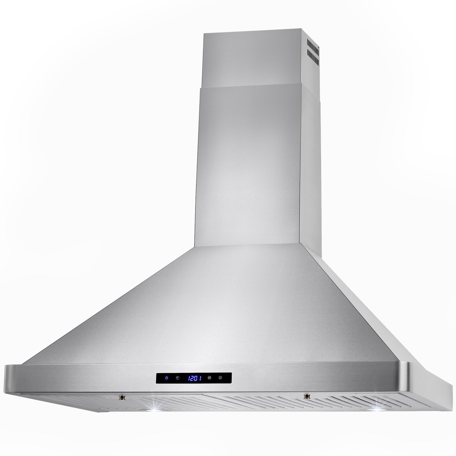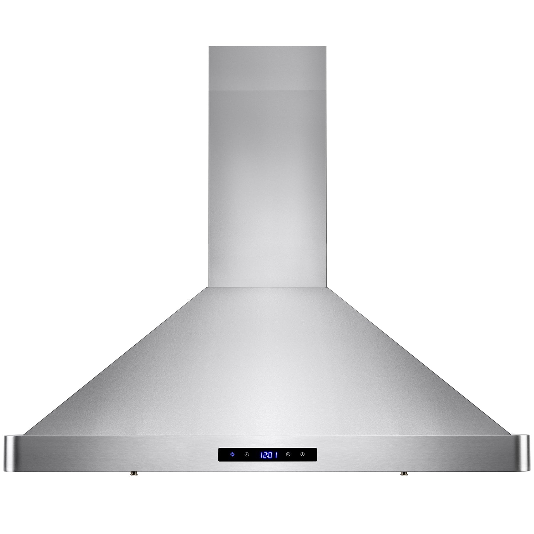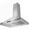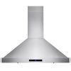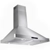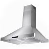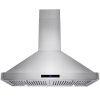 Sleek and beautiful, this classic AKDY 30” wall mount range hood defines contemporary expressions. Finished in stainless steel, a touch control panel in black lines the front of the hood and signifies which settings are on. The range hood gives you three fan speed options with suction of 343 CFM. Breathe easy knowing two stainless steel baffle filters collect oils and other cooking debris away from your stove top and away from your family. Two LED lights near each corner of the hood brighten your stove top for those late-night meals. For ductless recirculating installation, a carbon filter kit is available (sold separately: CF0011).