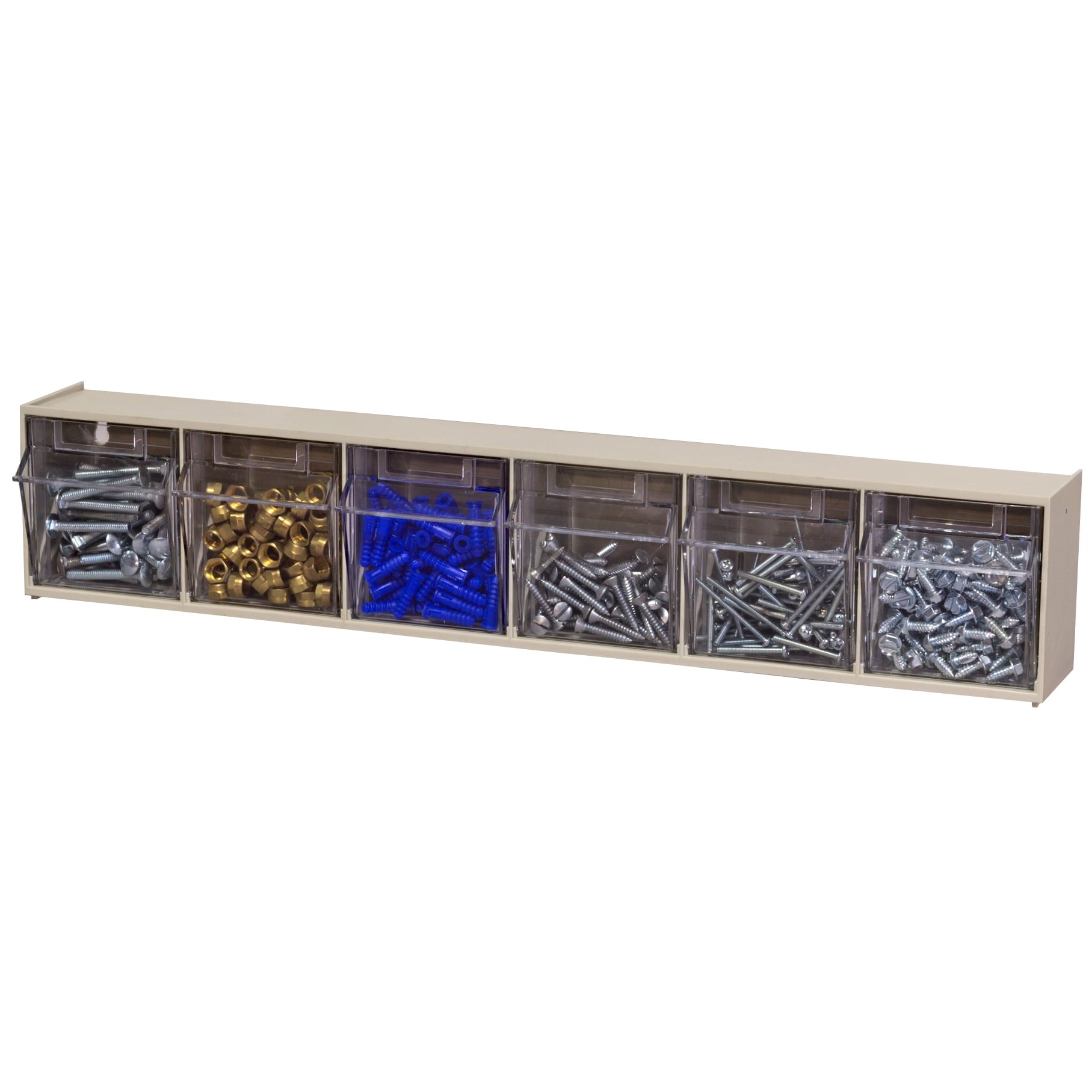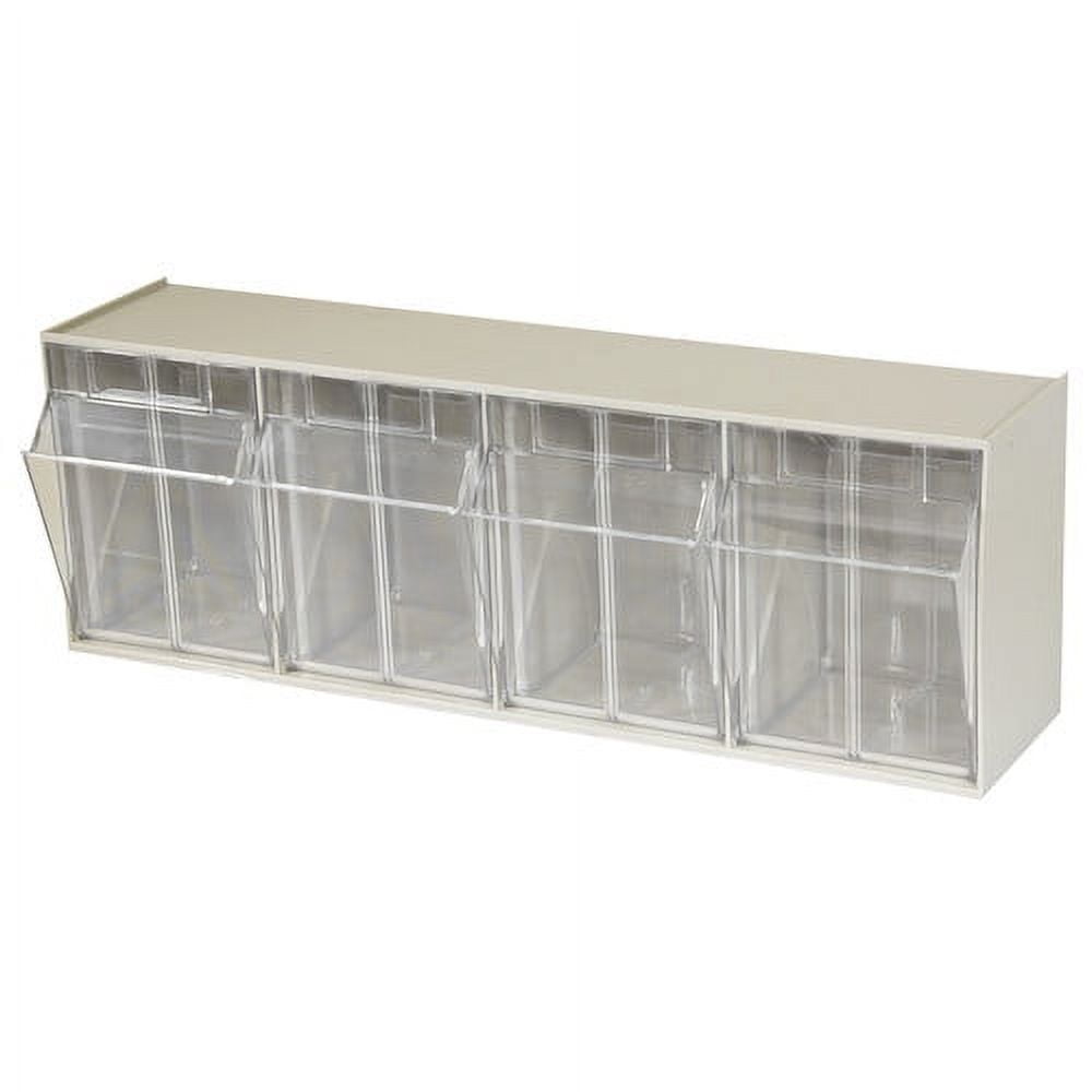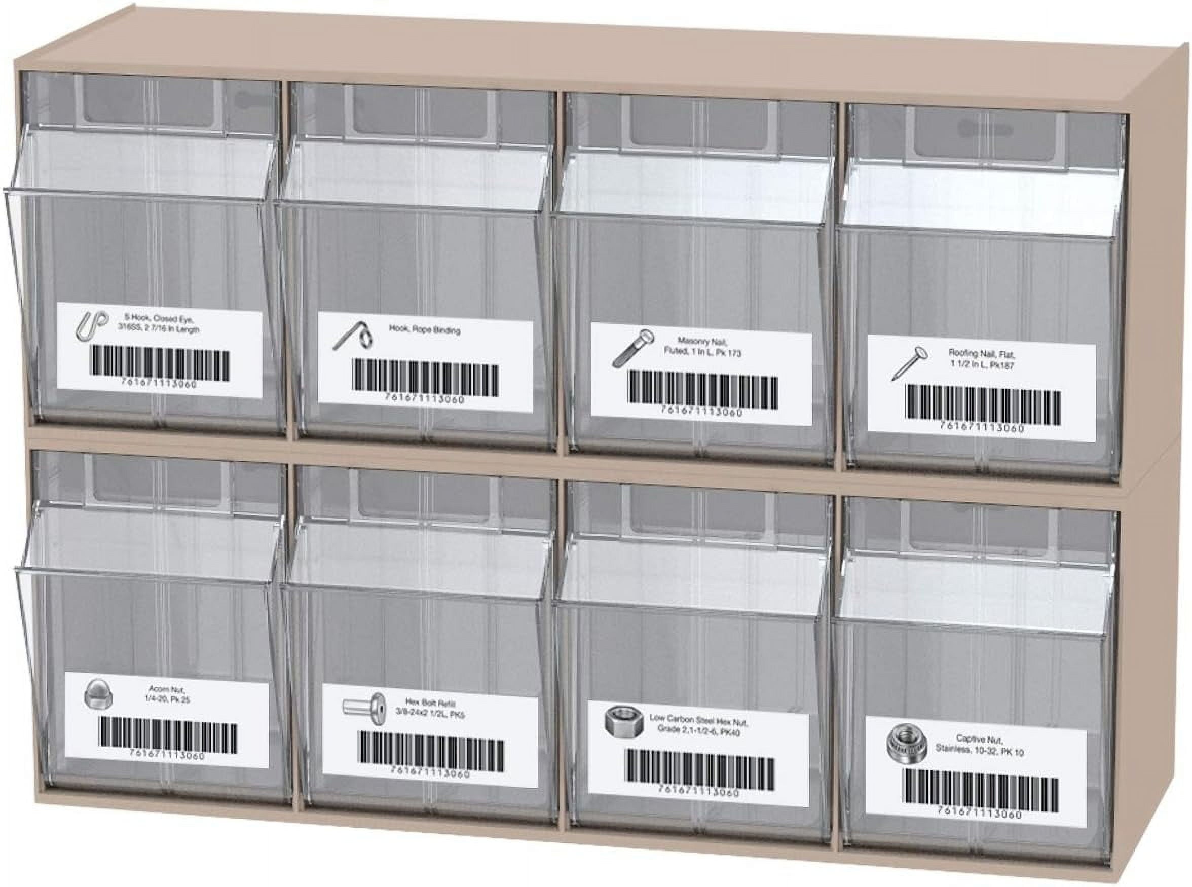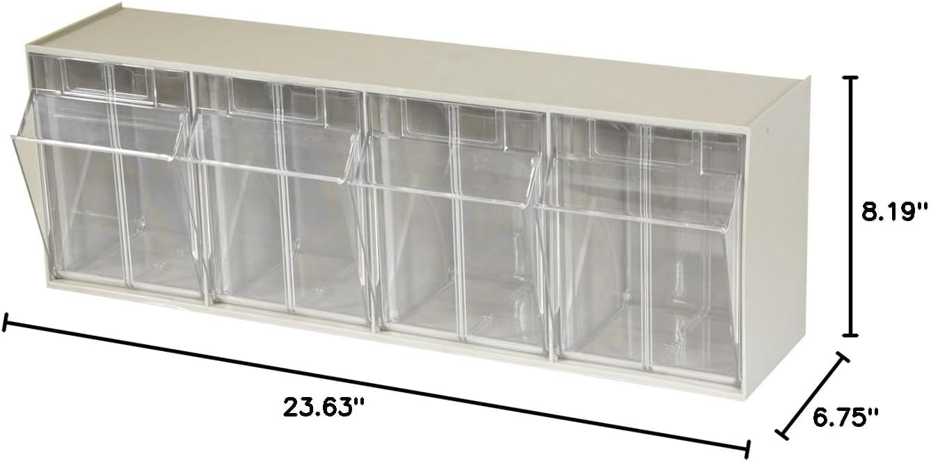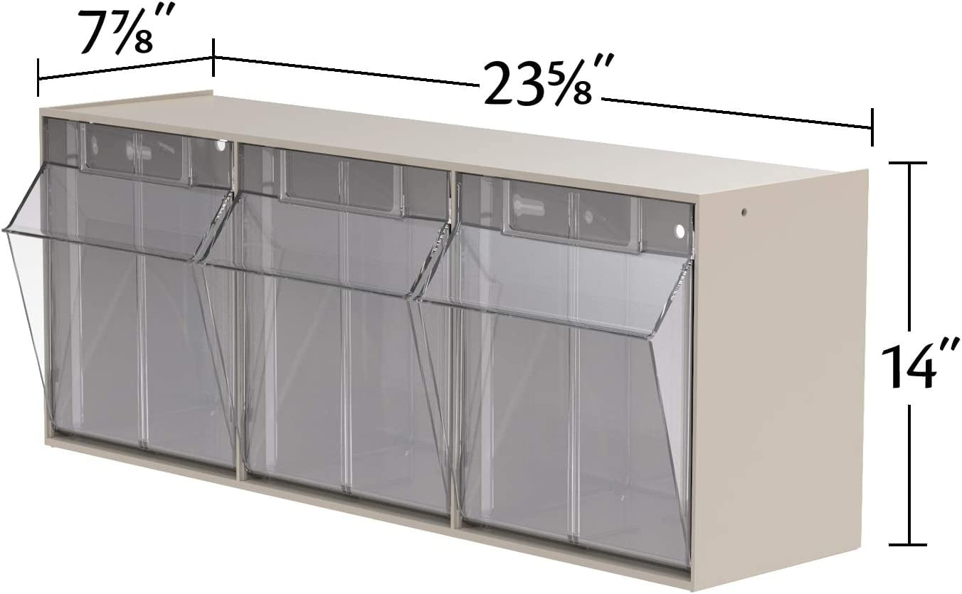Akro-Mils TiltView Storage System Cabinets with Tip Out Bins offer users an attractive space-saving system that will keep you organized. All TiltView Bin Cabinets are the same width, so cabinets can be stacked one above the other making a nice presentation. Use in a workshop, work van or retail store for parts storage and hardware organization, or a dental office to store dental burs and other tools. Perfect for organizing packets of coffee, tea supplies, and single servings of creamers, ketchup, and mustard. Put several TiltView Cabinets together to create an attractive display for hardware, handles and plumbing fixtures, or in your pantry filled with beans, rice, nuts, dried fruit, etc. The removable crystal-clear bin cups allow quick contents identification and close securely for dust protection. Can sit on a desk or be mounted on a wall. Each bin unit comes with card stock labels to identify the contents.TiltView 06702