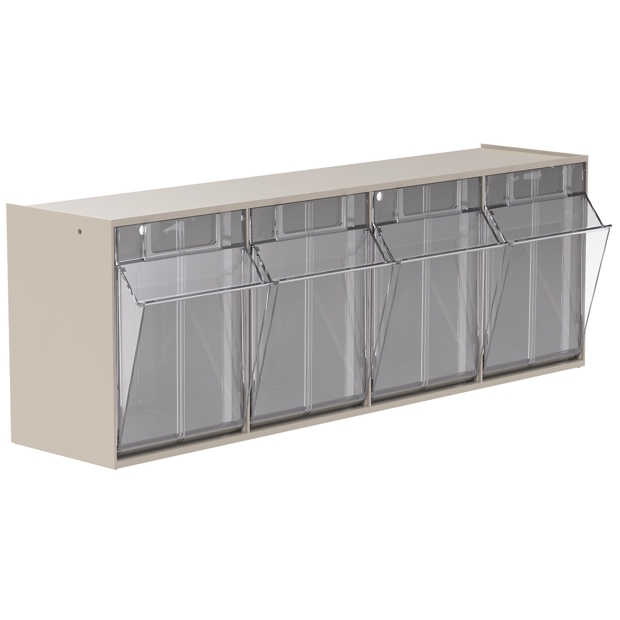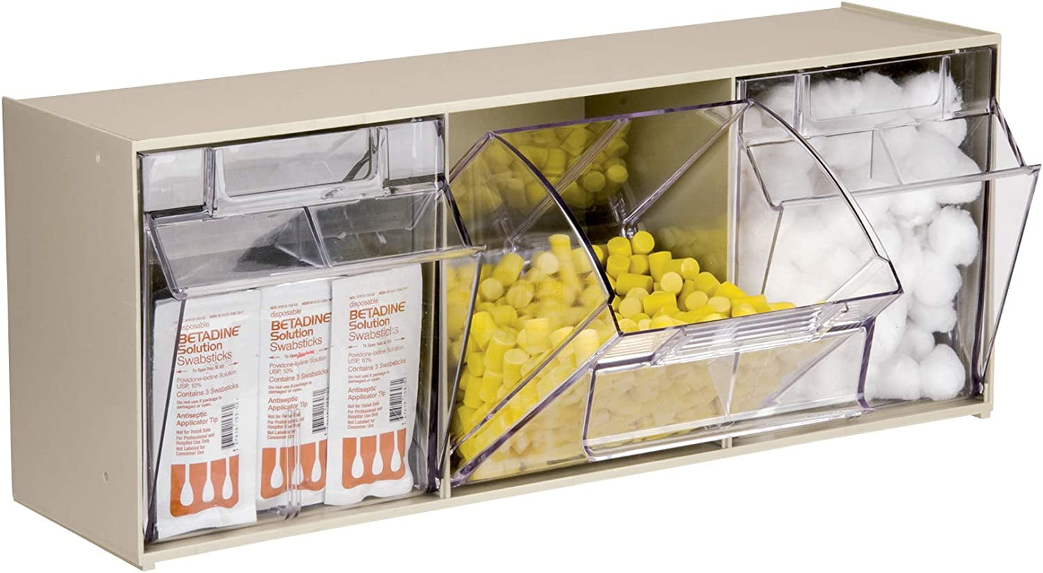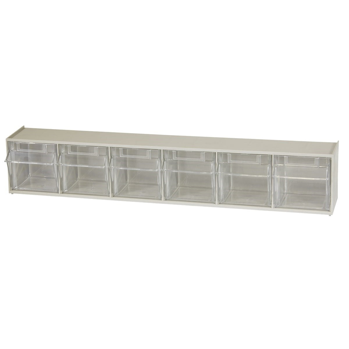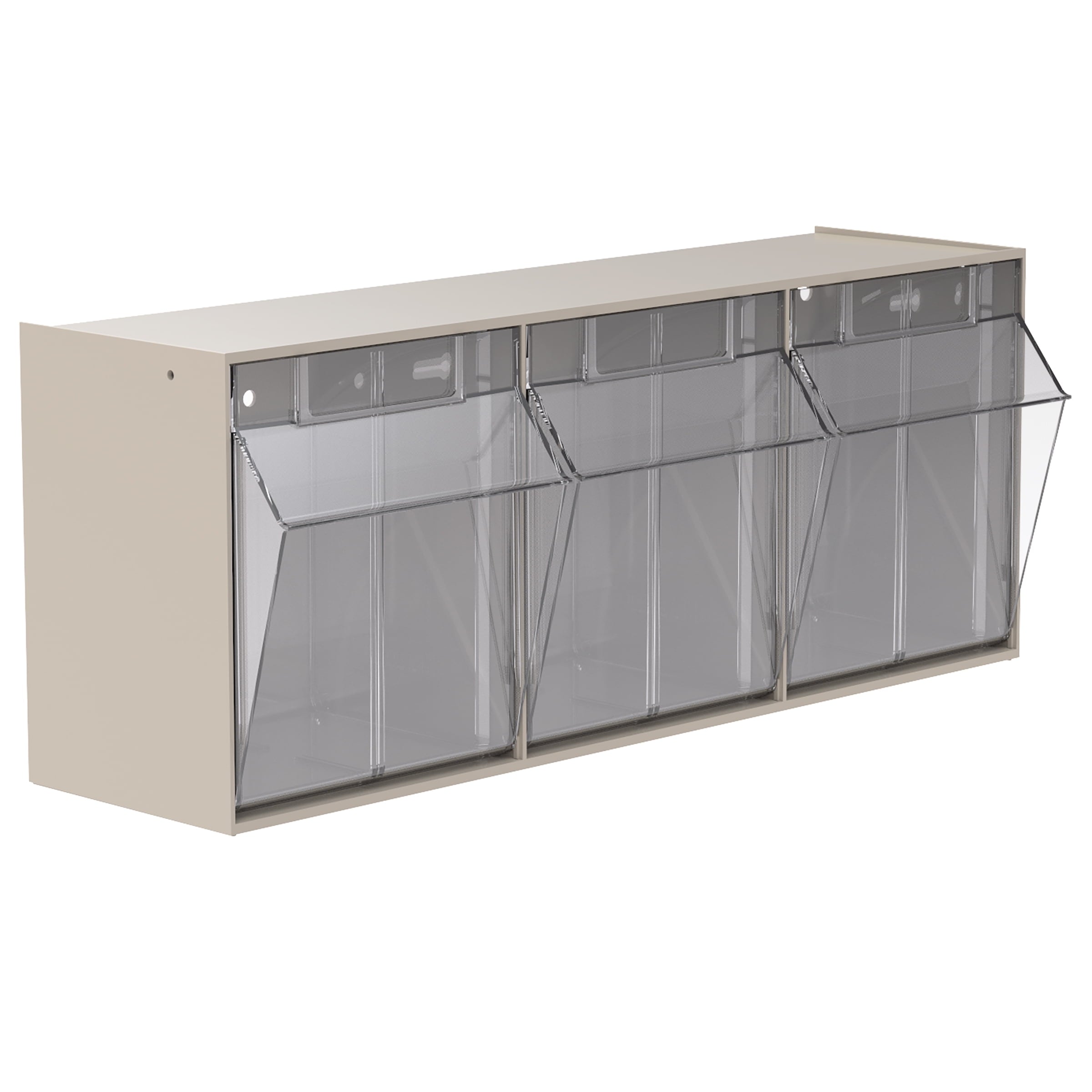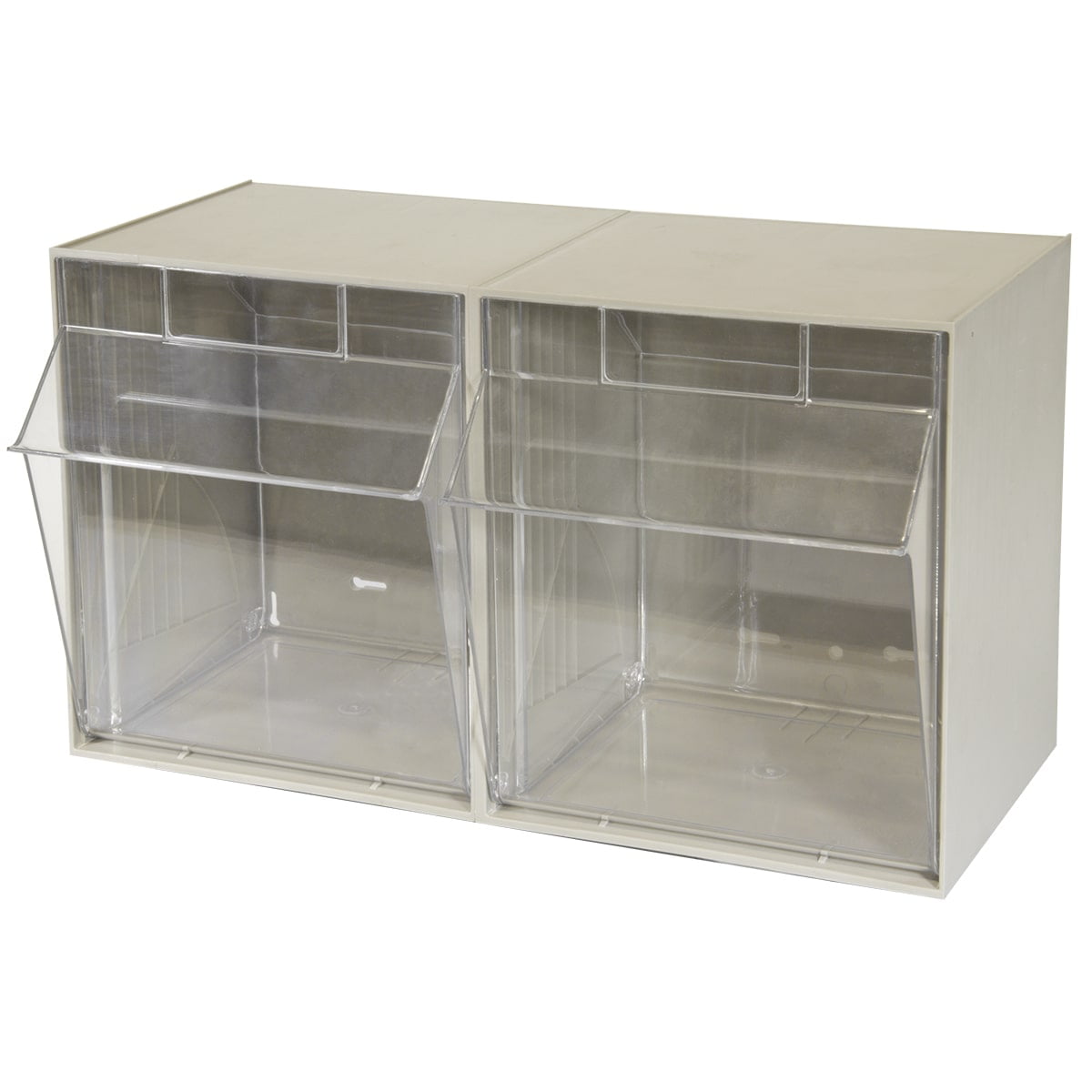 Akro-Mils TiltView Storage System Cabinets with Tip Out Bins offer users an attractive space-saving system that will keep you organized. All TiltView Bin Cabinets are the same width, so cabinets can be stacked one above the other making a nice presentation. Use in a workshop, work van or retail store for parts storage and hardware organization, or a dental office to store dental burs and other tools. Perfect for organizing packets of coffee, tea supplies, and single servings of creamers, ketchup, and mustard. Put several TiltView Cabinets together to create an attractive display for hardware, handles and plumbing fixtures, or in your pantry filled with beans, rice, nuts, dried fruit, etc. The removable crystal-clear bin cups allow quick contents identification and close securely for dust protection. Can sit on a desk or be mounted on a wall. Each bin unit comes with card stock labels to identify the contents.TiltView 06702