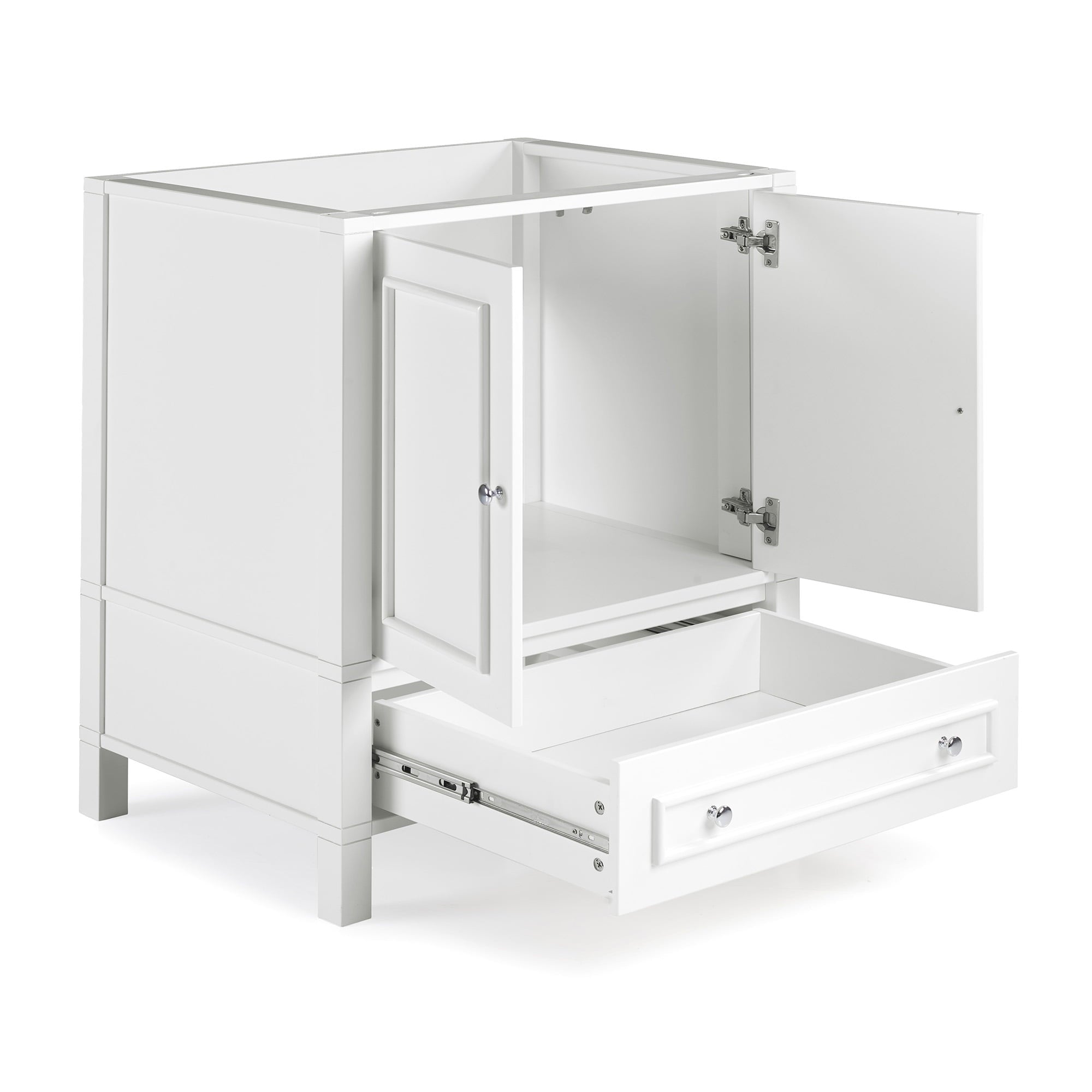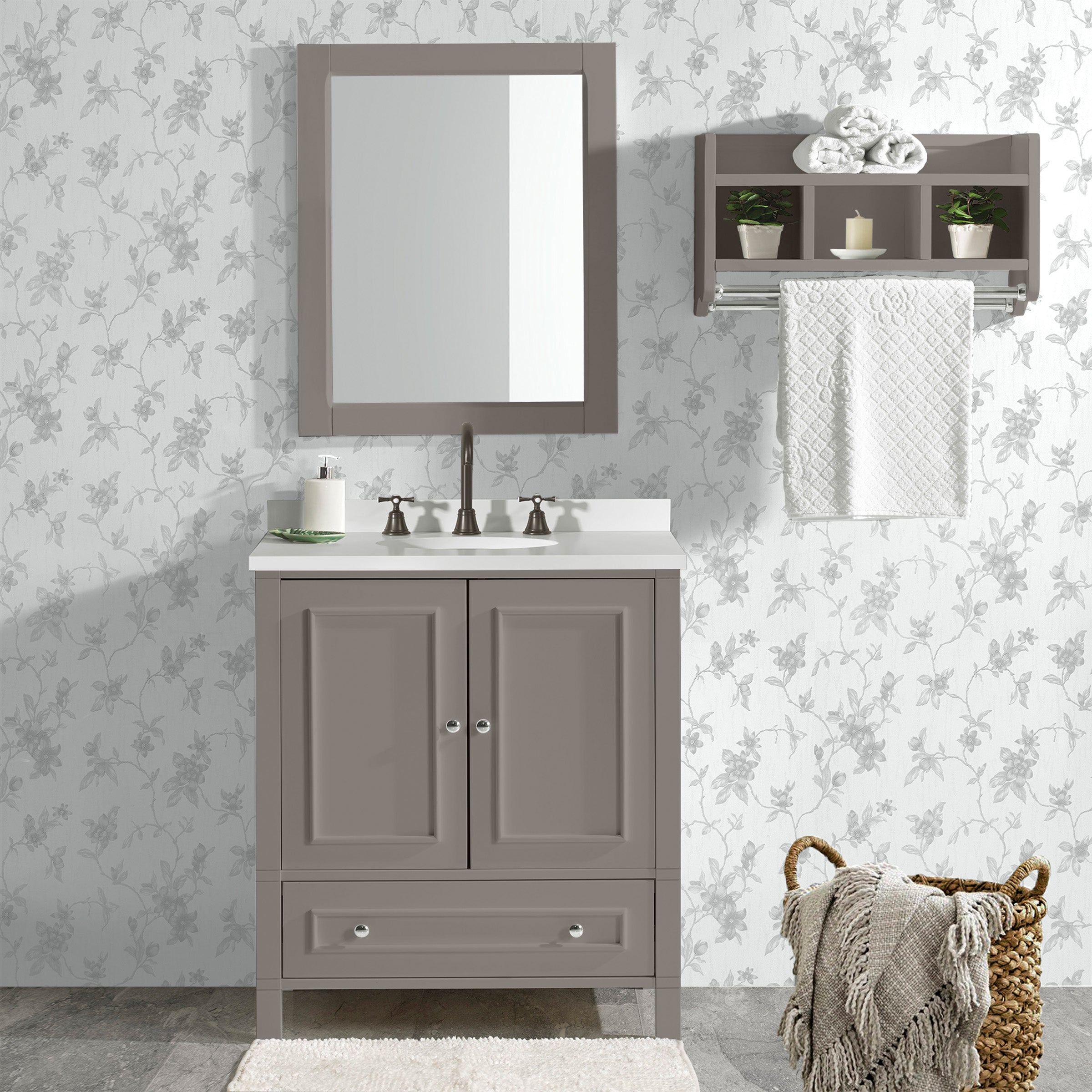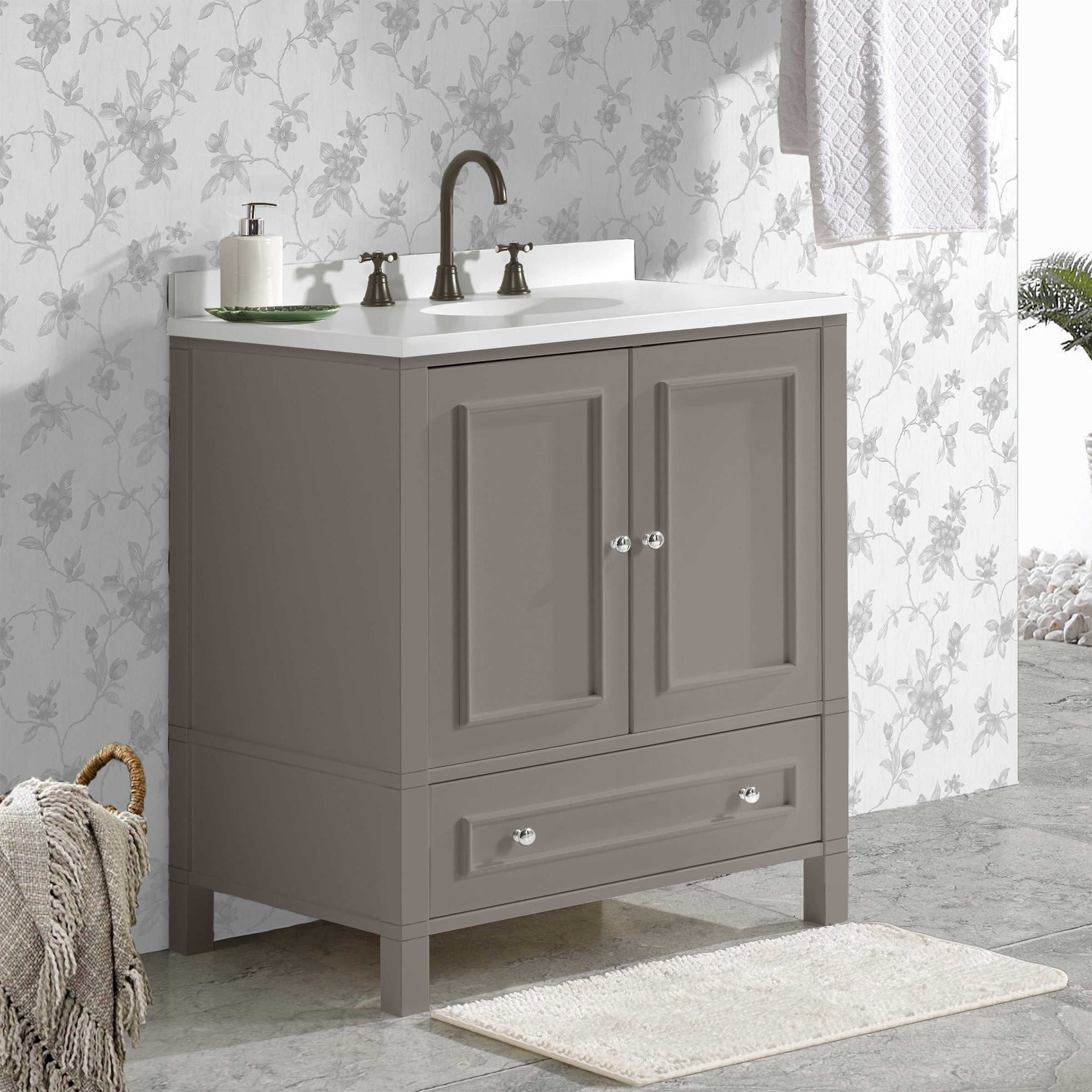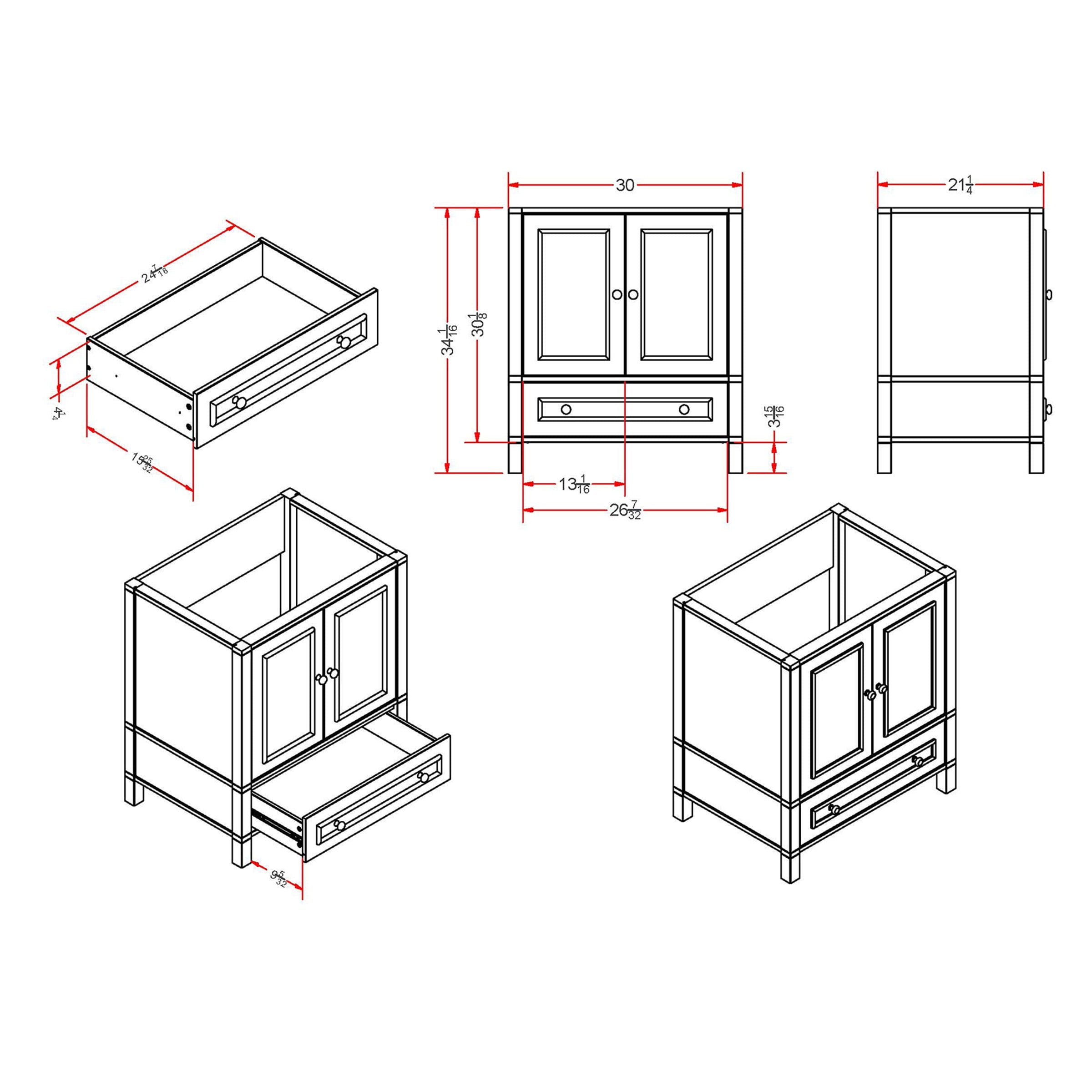 Update your bathroom with the detailed elegance of the Williamsburg 30” Bathroom Sink Vanity by Alaterre Furniture. Constructed from solid pine wood and composite wood, this small gray vanity features soft-close doors, a large bottom drawer, nickel hardware, and adjustable height levelers for stable installation. The modern bathroom vanity accommodates a 31-inch-wide by 22-inch-deep top with 1 center-set sink basin; the top and sink are not included, allowing you to choose the style that best matches your décor. The Williamsburg Collection from Alaterre Furniture features premium quality solid wood bathroom vanities that can be self-assembled using the included manual or by referring to our helpful assembly videos.