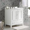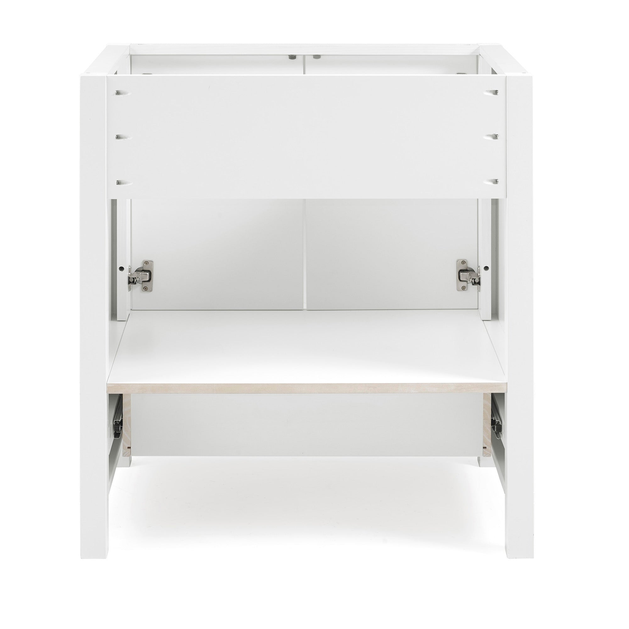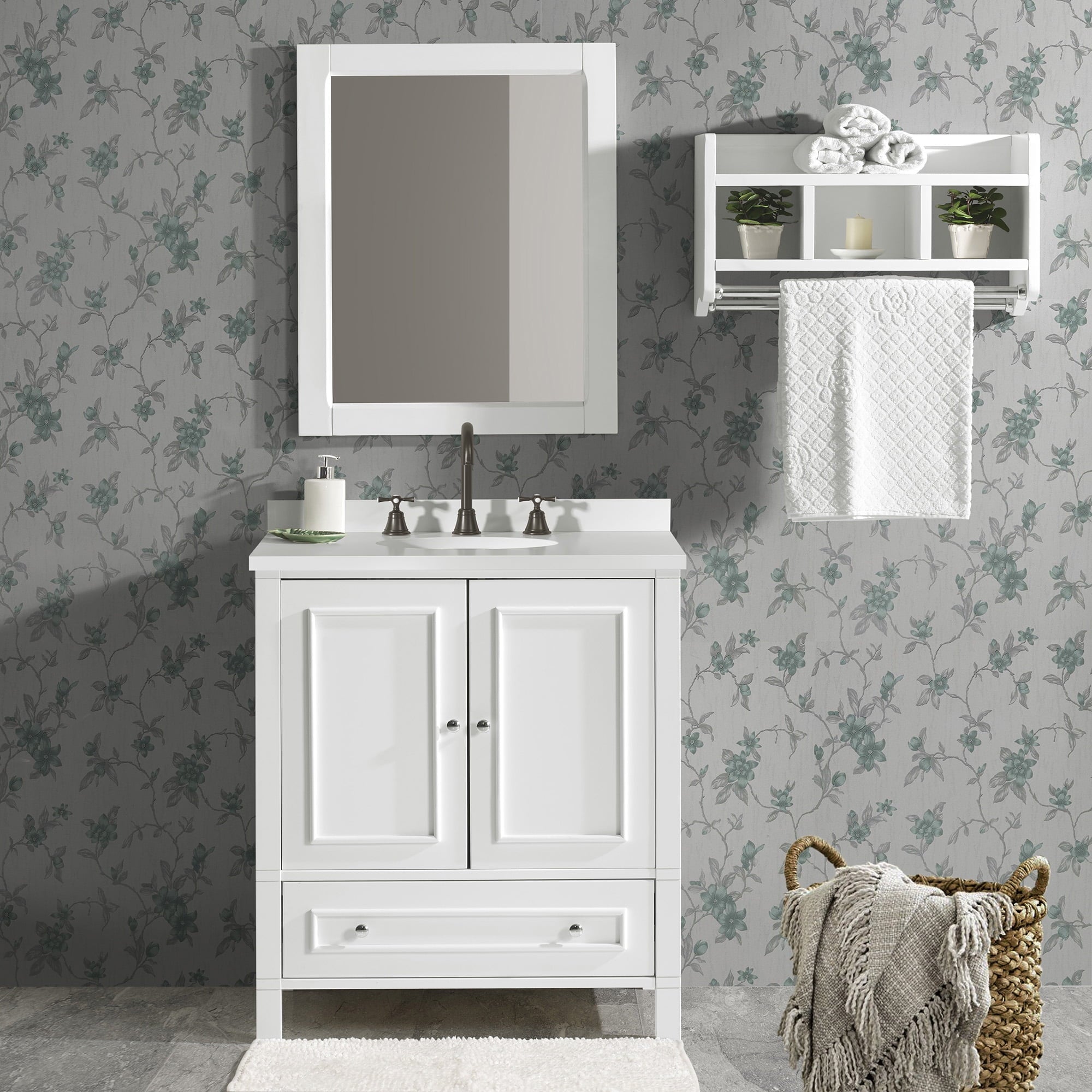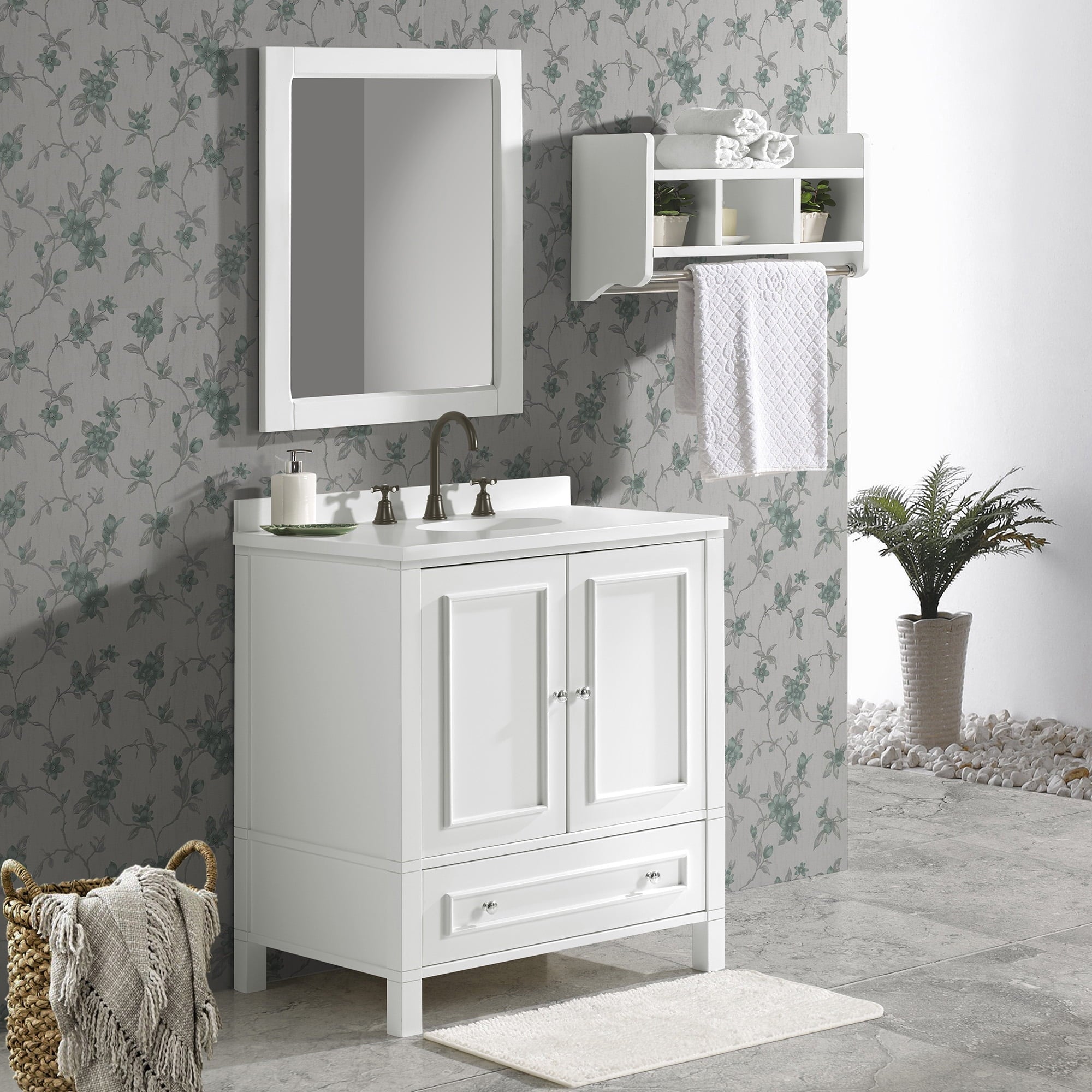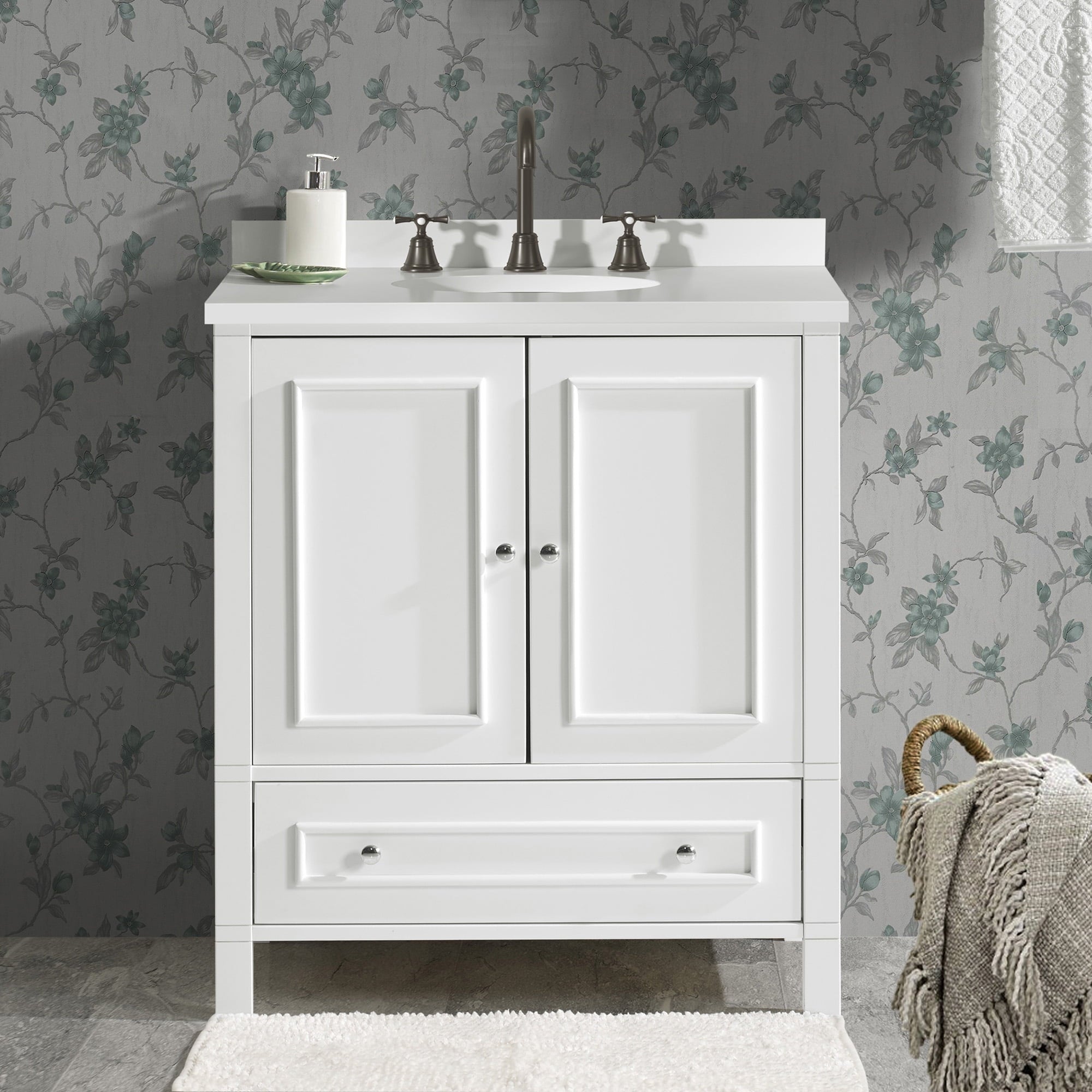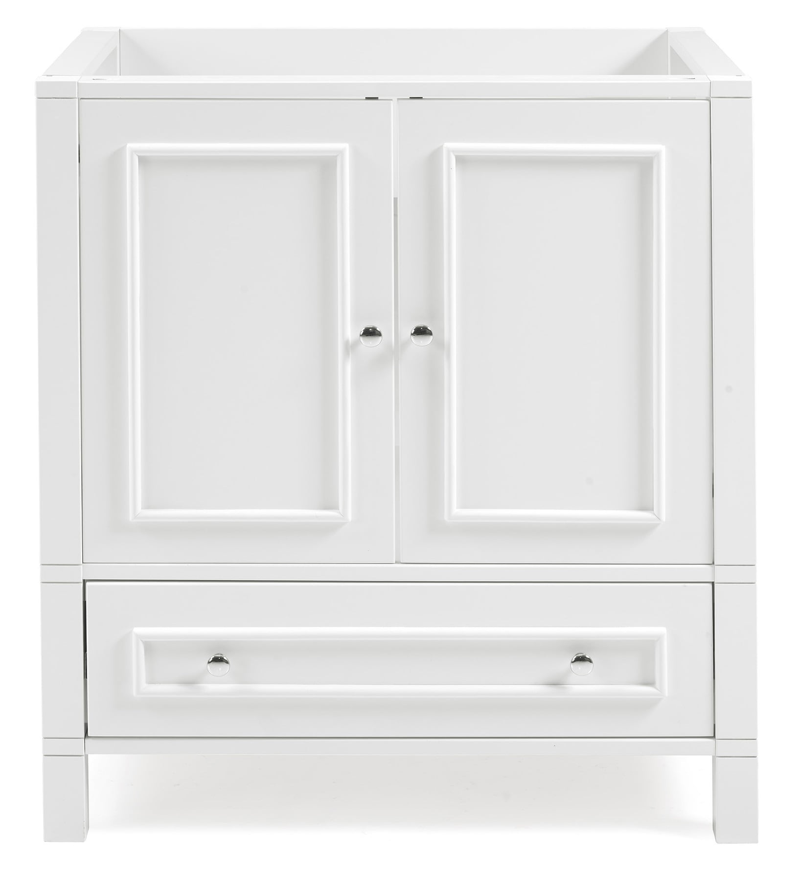 Update your bathroom with the detailed elegance of the Williamsburg 30” Bathroom Sink Vanity by Alaterre Furniture. Constructed from solid pine wood and composite wood, this small gray vanity features soft-close doors, a large bottom drawer, nickel hardware, and adjustable height levelers for stable installation. The modern bathroom vanity accommodates a 31-inch-wide by 22-inch-deep top with 1 center-set sink basin; the top and sink are not included, allowing you to choose the style that best matches your décor. The Williamsburg Collection from Alaterre Furniture features premium quality solid wood bathroom vanities that can be self-assembled using the included manual or by referring to our helpful assembly videos.
