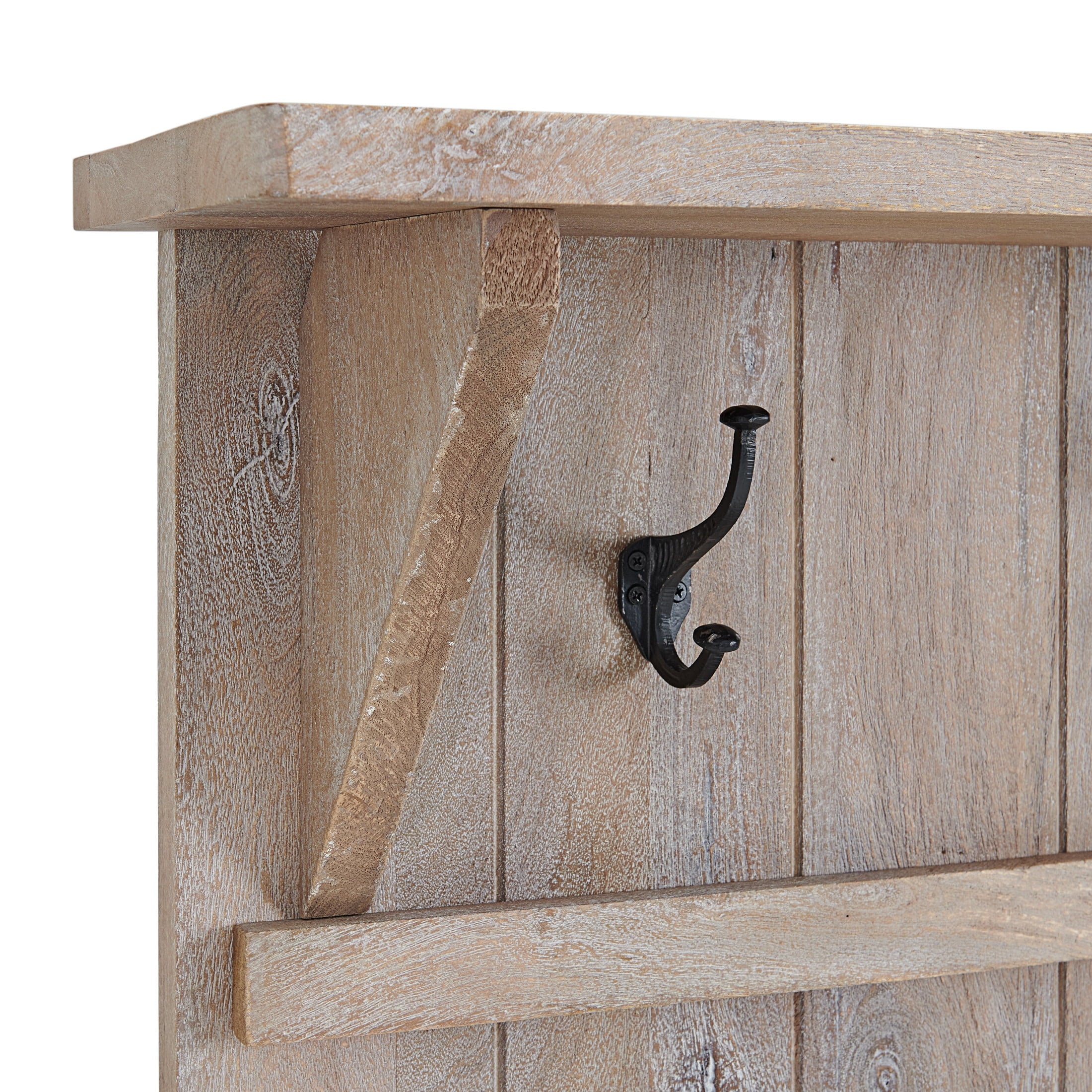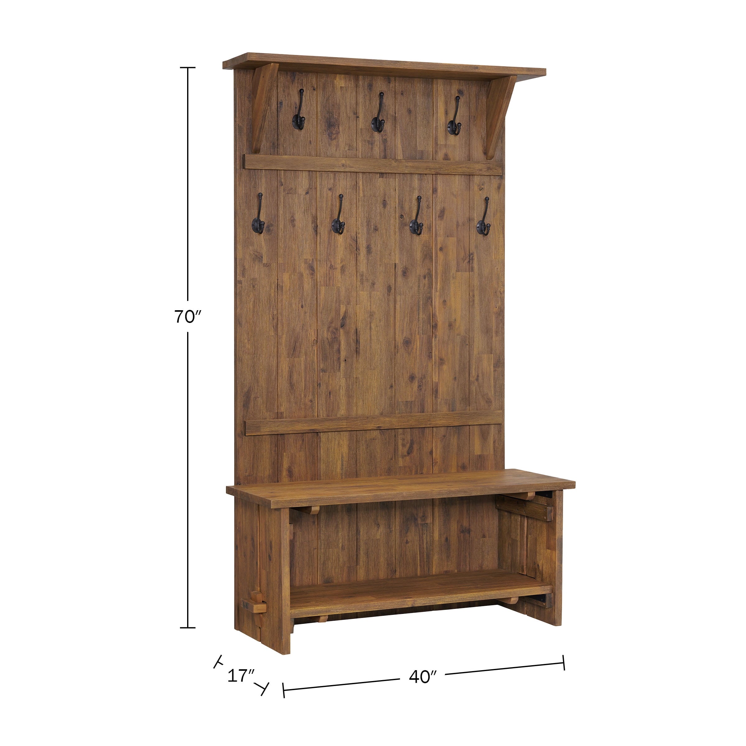 Organize your entryway, mudroom or living space with this gorgeous mango wood hall tree. The hall tree is both beautiful and functional, providing ample storage and style for your home’s entryway or hallway. This hall tree has a minimalist look made from solid mango wood. The driftwood stain highlights the subtle imperfections such as knots and cracks that are part of the wood’s character. This versatile piece features a bench for you to comfortably sit and take off your shoes for storing on the shelf underneath. A large upper shelf allows you to display hats or other items, while the seven metal coat hooks provide enough space for neatly hanging your jackets, scarves, umbrellas, or handbags.