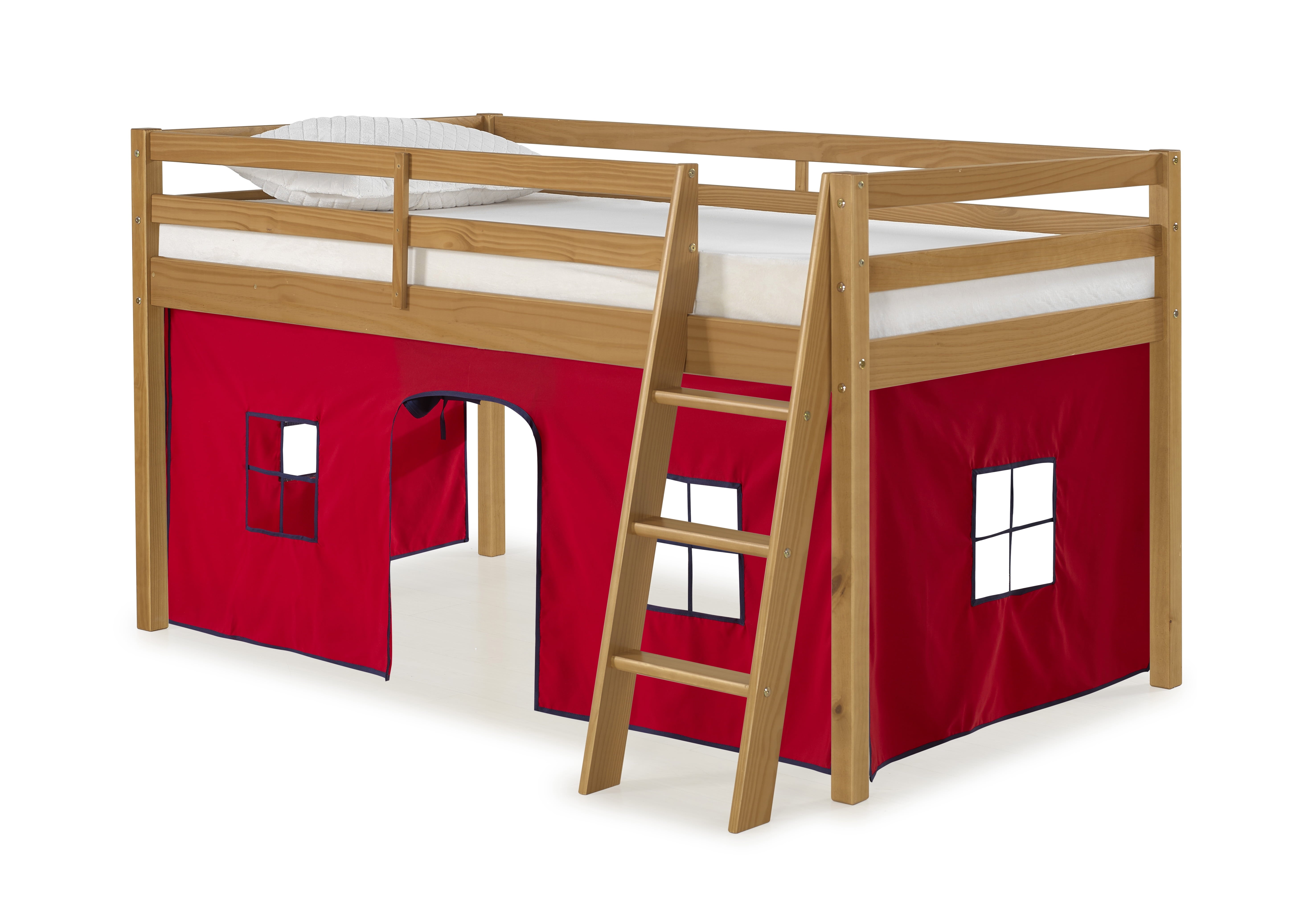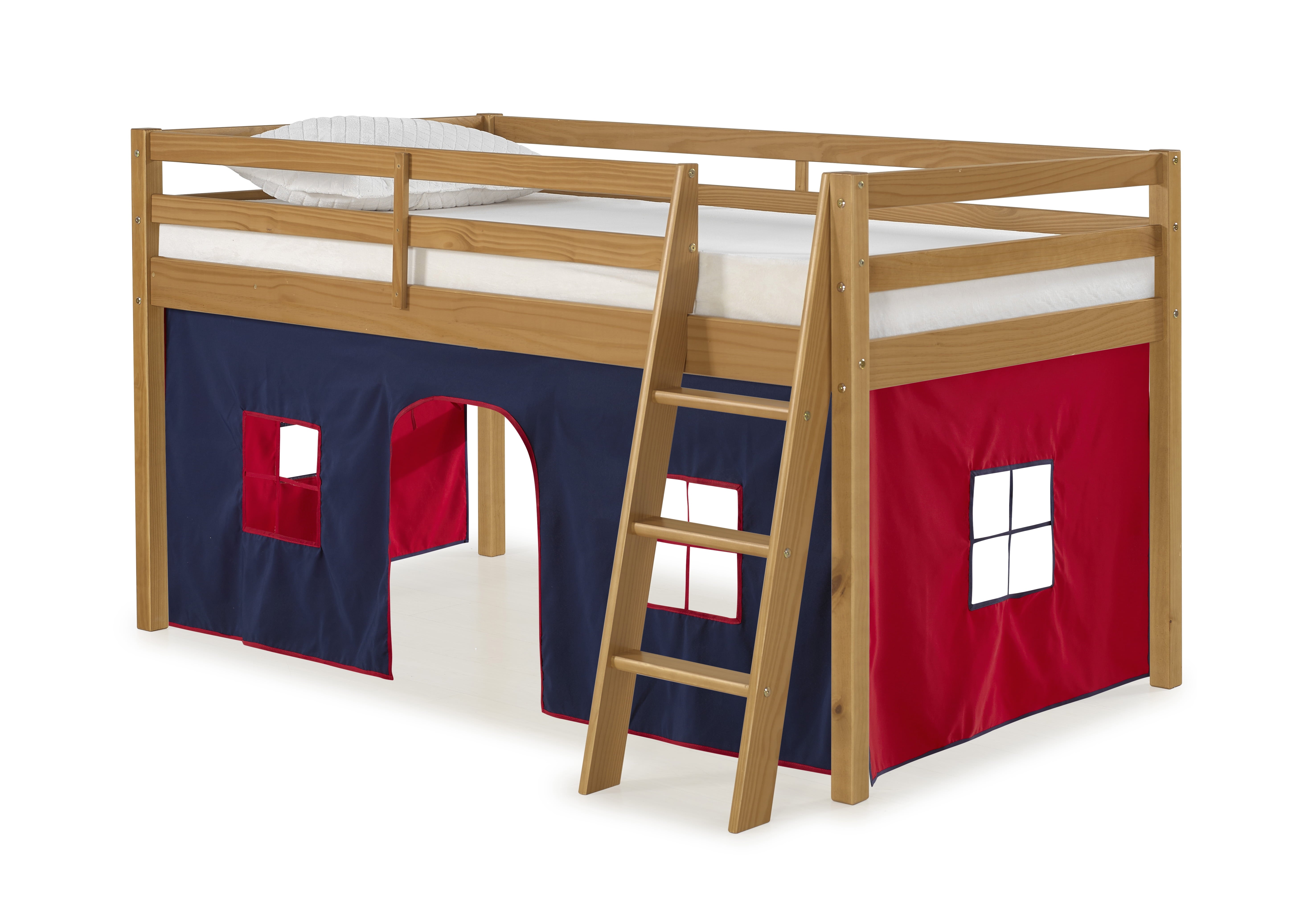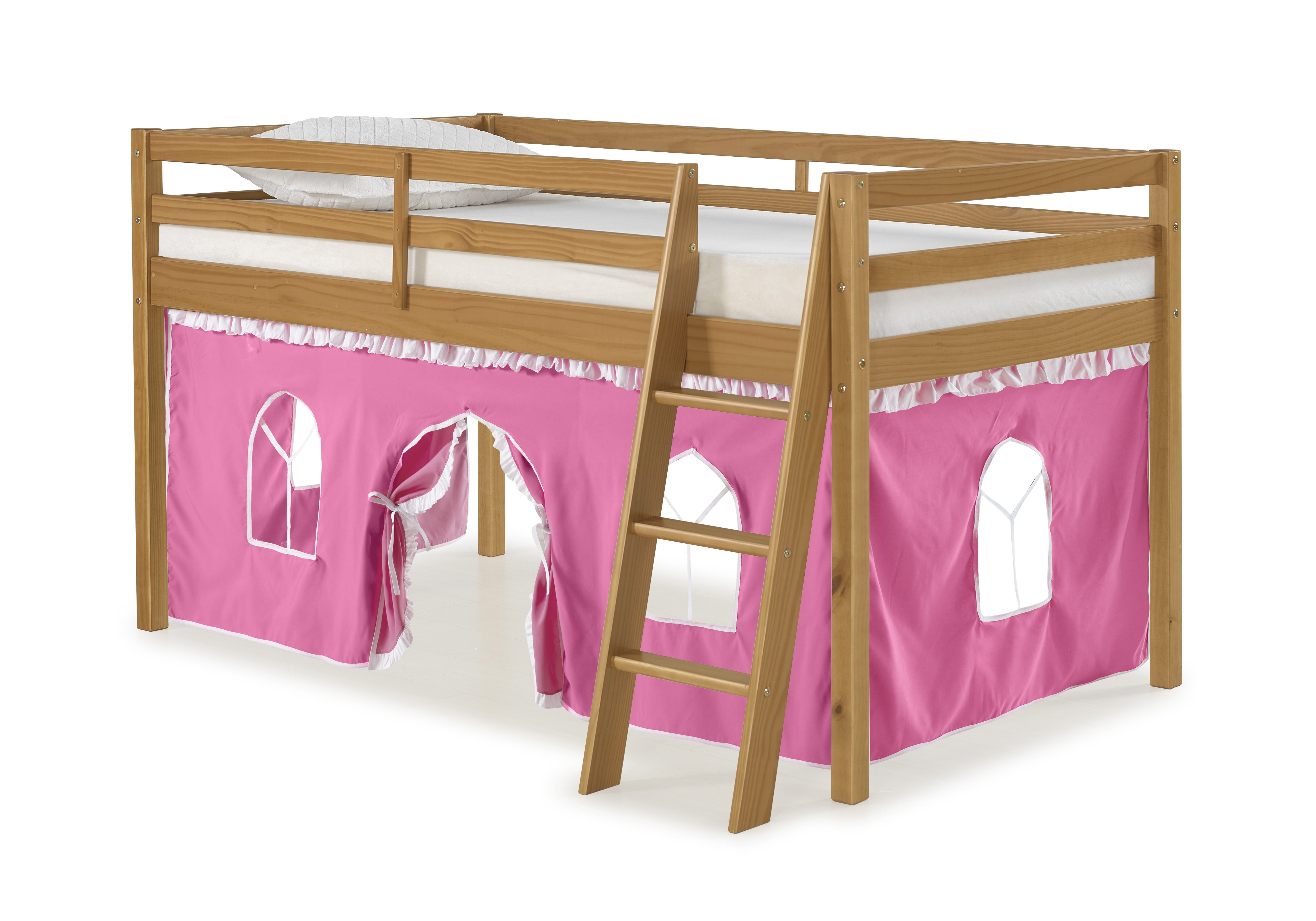 Roxy Junior Loft with Playhouse Tent gives your child a fun place to play, sleep and dream. The under-bed playhouse area is a great spot to curl up and read a book, set up a house, be the queen of their castle, or be the superhero that saves the day. Pine construction with 100% polyester fabric tent. Mattresses can be put directly on the included slats or be used with a bunky board. This is a junior loft bed for one twin mattress. Top of guardrail / bed ends must be 5″ above the top of the mattress. On this bed the combined thickness of mattress and foundation (if a Bunkie board is used, not needed) can not exceed 8″.