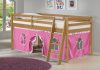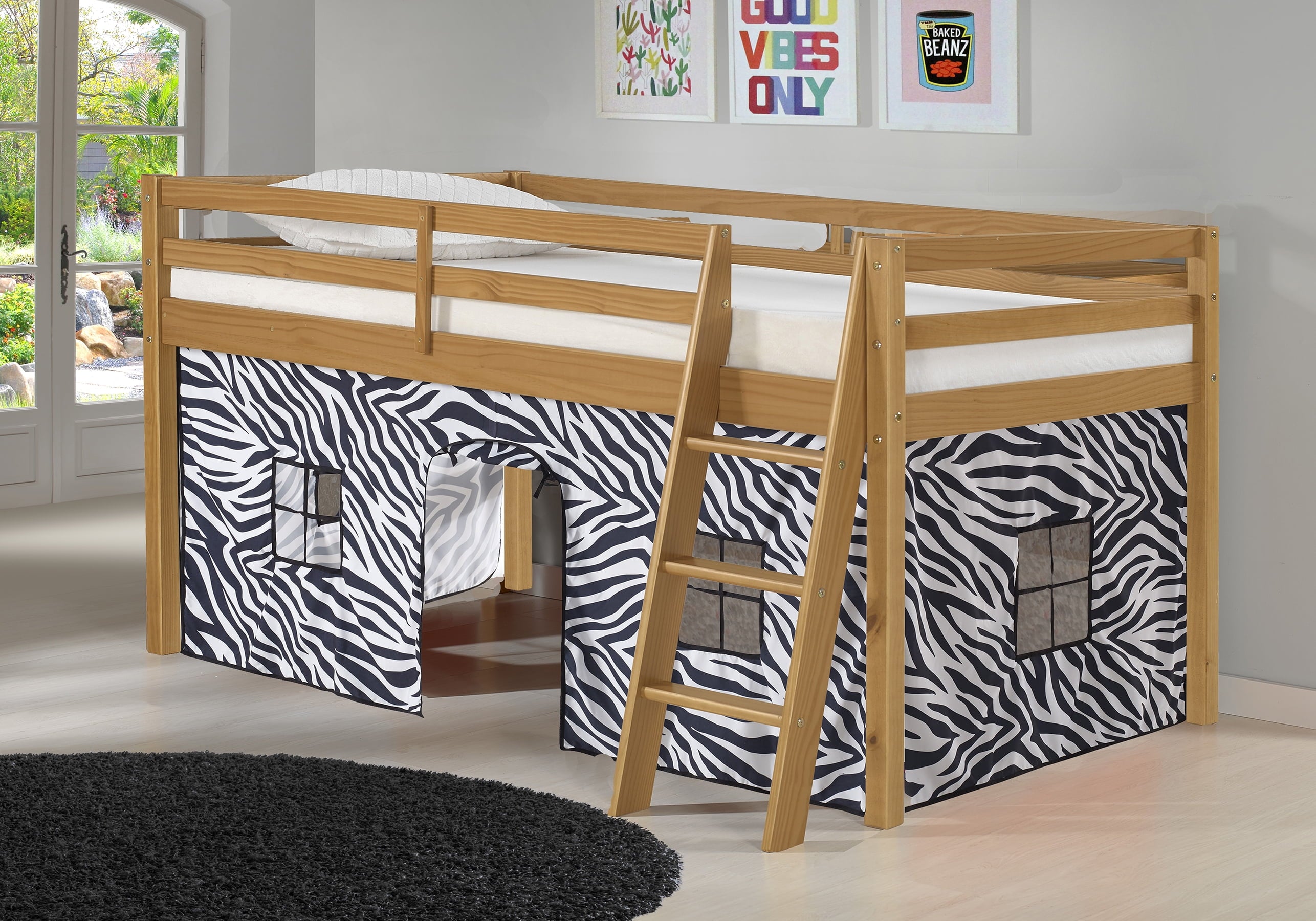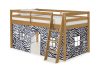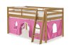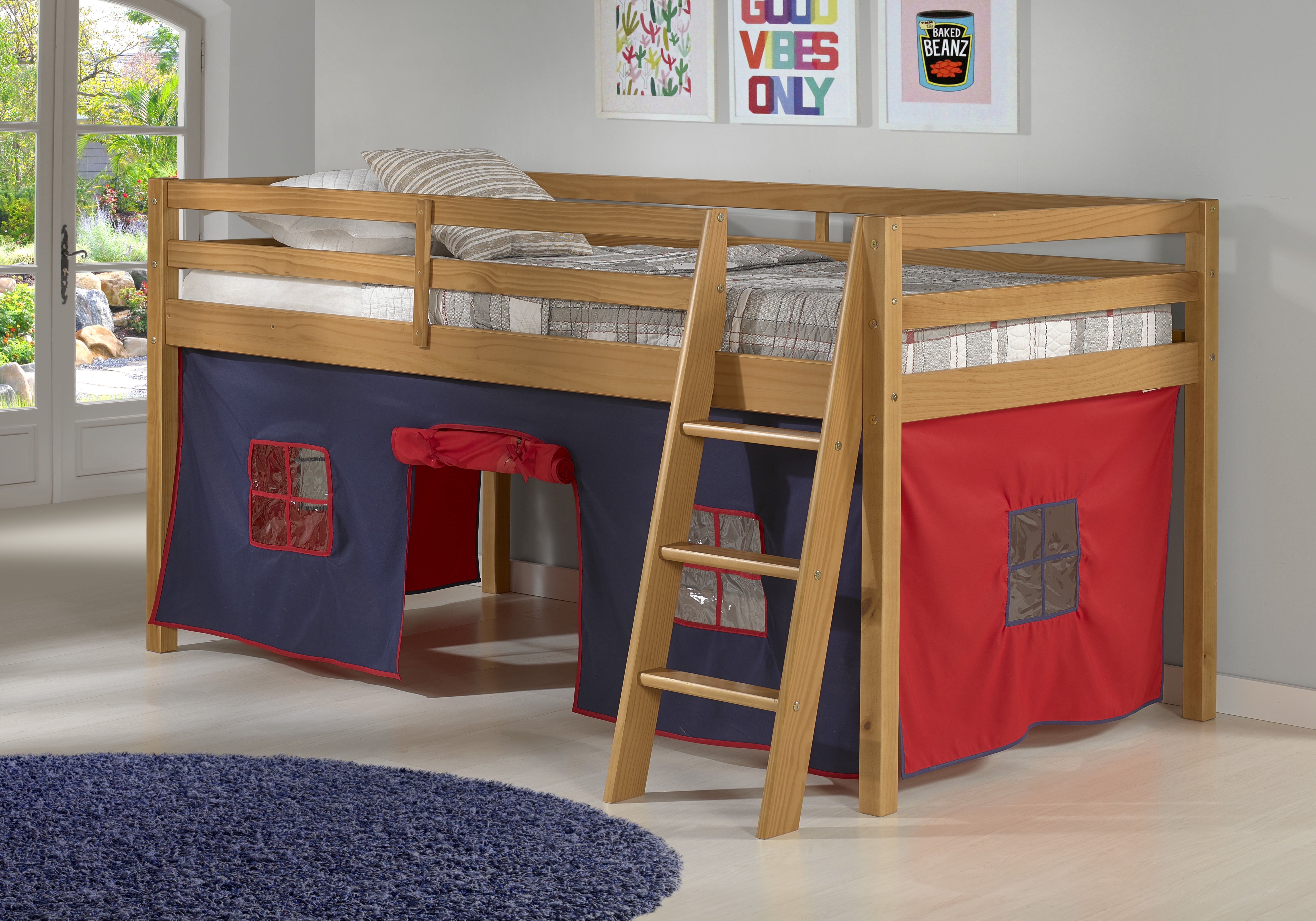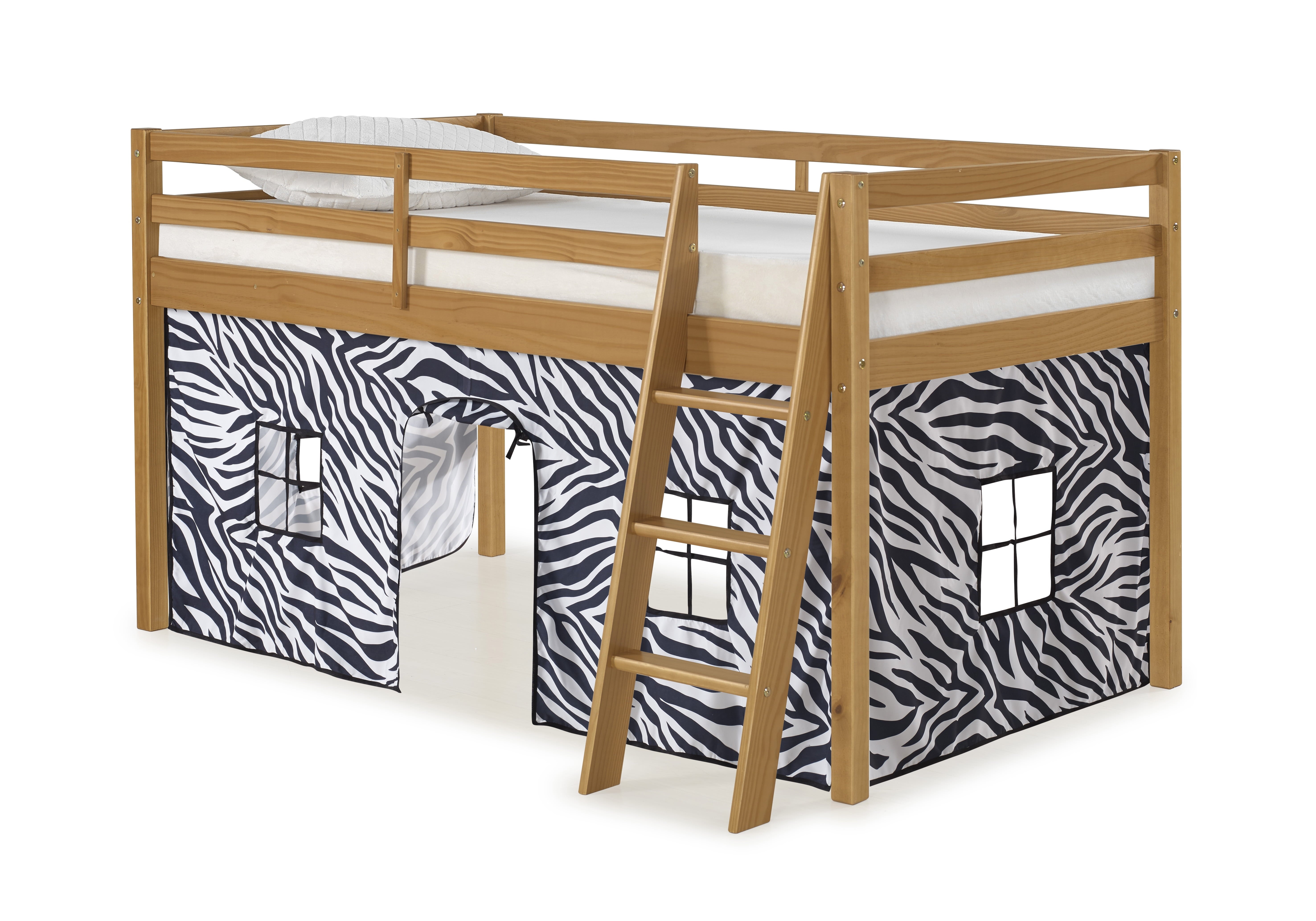 Roxy Junior Loft with Playhouse Tent gives your child a fun place to play, sleep and dream. The under-bed playhouse area is a great spot to curl up and read a book, set up a house, be the queen of their castle, or be the superhero that saves the day. Pine construction with 100% polyester fabric tent. Mattresses can be put directly on the included slats or be used with a bunky board. This is a junior loft bed for one twin mattress. Top of guardrail / bed ends must be 5″ above the top of the mattress. On this bed the combined thickness of mattress and foundation (if a Bunkie board is used, not needed) can not exceed 8″.