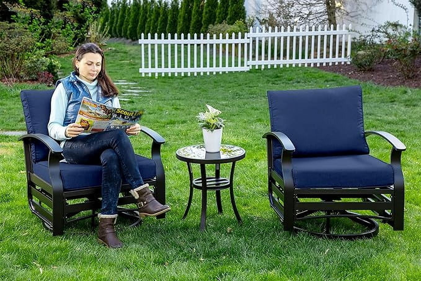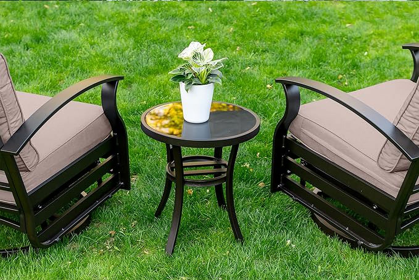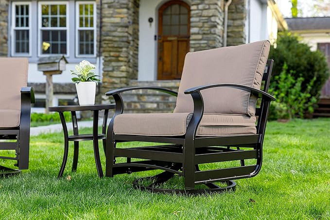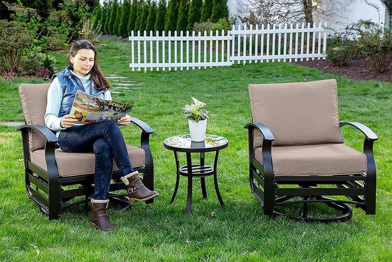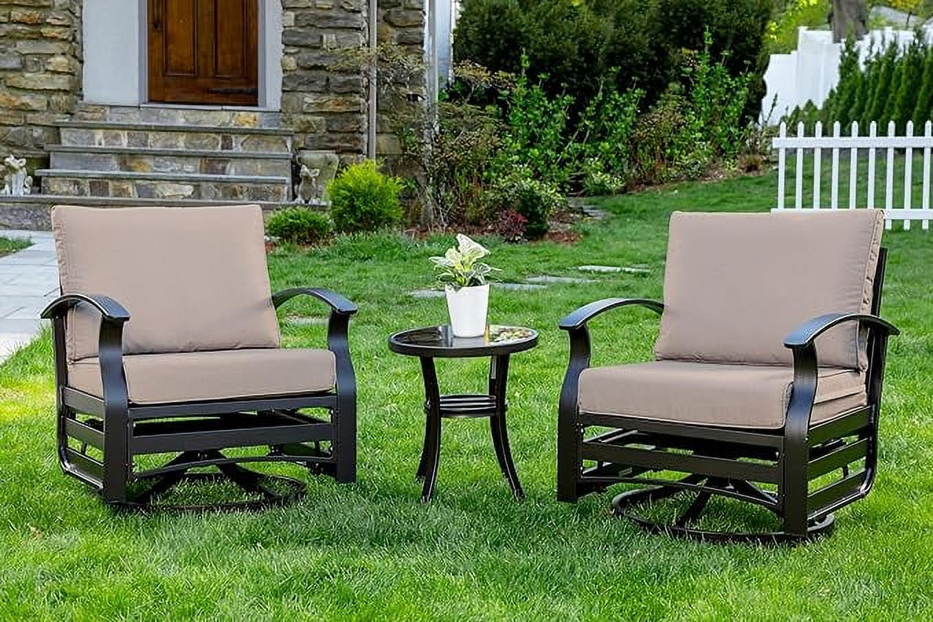 Home Outdoor Conversation Sets ALAULM 3 Piece Patio Outdoor Aluminum Metal Swivel Rocking Chair with 1 Coffee Table and 2 Khaki Padded Cushions Outdoor Metal Swivel Rocking Chair Furniture Conversation Set for Porch Garden
