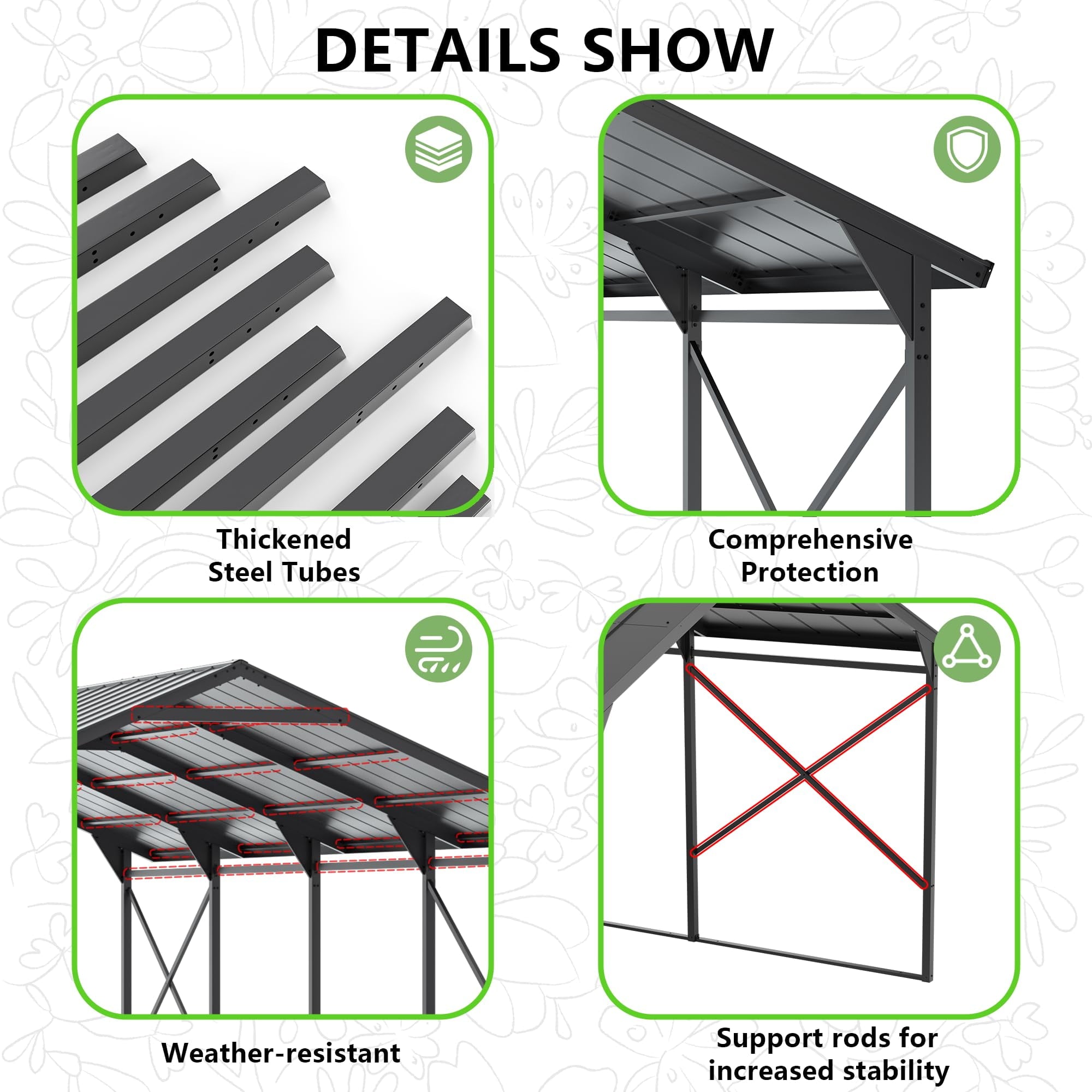 Elevate your outdoor space with this durable and versatile metal carport from ALAULM. Crafted with a heavy galvanized frame and a sturdy metal roof, this carport offers reliable protection against harsh weather conditions, including strong winds, heavy rain, and snowfall. Its convenient installation with threaded pipes makes it easy to set up, allowing you to quickly enjoy the benefits of a covered outdoor area. Whether you need a sheltered space for your vehicles, boats, or want to create an inviting gathering spot for family and friends, this 12×22 foot carport is the perfect solution. With detailed instructions and customer support, you can trust in a smooth and satisfying ownership experience.