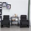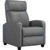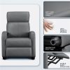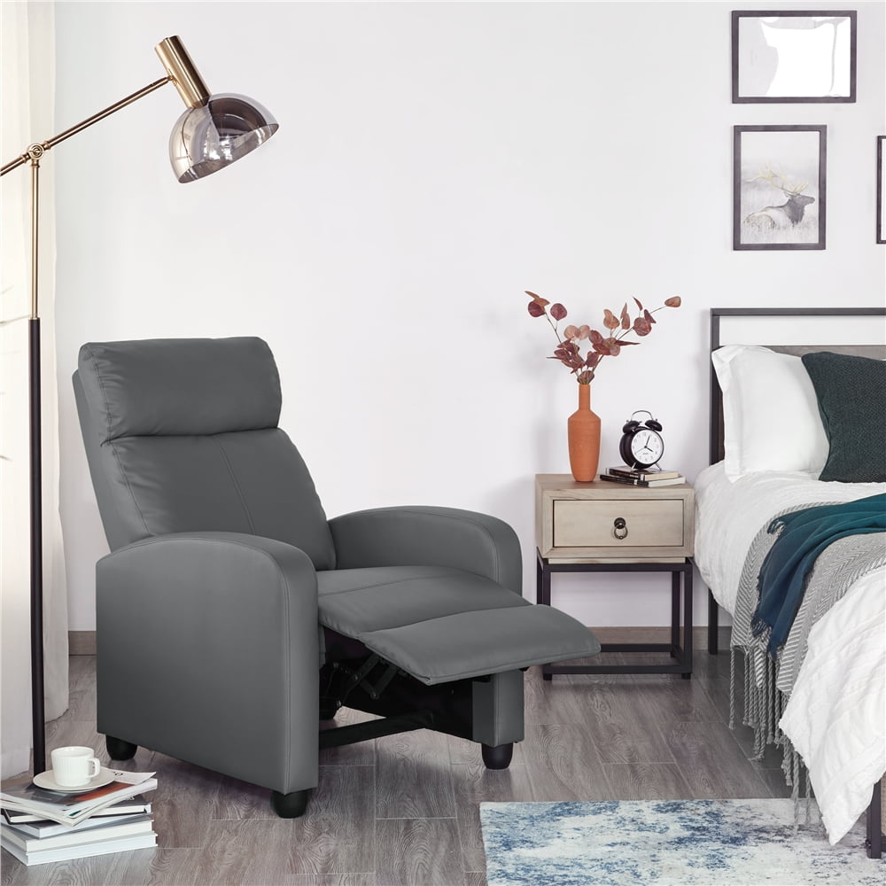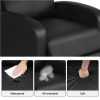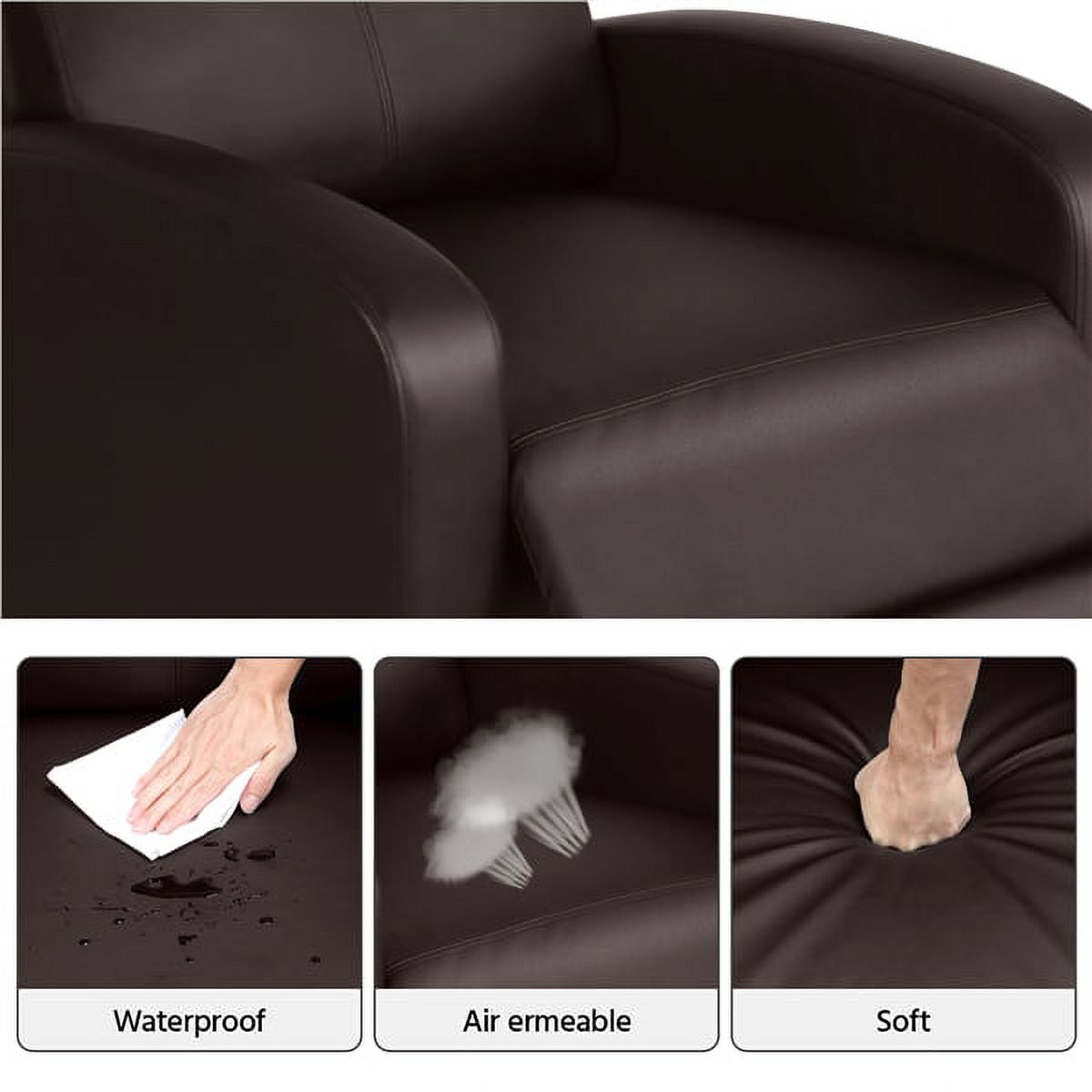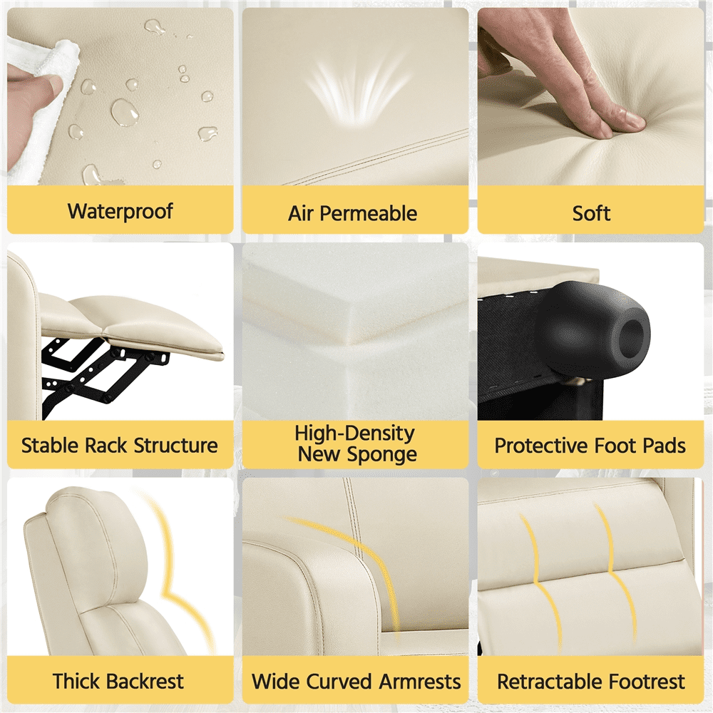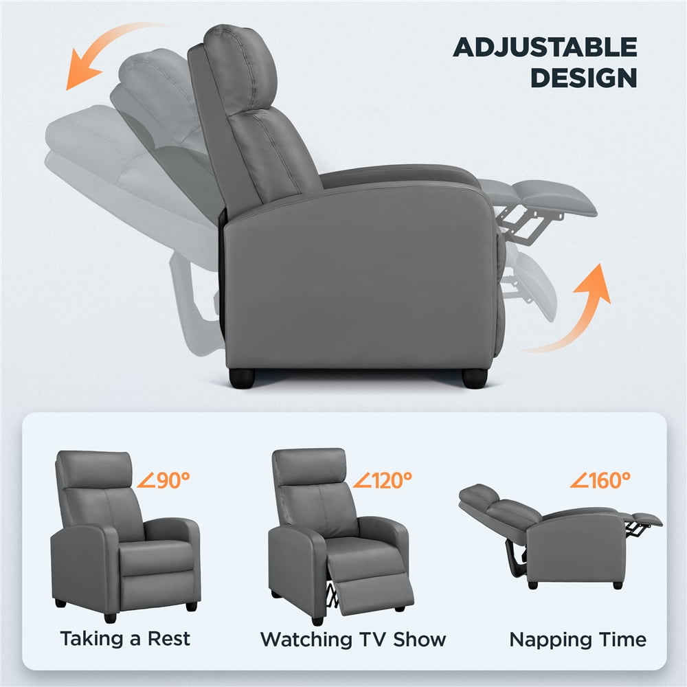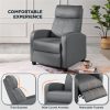 This recliner is built of high quality materials that are water-resistant and easy to clean. The faux leather reclining chair features a soft-cushioned seat, and an extra thick foam filled backrest and footrest. The upholstered faux leather is soft to the touch and has an elastic and flexible feel. This chair sits on four sturdy feet equipped with non-marking pads, which protects both the sofa and the floor while moving. The thick high density foam is supported by quality pocket spring that provides support while sitting. By pushing at the backrest, the footrest instantly pops up so you can recline at a variety of different angles. This recliner is the perfect piece for any living room, bedroom, home office, or den. The contemporary and transitional style blends in with any home decor.