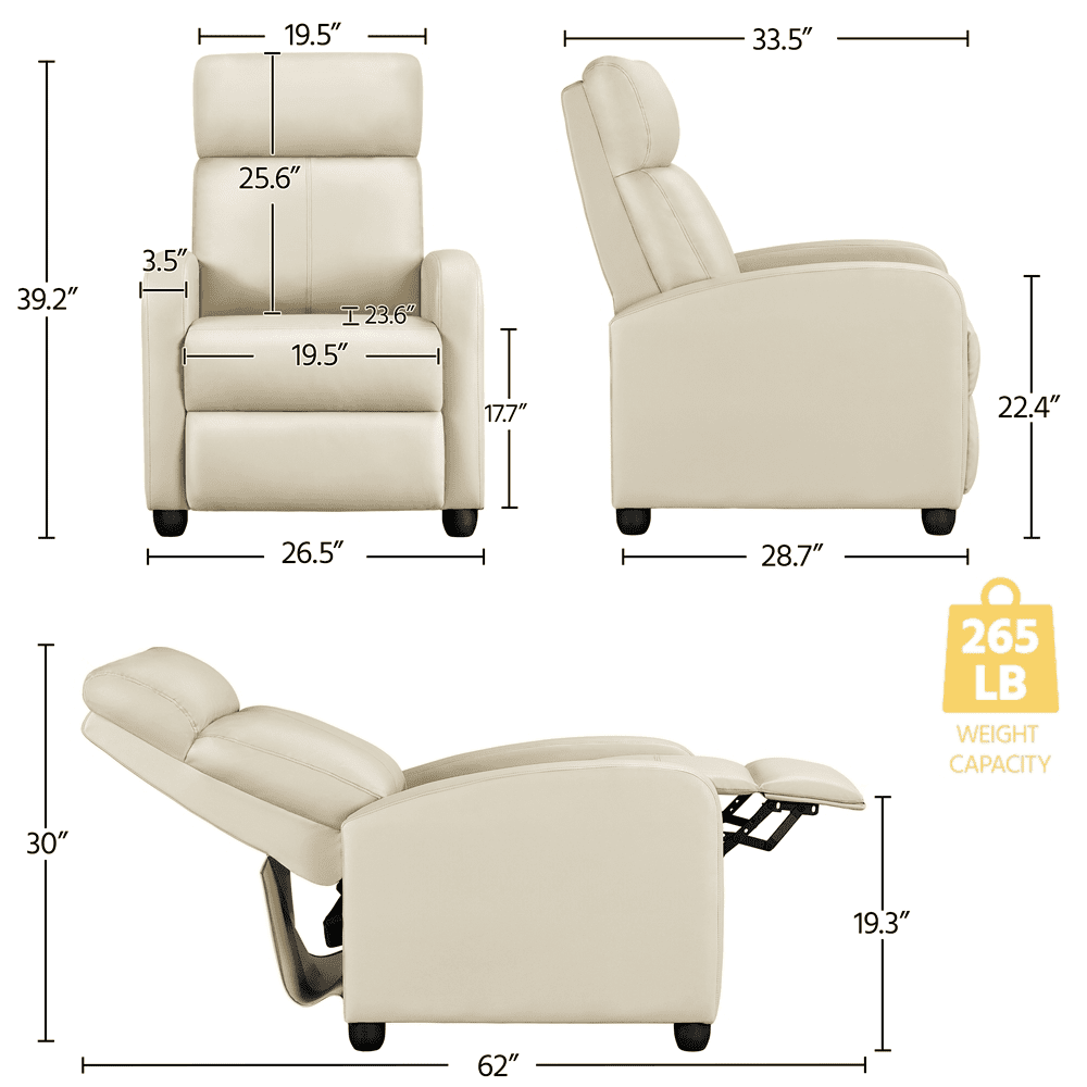• Fully Reclined Dimensions: 26.5″ W × 62″ D × 30″ H