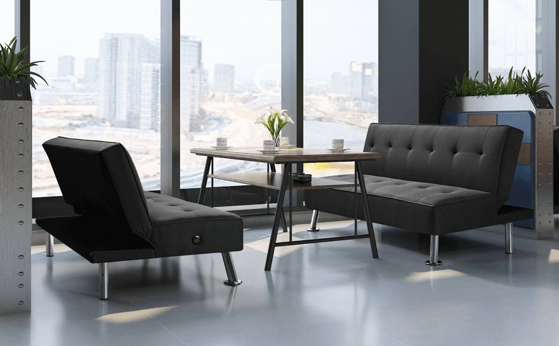 Finally, a place to sit and literally recharge. The Alden Design Convertible Futon with USB is the first of its kind to offer 2 side-mounted USB charging ports. Your guests will be pleasantly surprised when they find that their modern fold-down bed can also charge their electronic devices. Our sofa bed provides space for 3 guests to sit and 2 guests to comfortably sleep. It is the perfect space saver with three different convertible and adjustable positions to sit, lounge, and sleep. The soft upholstered fabric is wear-resistant, guaranteeing this futon will last a long time. The filling used is plush and cozy while the chrome-plated legs are sturdy and strong. This futon is perfect for any small space, living room, bedroom, study, home office, etc.