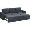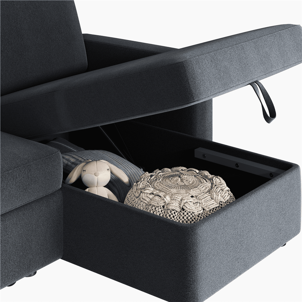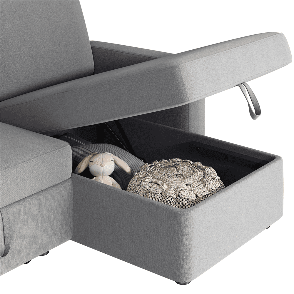 • Spacious Hidden Storage CompartmentThe storage chaise of this sleeper sectional sofa conceals space of 49.6″ L × 23″ W × 8.3″ D for keeping blankets and pillows clean and close at hand under its seat. The lid stays open as you take things in and out.