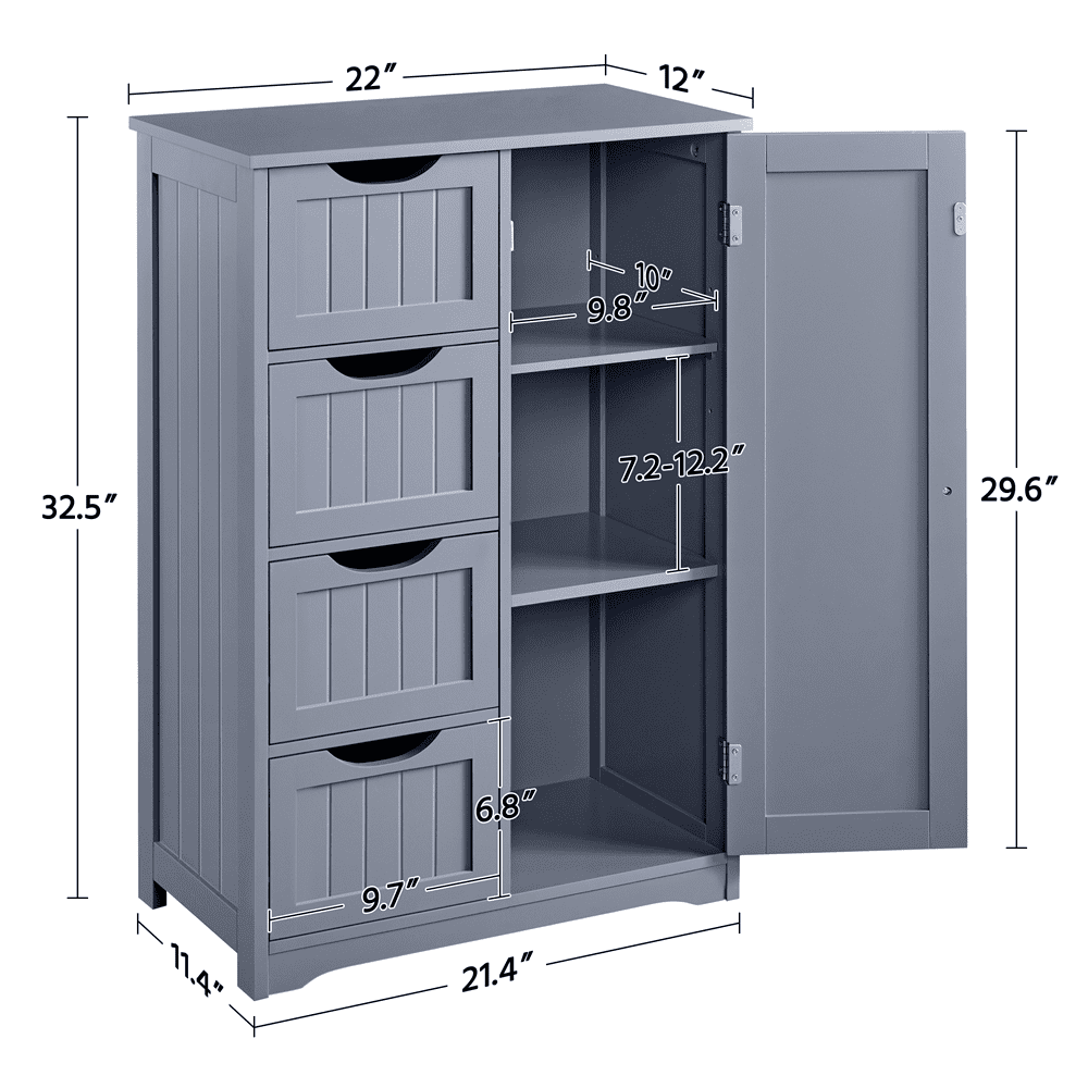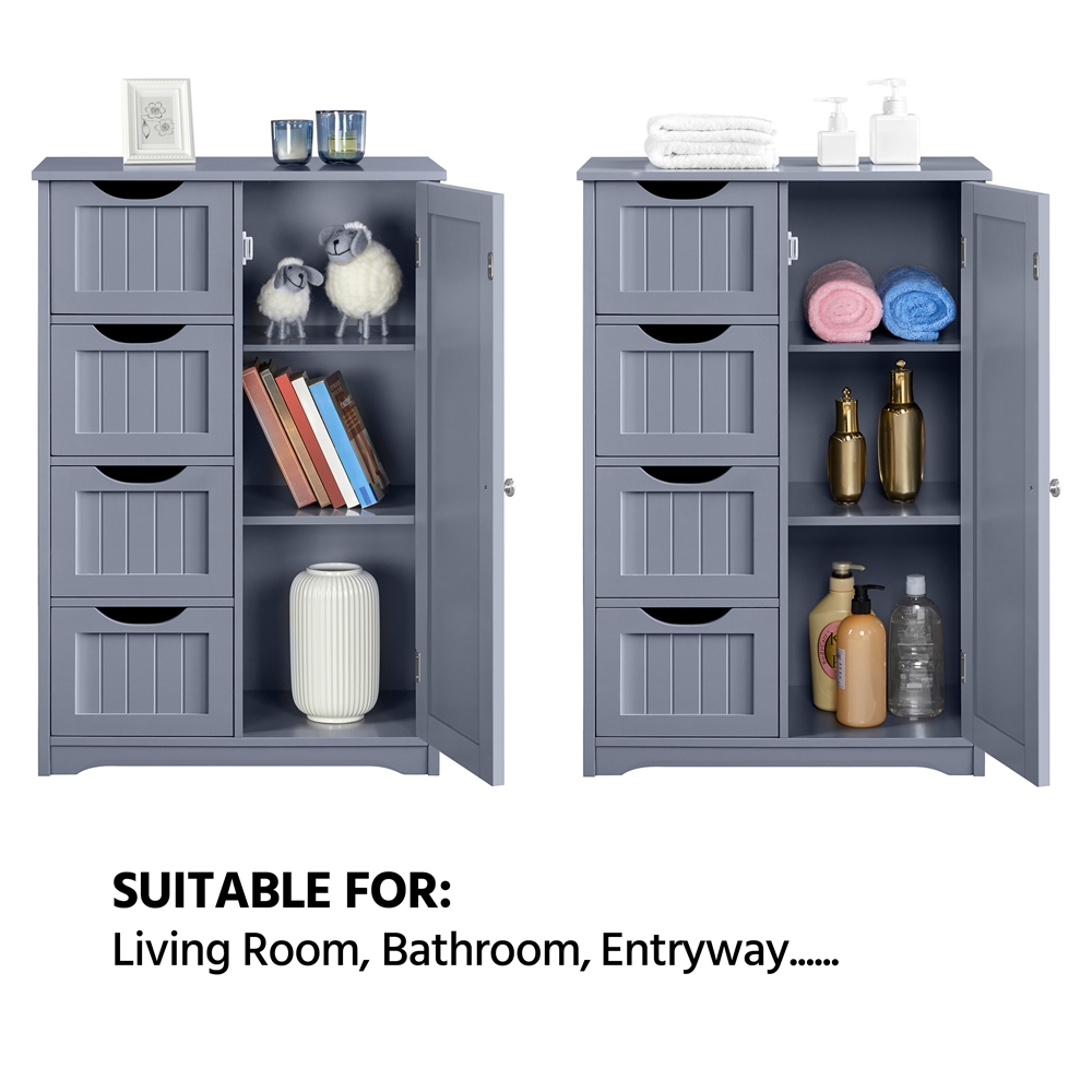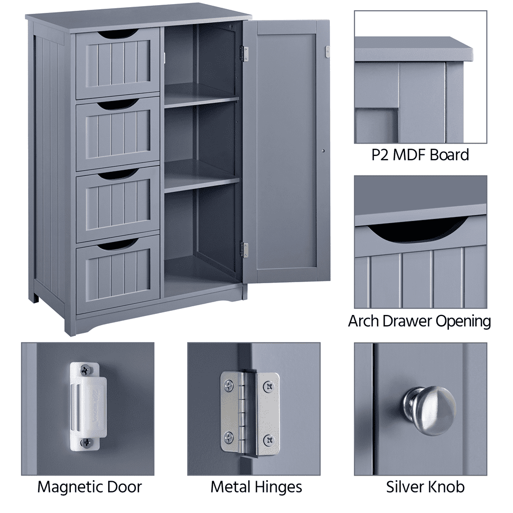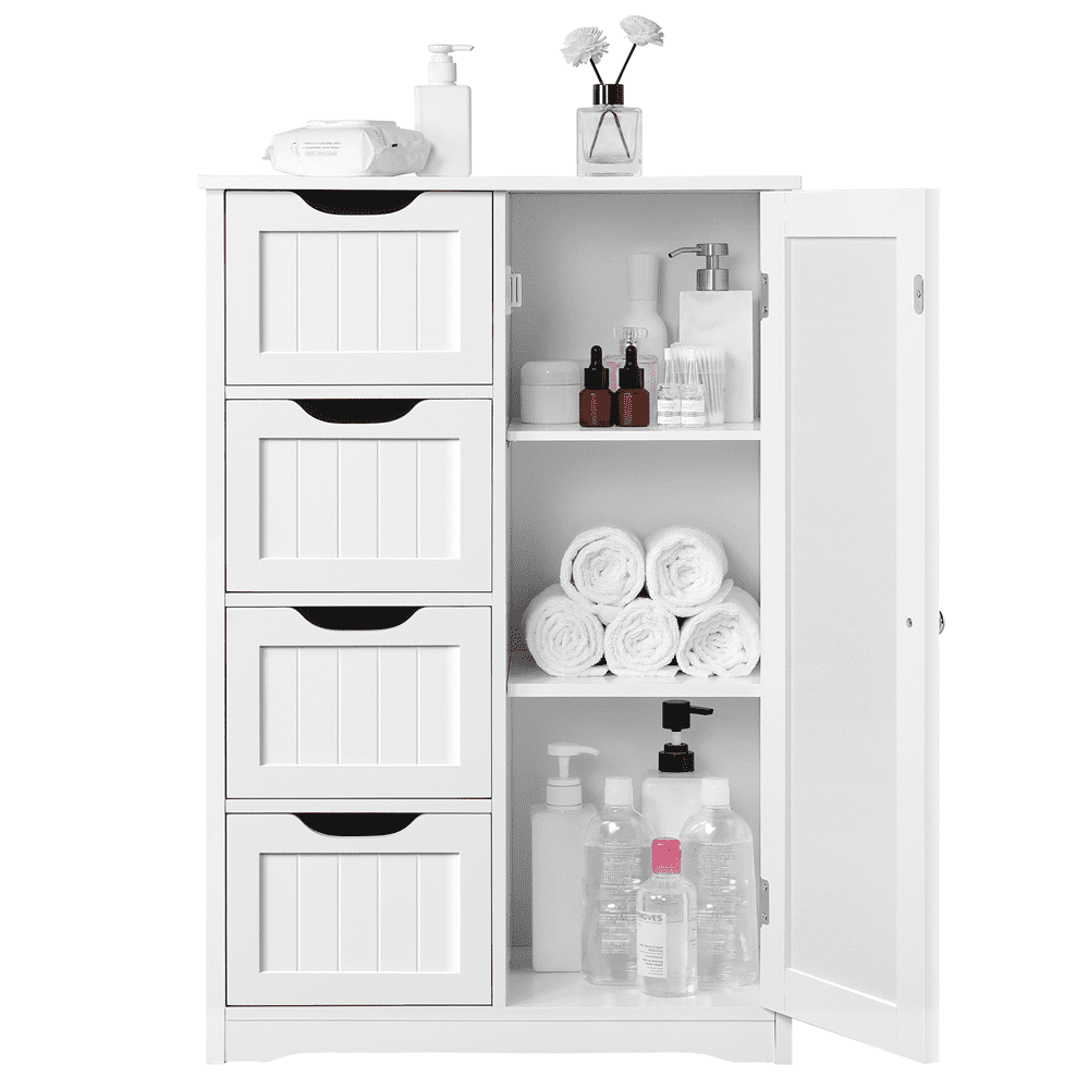 This free-standing cabinet is built in a solid structure with high load capacity and can meet all of your basic storage requirements. Made with high-quality materials, this wooden bathroom storage cabinet can withstand the humidity and prevent moisture, specifically designed to for humid areas such as your bathroom or kitchen. Four drawers with cutout handles and one cupboard with a customizable shelf for you to organize different items like cosmetics, toiletries, towels and toilet paper. A great option for tucking away bathroom clutter. The addition of this bathroom storage cabinet can elevate any bathroom or room!