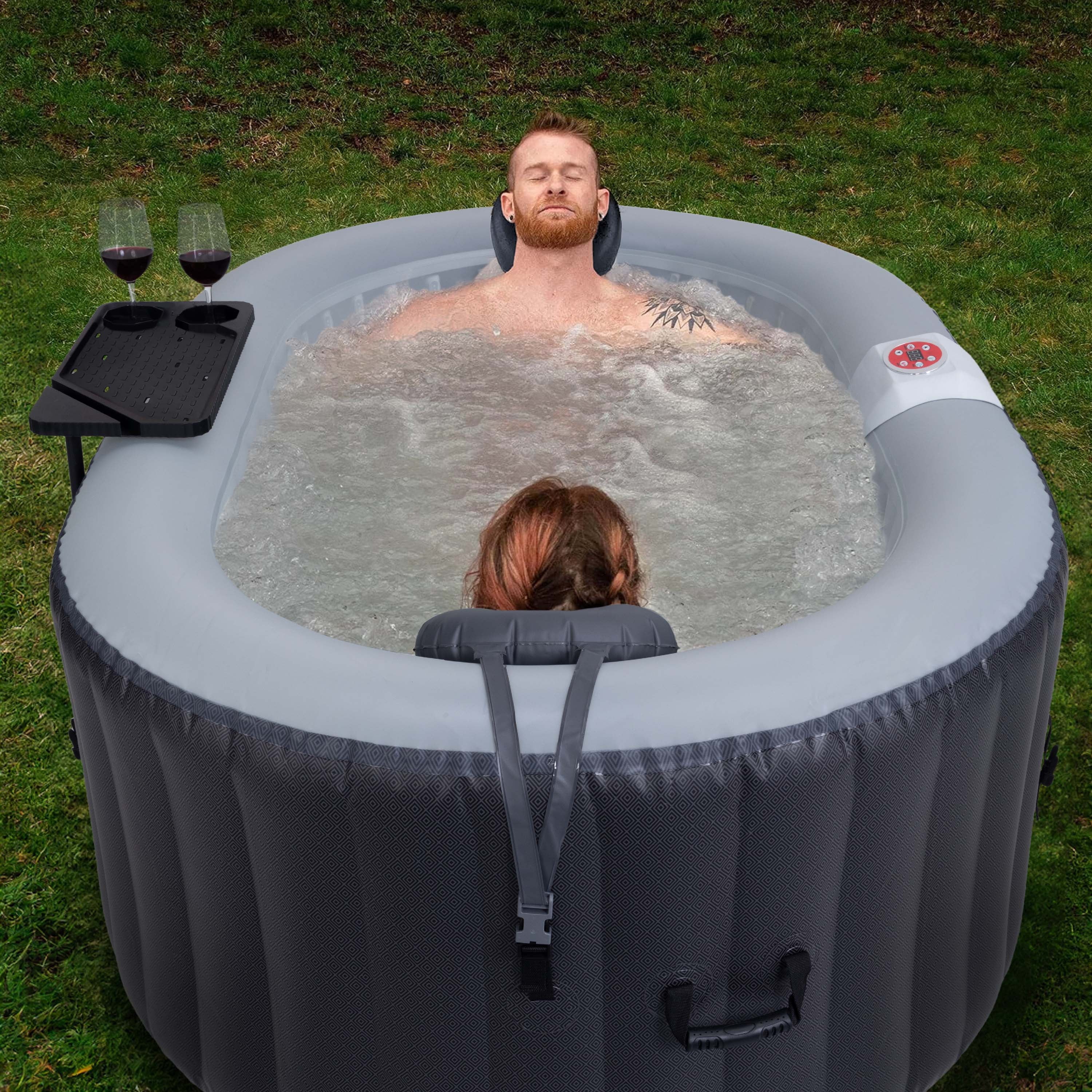 Transform your backyard into a personal oasis with this luxurious 2-person inflatable hot tub. The 120 high-powered jets deliver a soothing 360-degree bubble massage to help you relax and unwind. The included LED strip, with 7 vibrant colors, sets the mood for any occasion, and you can enjoy your favorite drinks without leaving the tub, thanks to the included drink tray and cup holders. Inflatable headrests add extra comfort.
