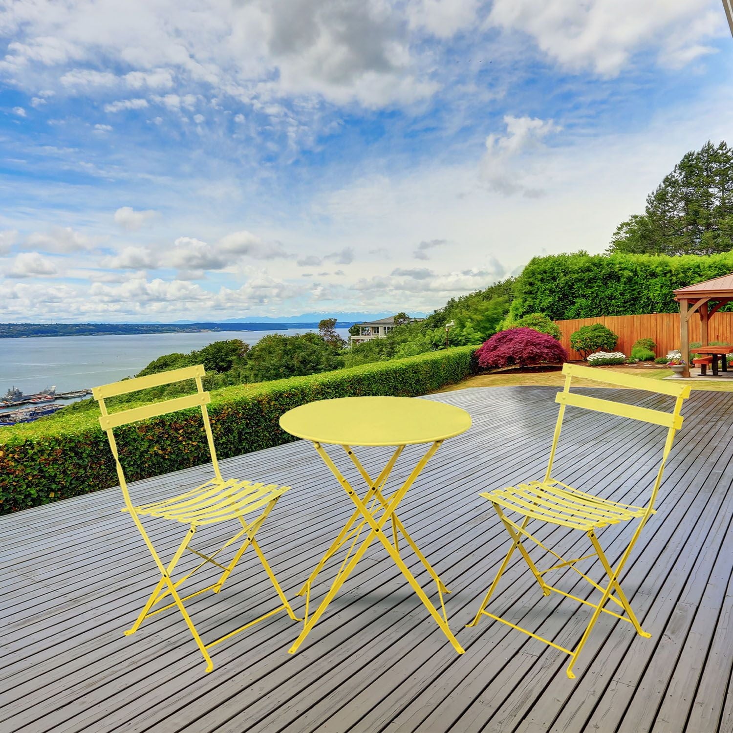 This versatile Outdoor Table and Chairs Set for 2 is perfect for a backyard or balcony in any design scheme. All elements are lightweight and foldable for easy storing.