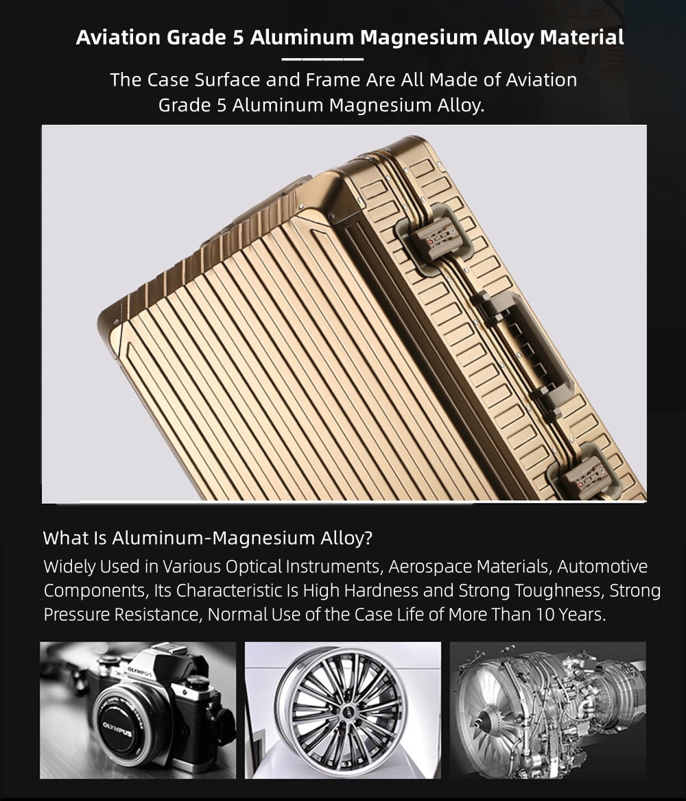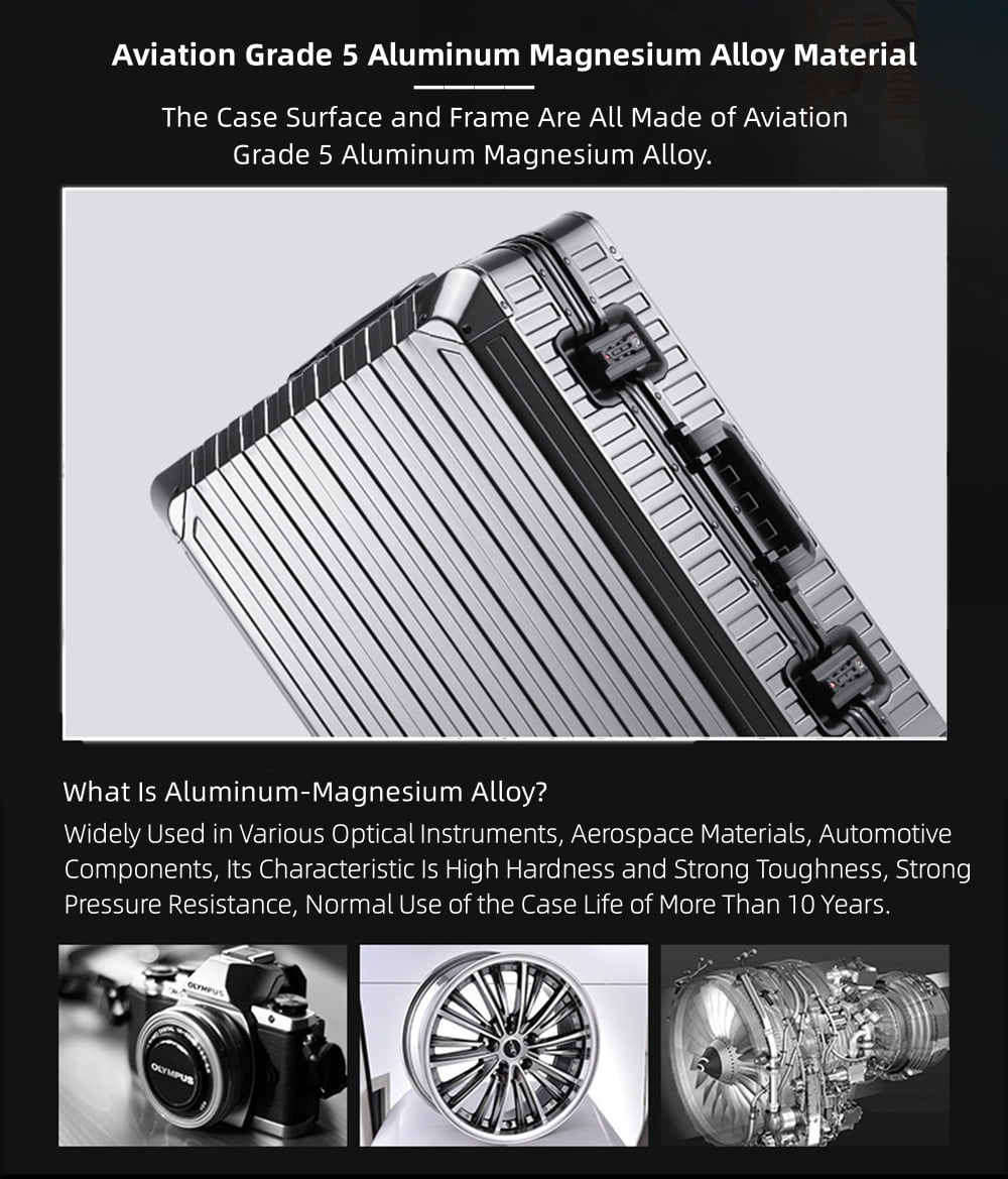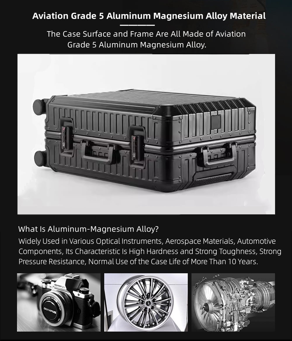 - Fashion All Aluminum Magnesium Alloy Hardside Carry on Luggage: The surface and frame of the Luggage are made of aviation grade 5 aluminum-magnesium alloy material, which is lighter, stronger and has better compressive strength. Aluminum magnesium alloy bumper corner to prevent impact. The luxury of the all aluminum suitcase with scratch resistant and beautiful shiny appearance is overwhelming.