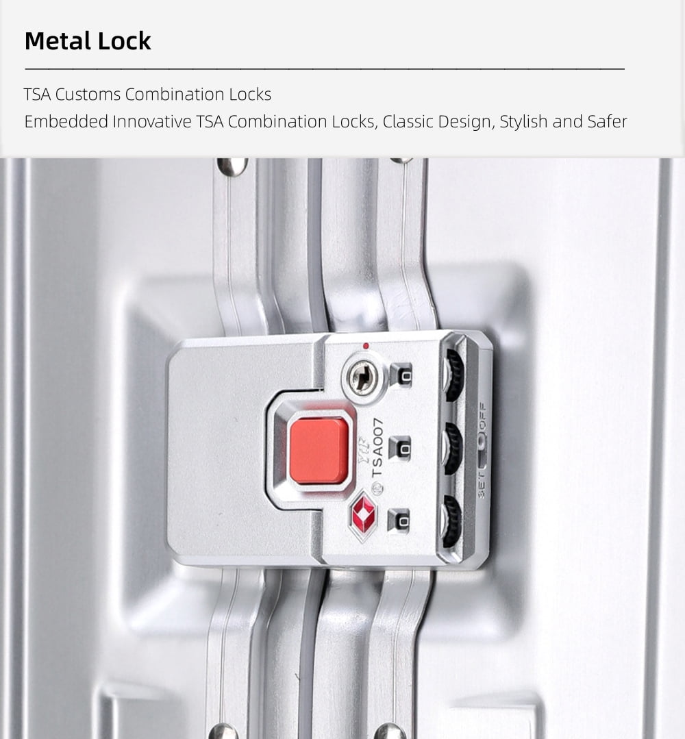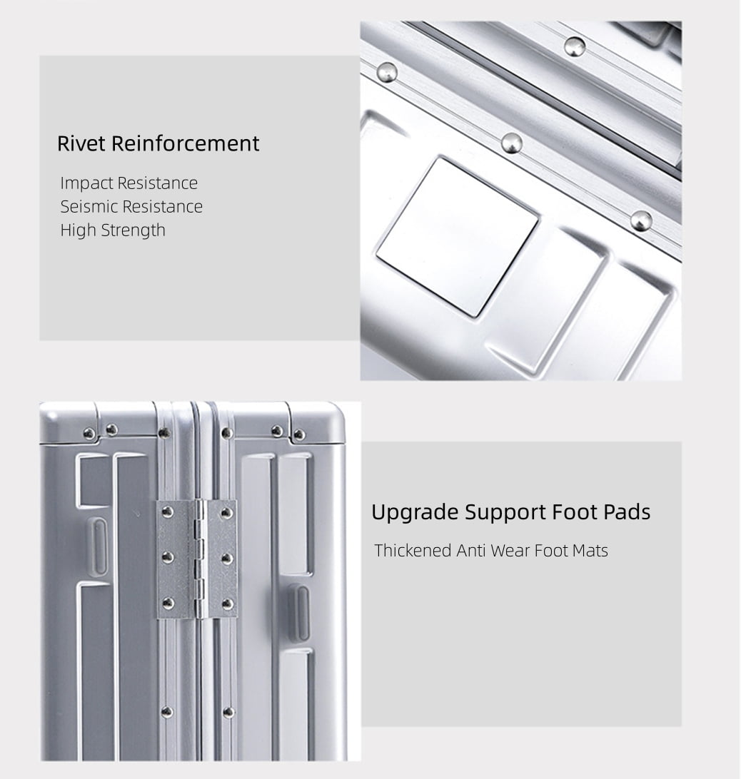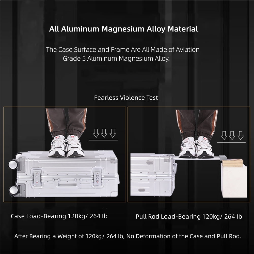 • Fashion All Aluminum Magnesium Alloy Hardside Carry on Luggage: The surface and frame of the Luggage are made of aviation grade 5 aluminum-magnesium alloy material, which is lighter, stronger and has better compressive strength. Aluminum magnesium alloy bumper corner to prevent impact. The luxury of the all aluminum suitcase with scratch resistant and beautiful shiny appearance is overwhelming.