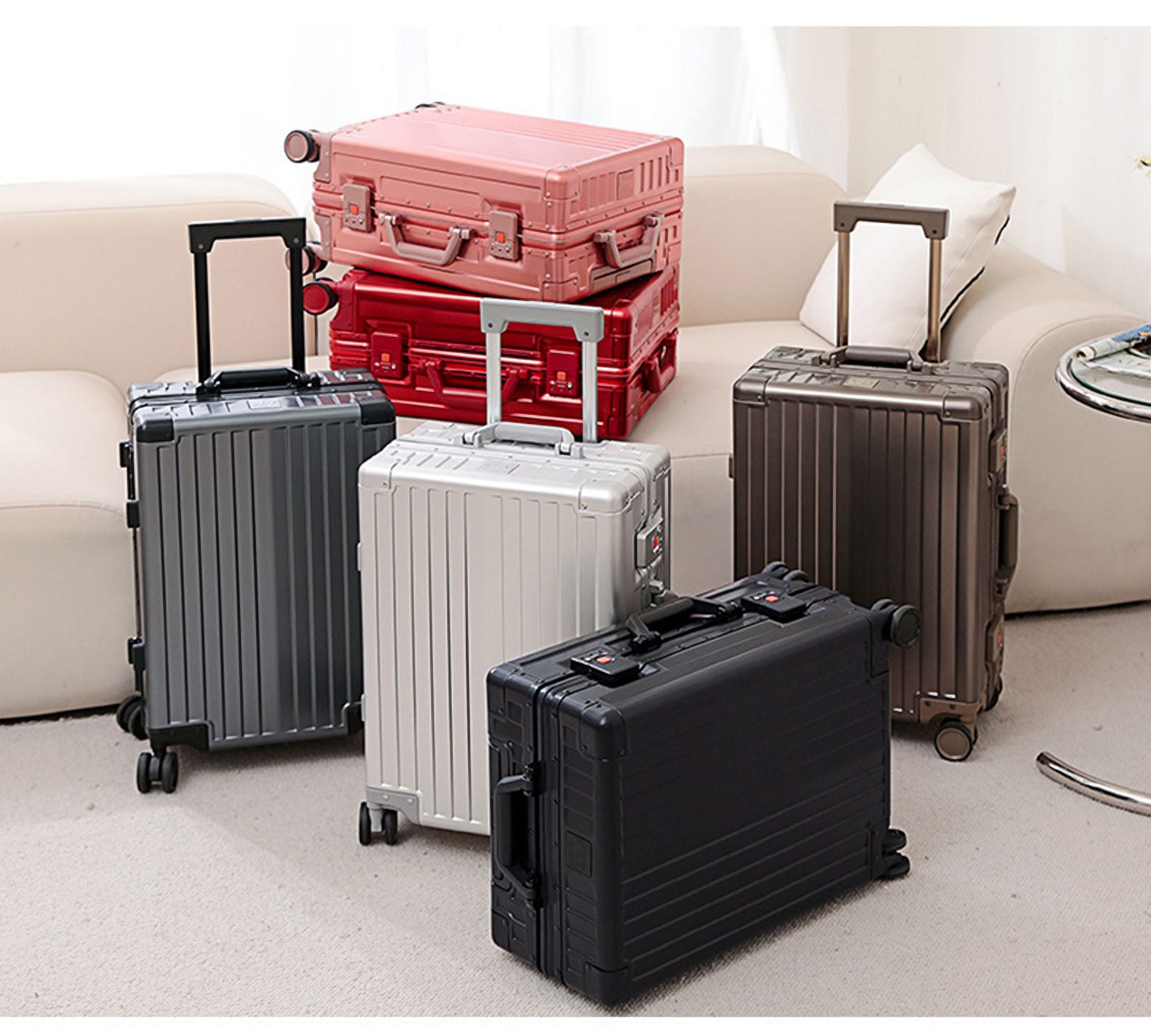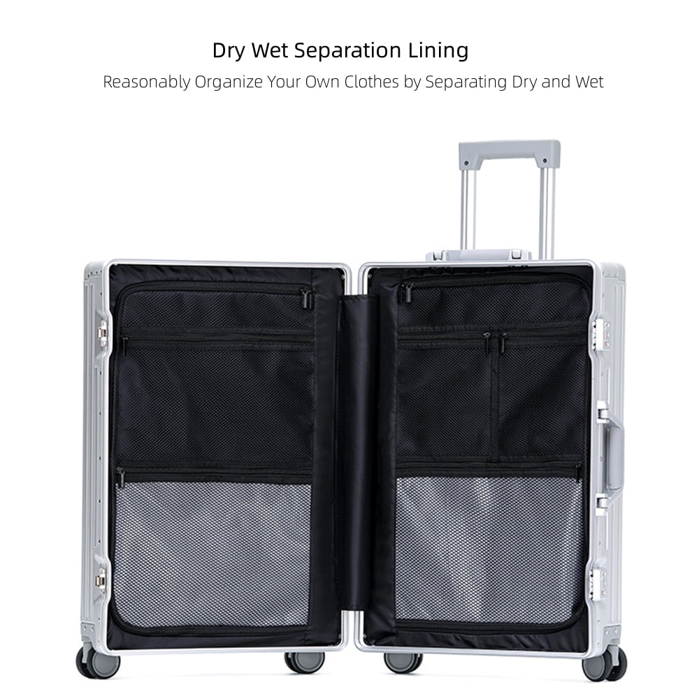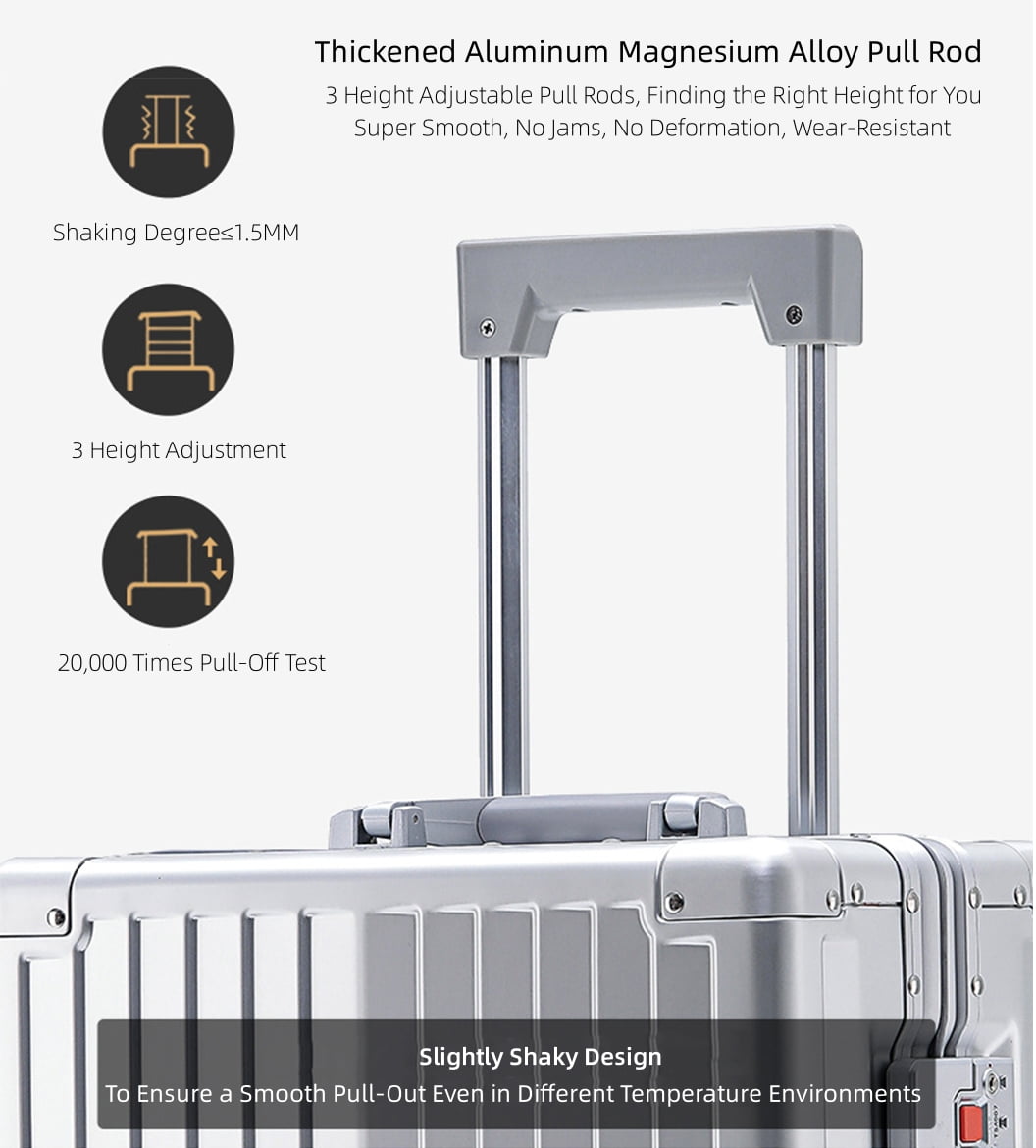 • Fashion All Aluminum Magnesium Alloy Hardside Carry on Luggage: The surface and frame of the Luggage are made of aviation grade 5 aluminum-magnesium alloy material, which is lighter, stronger and has better compressive strength. Aluminum magnesium alloy bumper corner to prevent impact. The luxury of the all aluminum suitcase with scratch resistant and beautiful shiny appearance is overwhelming.