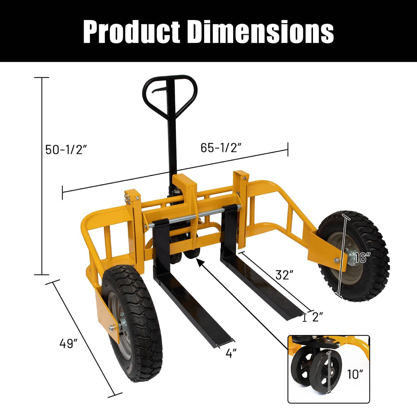 - Heavy-duty Wheels: The pneumatic front wheels measure 16 inches in diameter, provide better traction than polyurethane wheels, are shock-absorbent, and can be used on uneven surfaces. The pneumatic steering wheels measure 10 inches in diameter and swivel to provide a 180-degree turning radius. Easily moves products over gravel and rough outdoor surfaces.