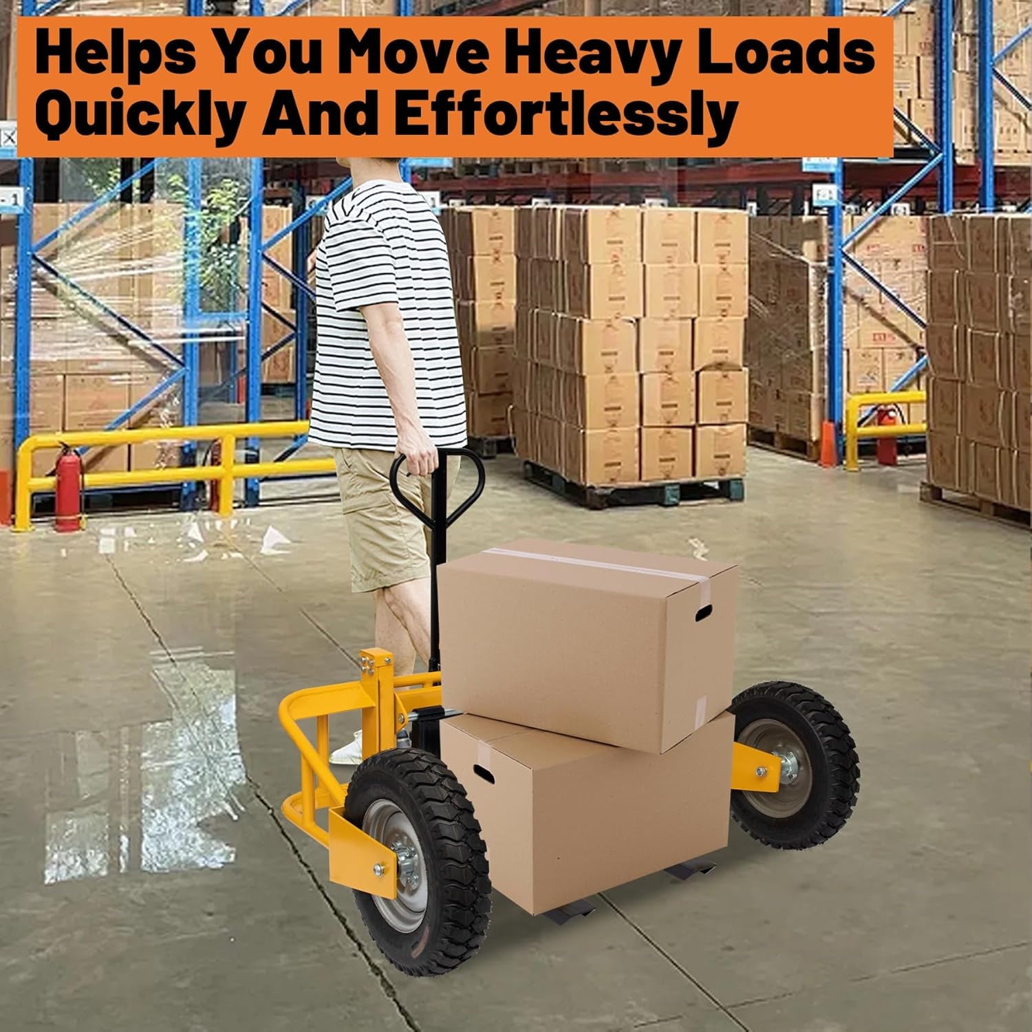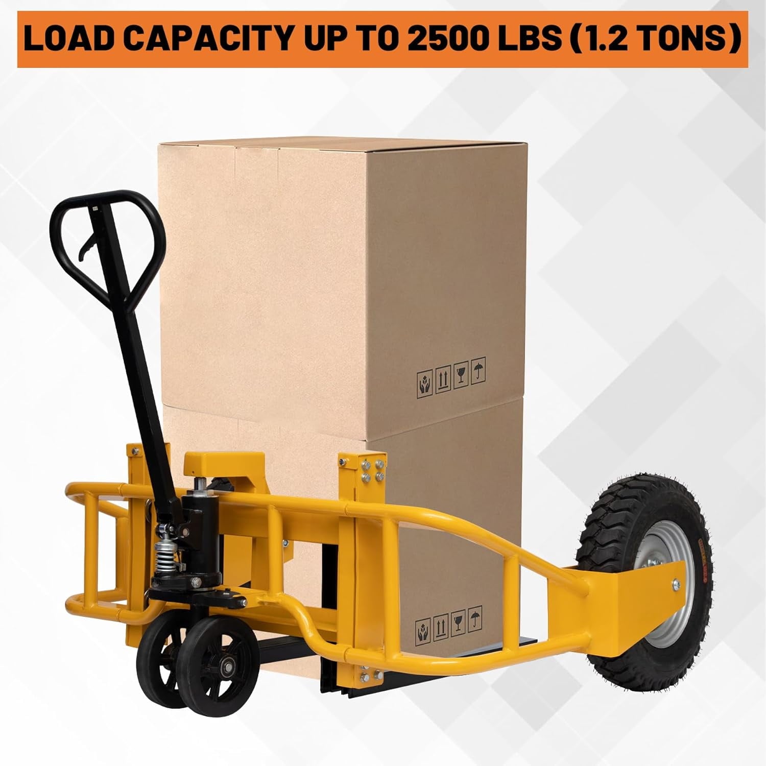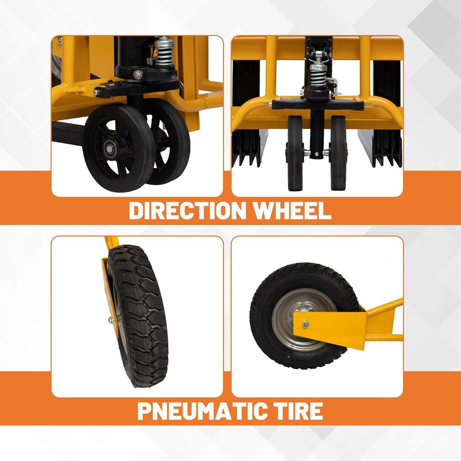 - 【All-Terrain Performance】: Equipped with large wheels and pneumatic tires, this pallet truck can smoothly navigate various surfaces, including construction sites, lumber yards, nurseries, and golf courses. Its robust design ensures reliable performance in challenging environments.