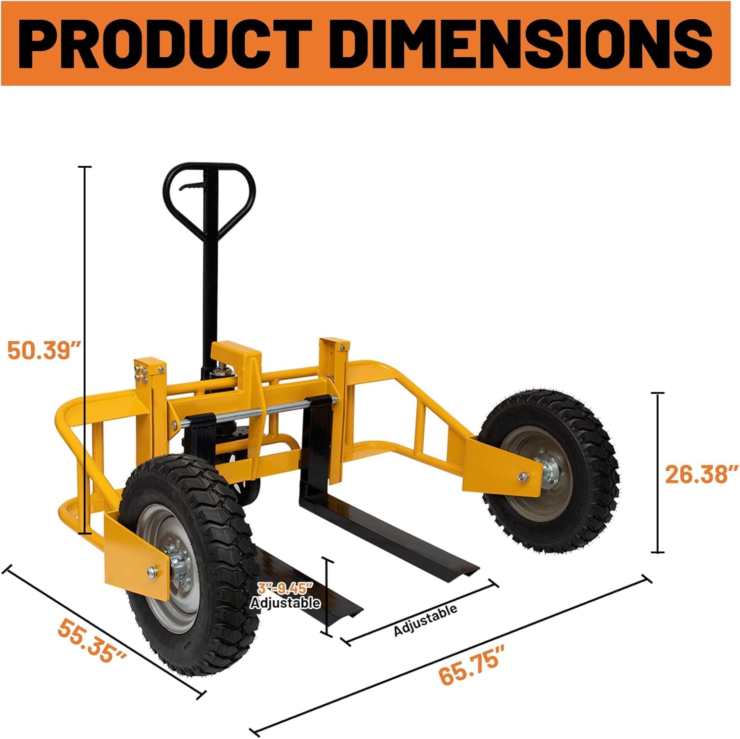 - 【Adjustable and Versatile】: Our manual pallet truck offers flexibility to meet your specific needs. With an overall dimension of 65.75″W x 55.35″D x 50.39″H, it features large 16″ front pneumatic tires and adjustable fork height (3″-9.45″). The distance between the forks can also be adjusted, providing versatility to handle different load sizes.