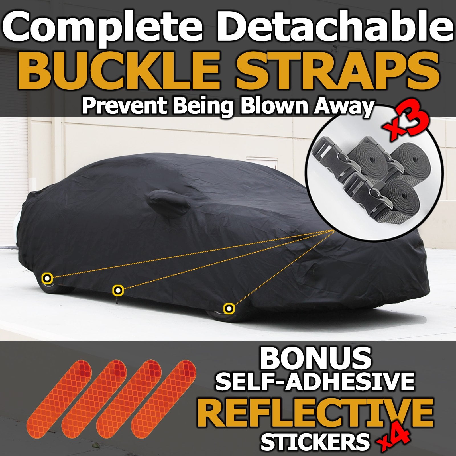 - 100% wind-proof design: Front and rear under body Elastic Hems. 3 detachable straps in front, middle, and rear of the cover. Large air-vent for ventilation