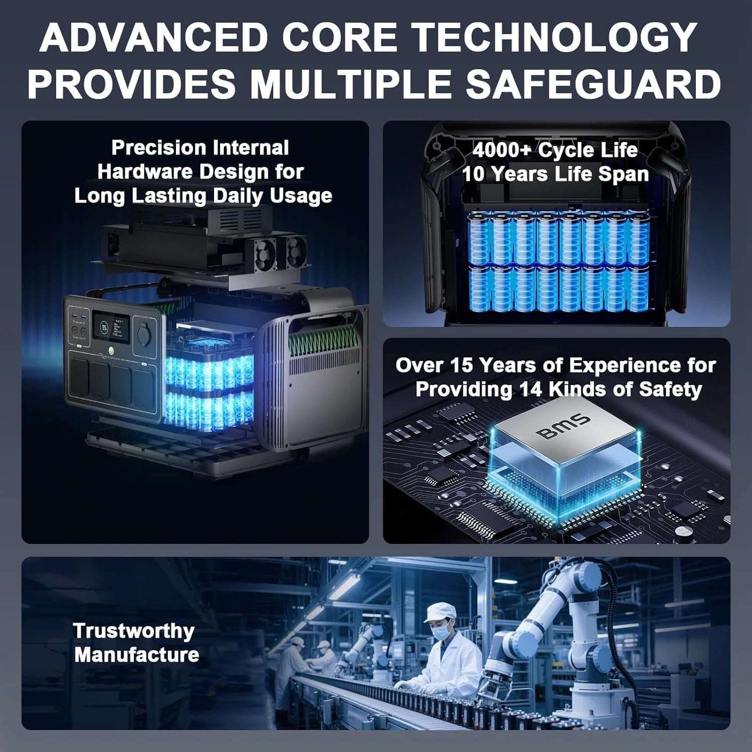 Invest with confidence, backed by our robust 5-year warranty (including free replacement within 90 days). Built with a premium LiFePO4 battery, it delivers 4000+ cycles and a decade of reliable service—outlasting most traditional power stations. This is the durable, set-and-forget power solution American families trust.
