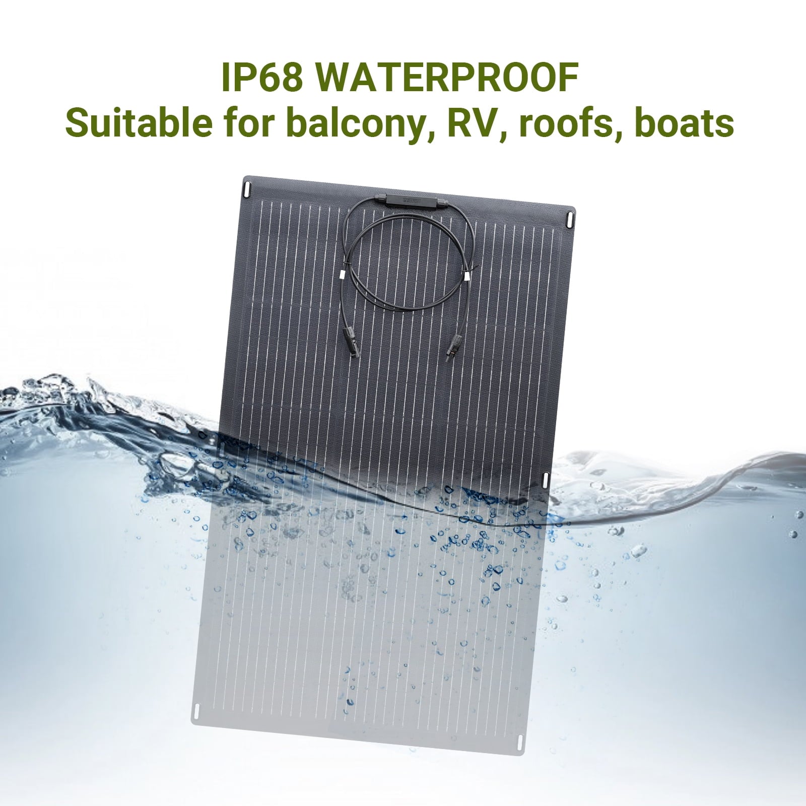 - With a waterproof level of IP68, the flexible solar panel can be used in all weather and can withstand dirt, dust, debris, and low-pressure water jets. Just fix it firmly where you want, instead of dismantling it every rainy day.