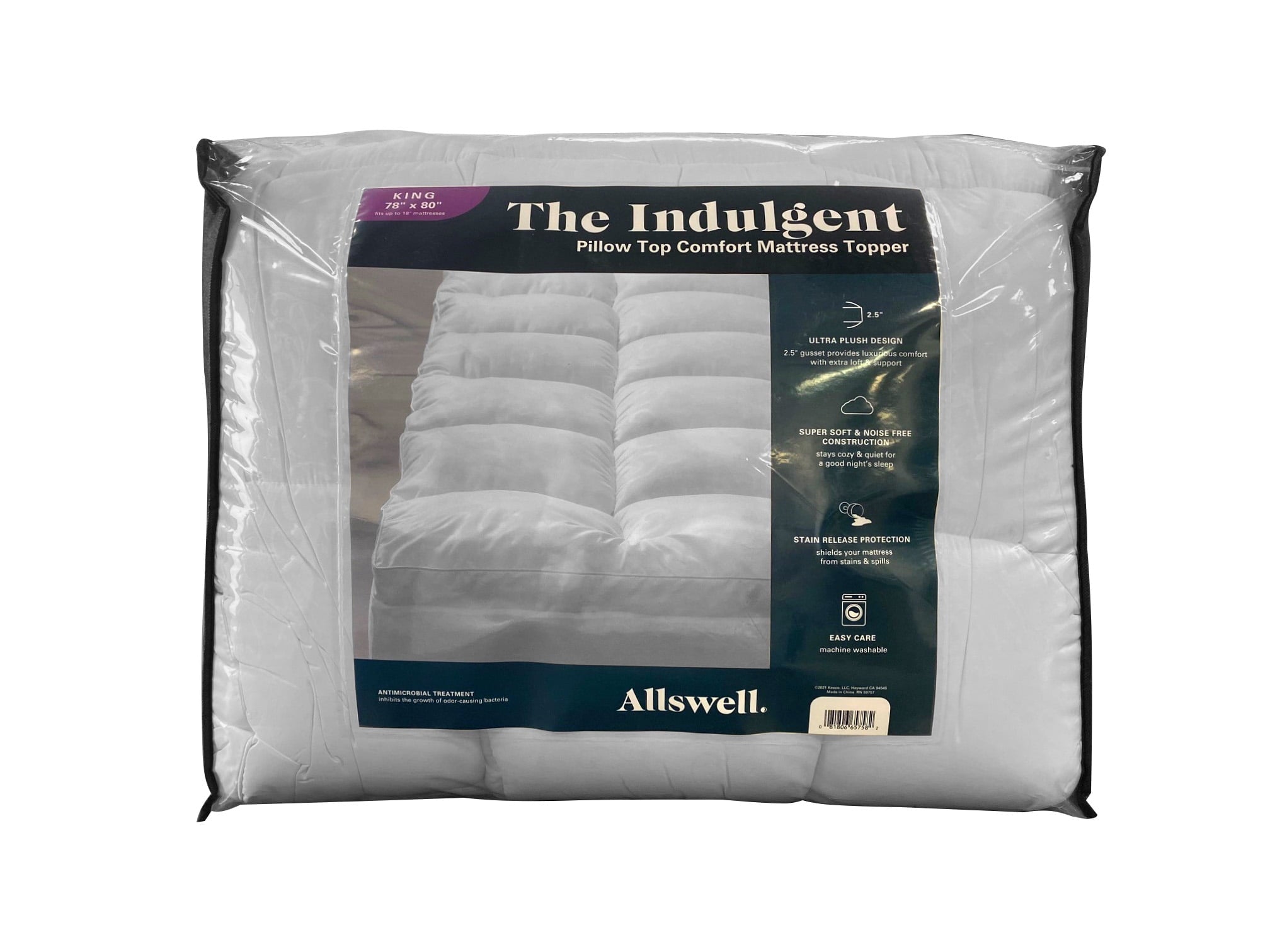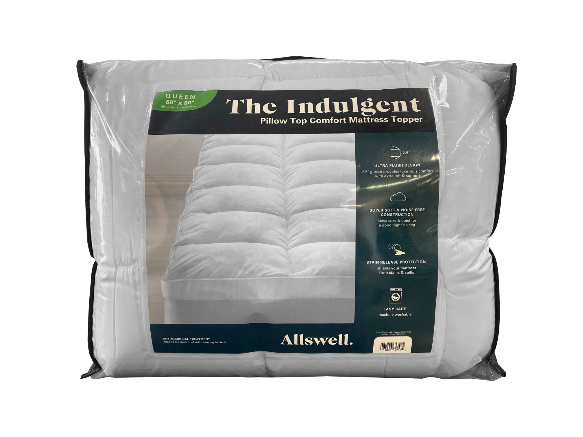 Enjoy a great night’s rest with the Allswell Indulgent Pillow Top Comfort Mattress Topper. The overfilled design and 2.5-inch gusset is perfect for anyone looking for extra comfort and support. The construction of the topper is super soft and noise-free, staying cozy and quiet for a restful night’s sleep. For easy care, this topper is treated with stain-release protection to shield your mattress from stains and spills. Antimicrobial treatment is also included to inhibit the growth of odor-causing bacteria, adding to your peace of mind. The Allswell Indulgent Pillow Top Comfort Mattress topper is easy to put on, easy to keep clean, and makes it easier to fall asleep and stay asleep.