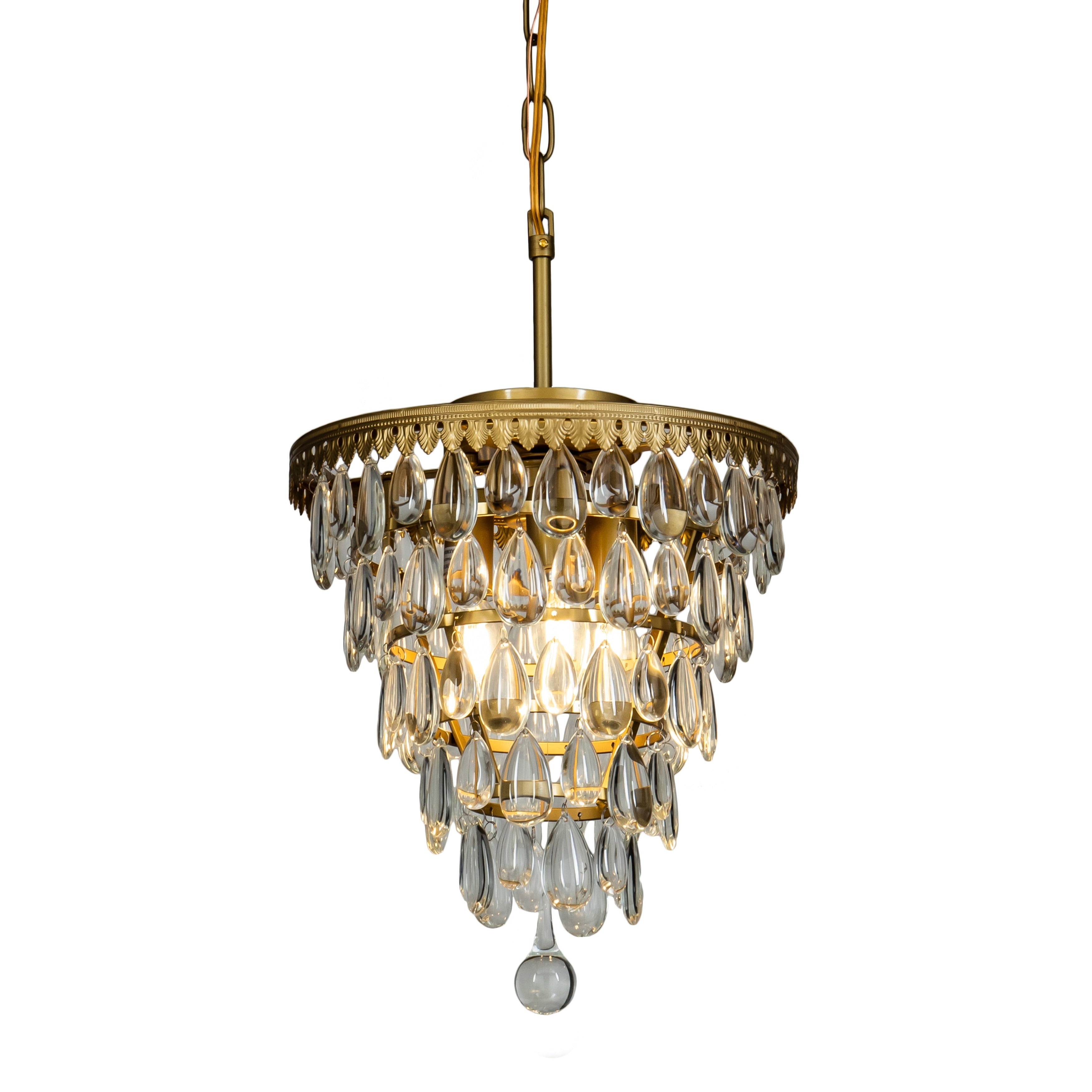 Hundreds of glass teardrop from a shimmering cascade on this chandelier. Crystals in alternating teardrop shapes , with a nice water drop at the bottom. Illuminate your home, while adding this elegant and antique beauty, with this chandelier by brass. This chandelier showcases a stunning design with beautiful glass droplets in your space. This chandelier lighting suitable for closet , kids room, foyer, kitchen, hotel , restaurant and more. Suggested Space Fit:dining room, kitchen, bedrooms, foyers, or any other dry area of your home.