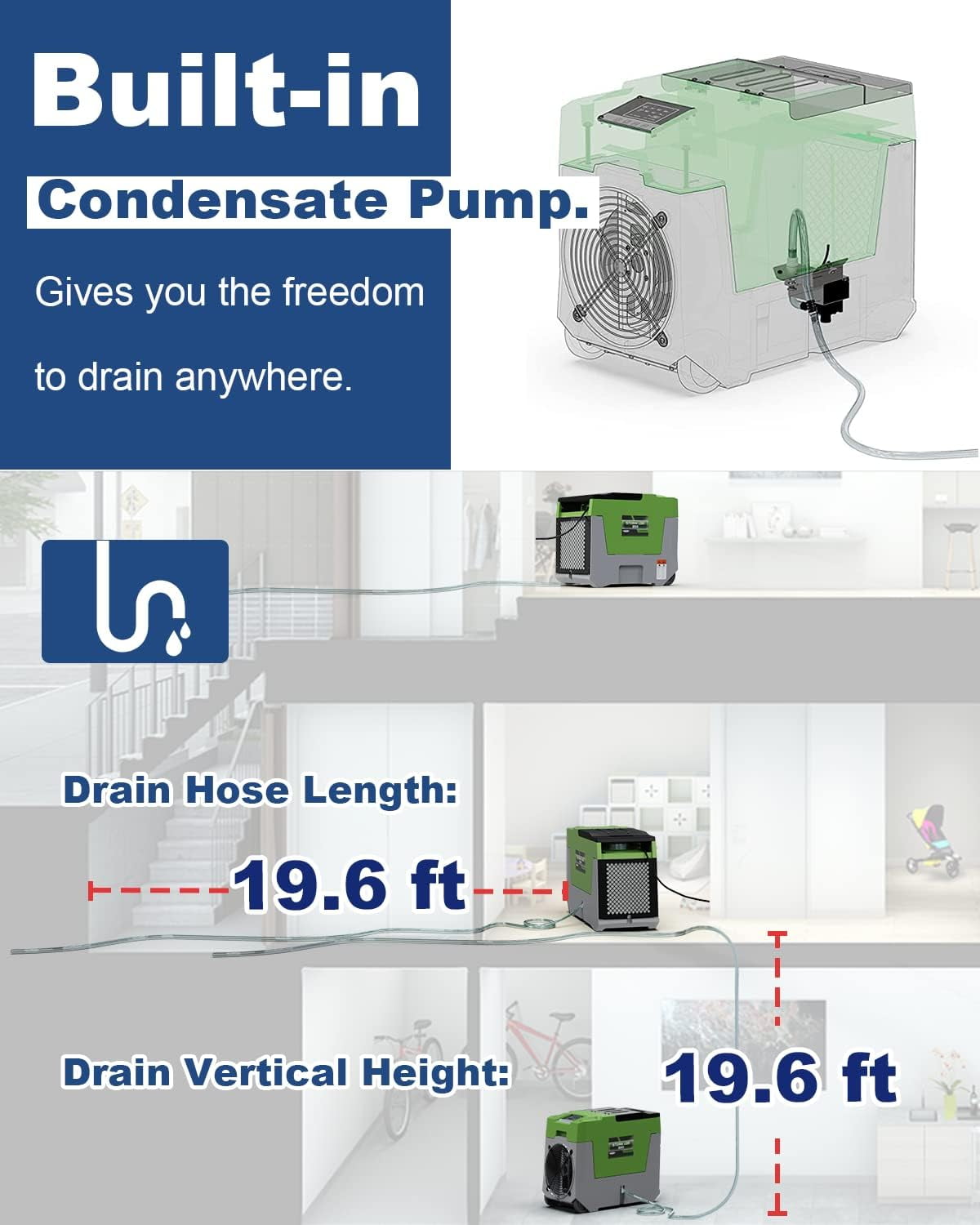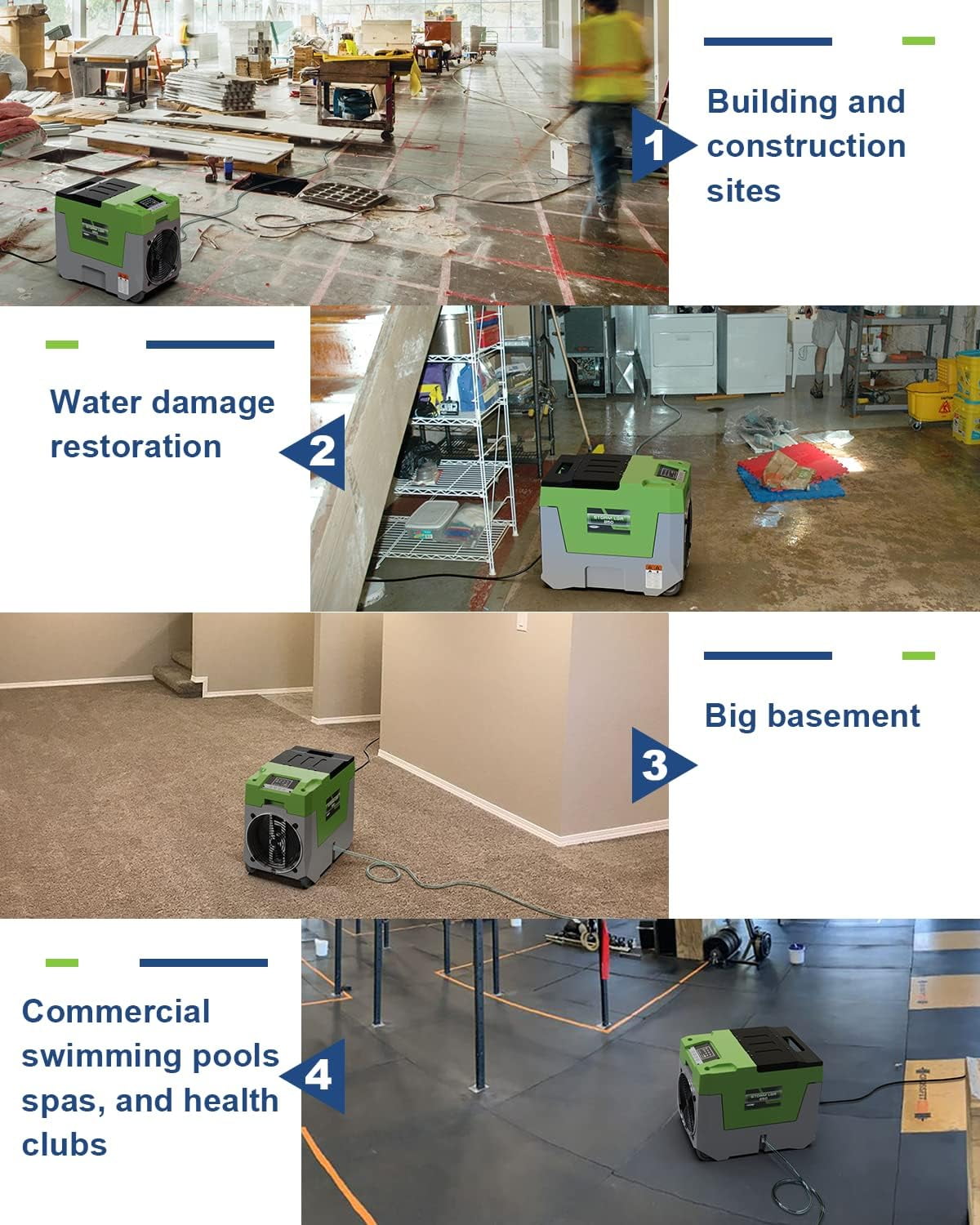 - COMMERCIAL, INDUSTRIAL, And BASEMENT USE: With the new design and layout of the machine, the volume of the whole machine is 40% smaller than others on the market, ideal for flood restoration, carpet cleaning, basements/cellars, laundries, de-flooding, or anywhere you need to extract moisture at a professional level. The built-in pump lets drying work hard overnight or continuously for days at a time without you worrying about it.