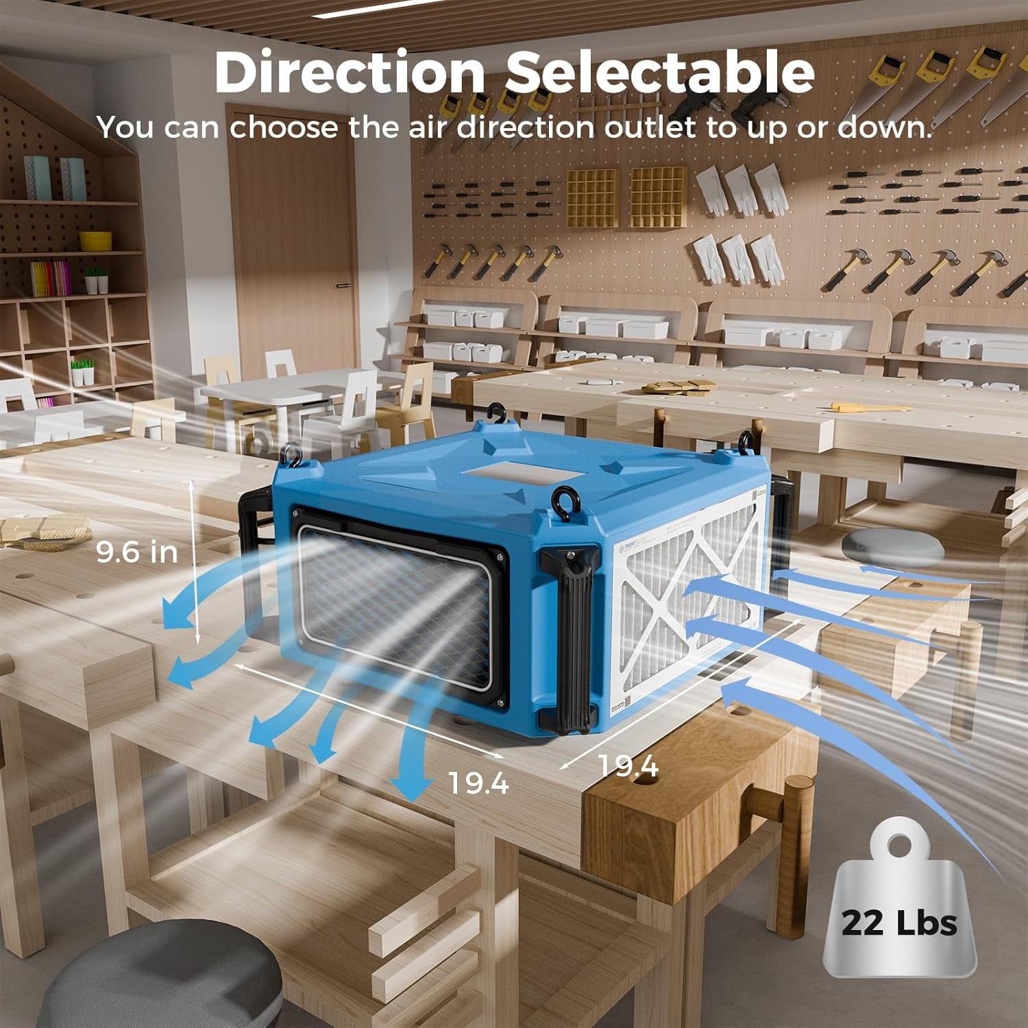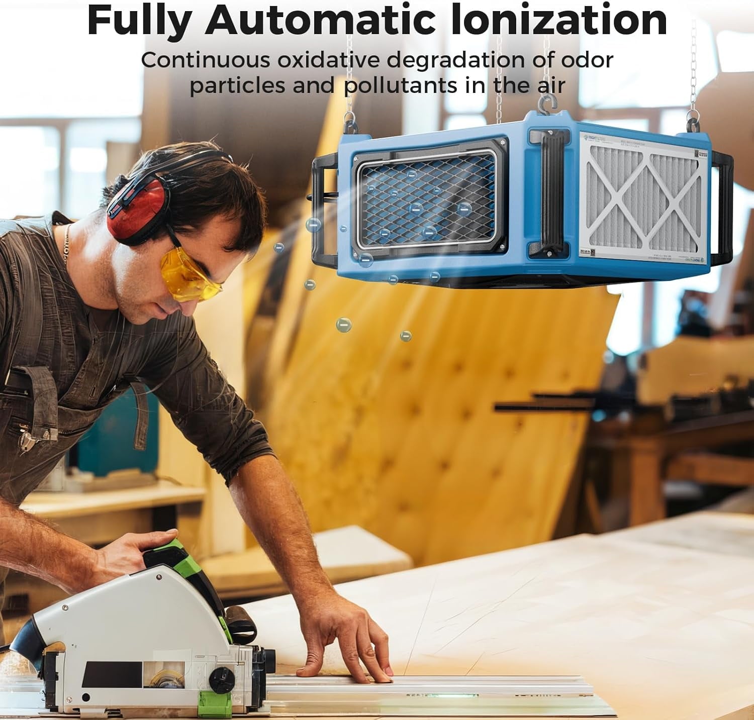 - High Eficiency Filtration Technology: The shop air filtration system is equipped with a fiter with class MEVR 11, which canstop 90% of 3-10um particles and 85% of 1um particles. ldeal for wood carving, sanding, tumning, scroll saw work, rotary tools, powder mixing, etc. it quarantees periect results in terms of reducing indoor alr polution. The filter can be easily replaced.