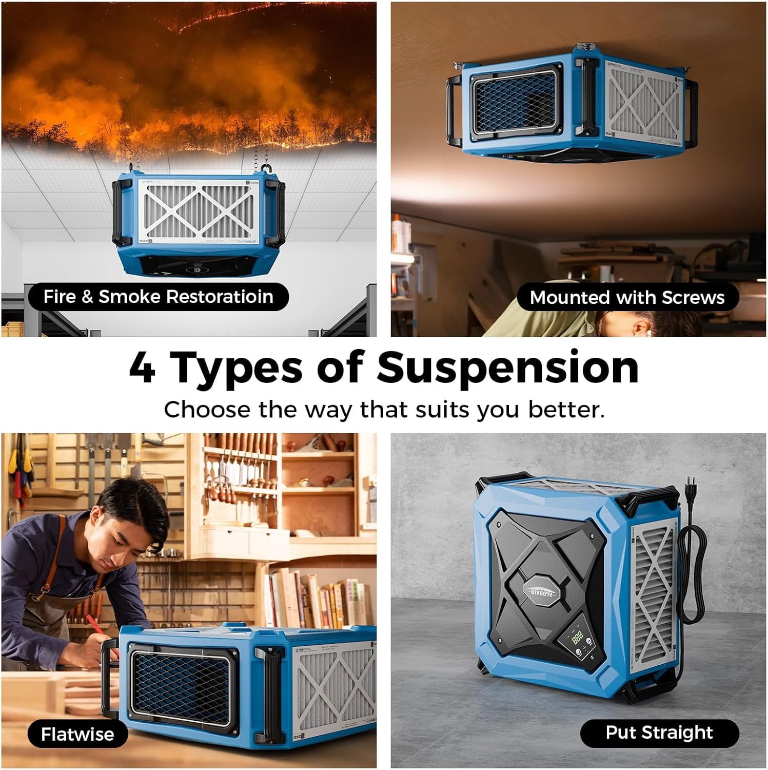 - Accessibility: Timer cycle controller, you can set fan to shut down automatically in 1-9 hours. √ IR remote system: There is no wireless interference, and the anti-interference ability is strong. √ With a hook and chain: Puricare 1080IG air filtration system is easy to move and can be hung from the ceiling in the shop or placed on a workbench.