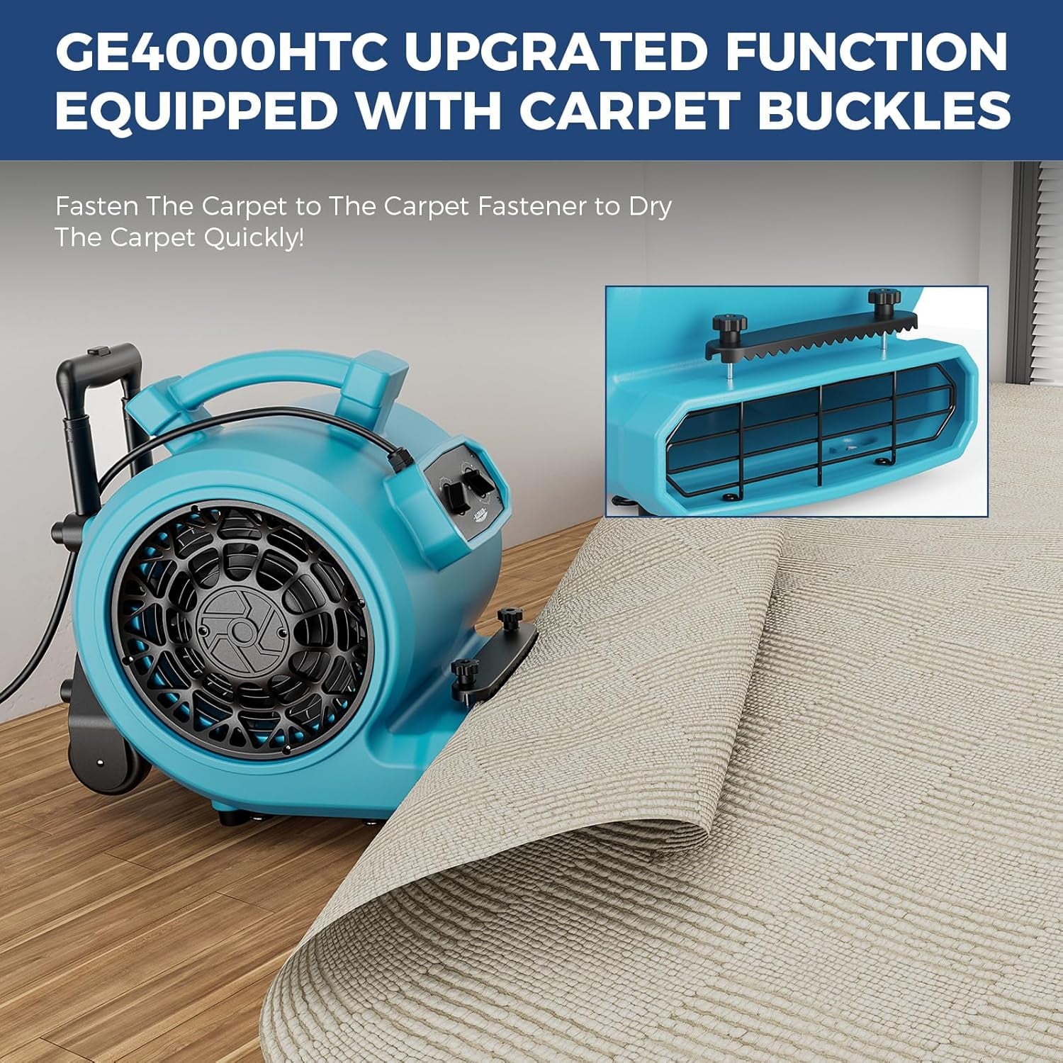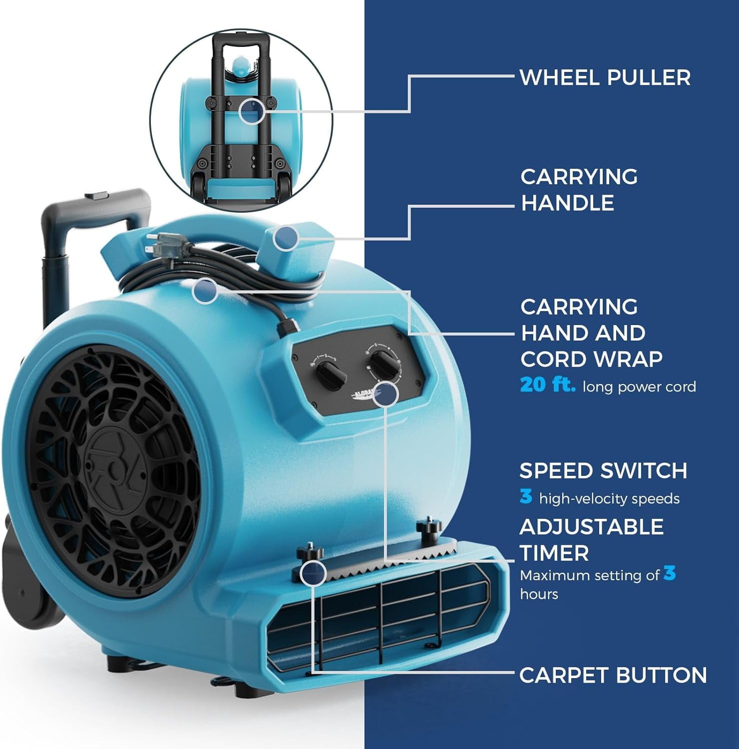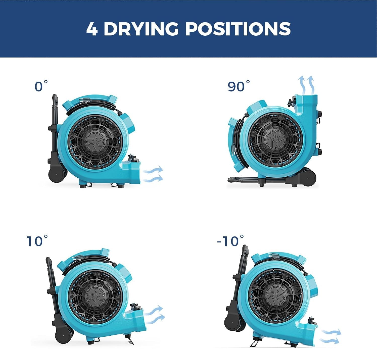 • VERSATILE FEATURES – 3 speeds and 4 operating positions(0°, 90°, +10°, -10°) with a built-in 3h timer. Not only is it perfect for air drying, but it also enhances ventilation and increases air circulation in rooms. With a built-in handle and wheel kit, mobility is effortless. The carpet clasp secures the carpet to the carpet clasp for quick carpet drying!