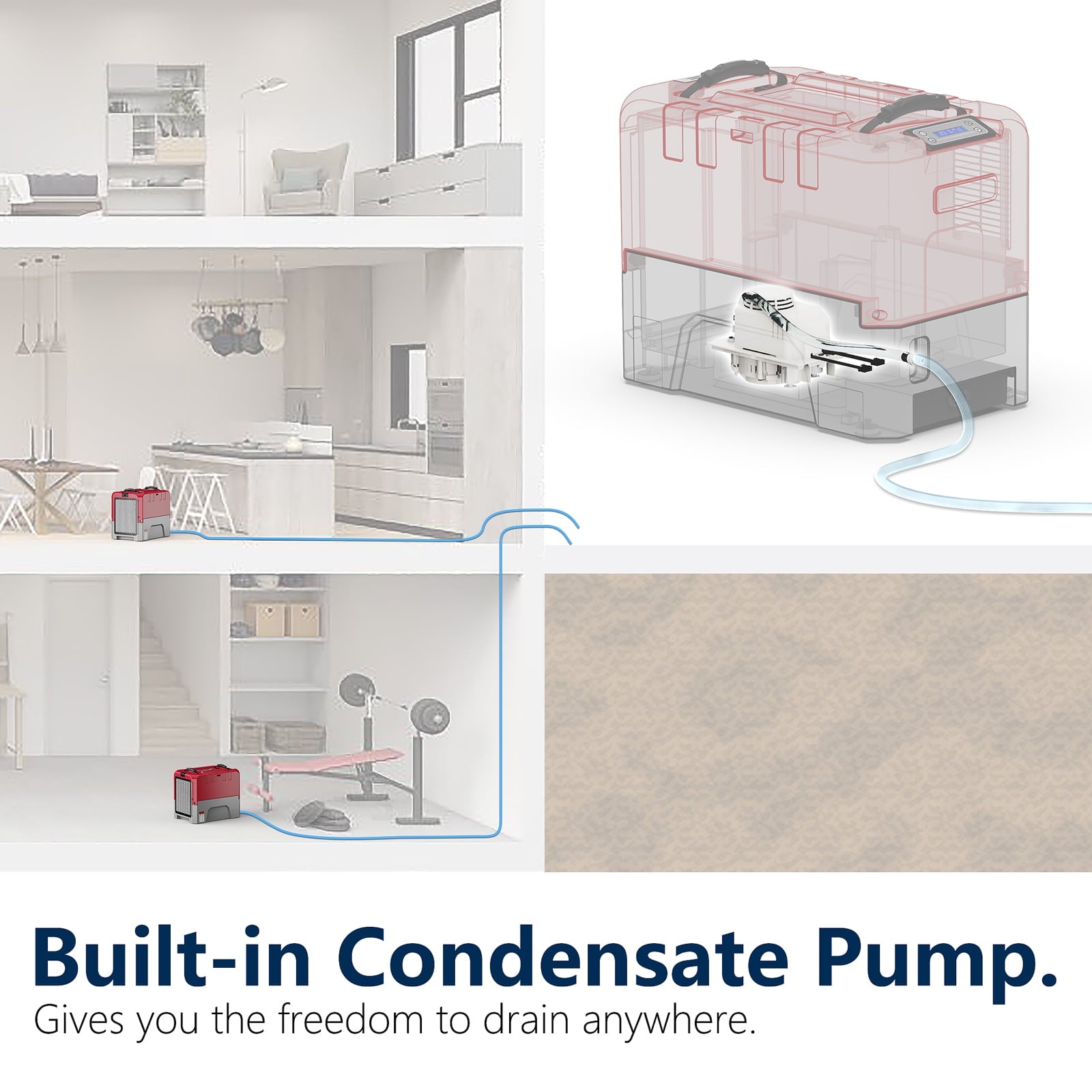 - Drain with the condensate pump.19.6 ft drain hose.