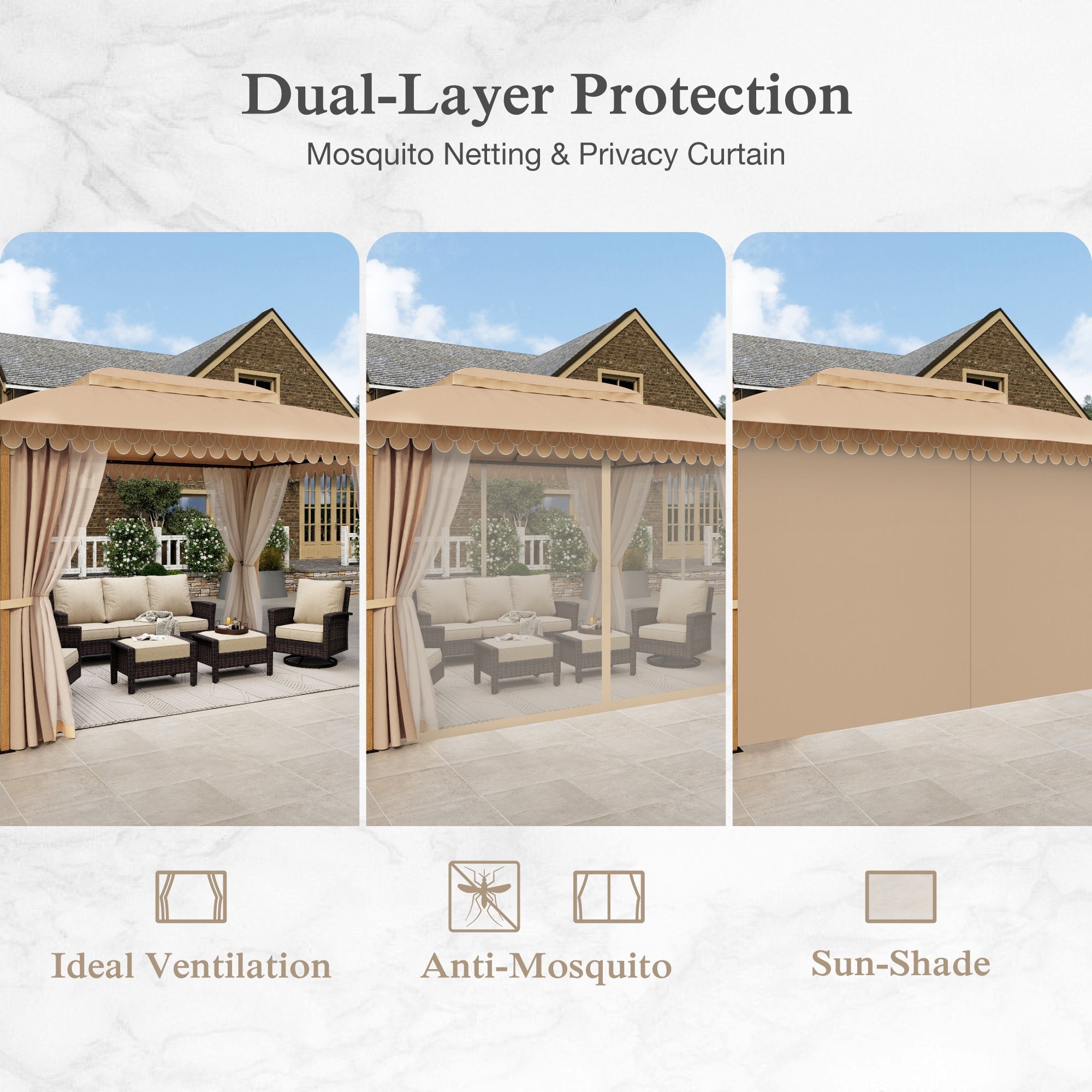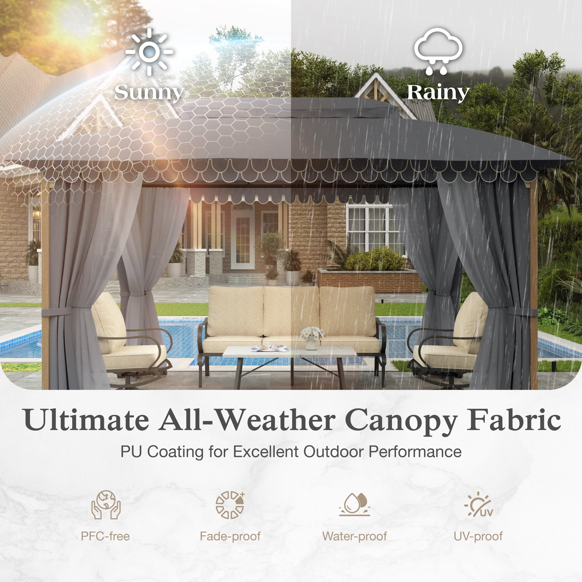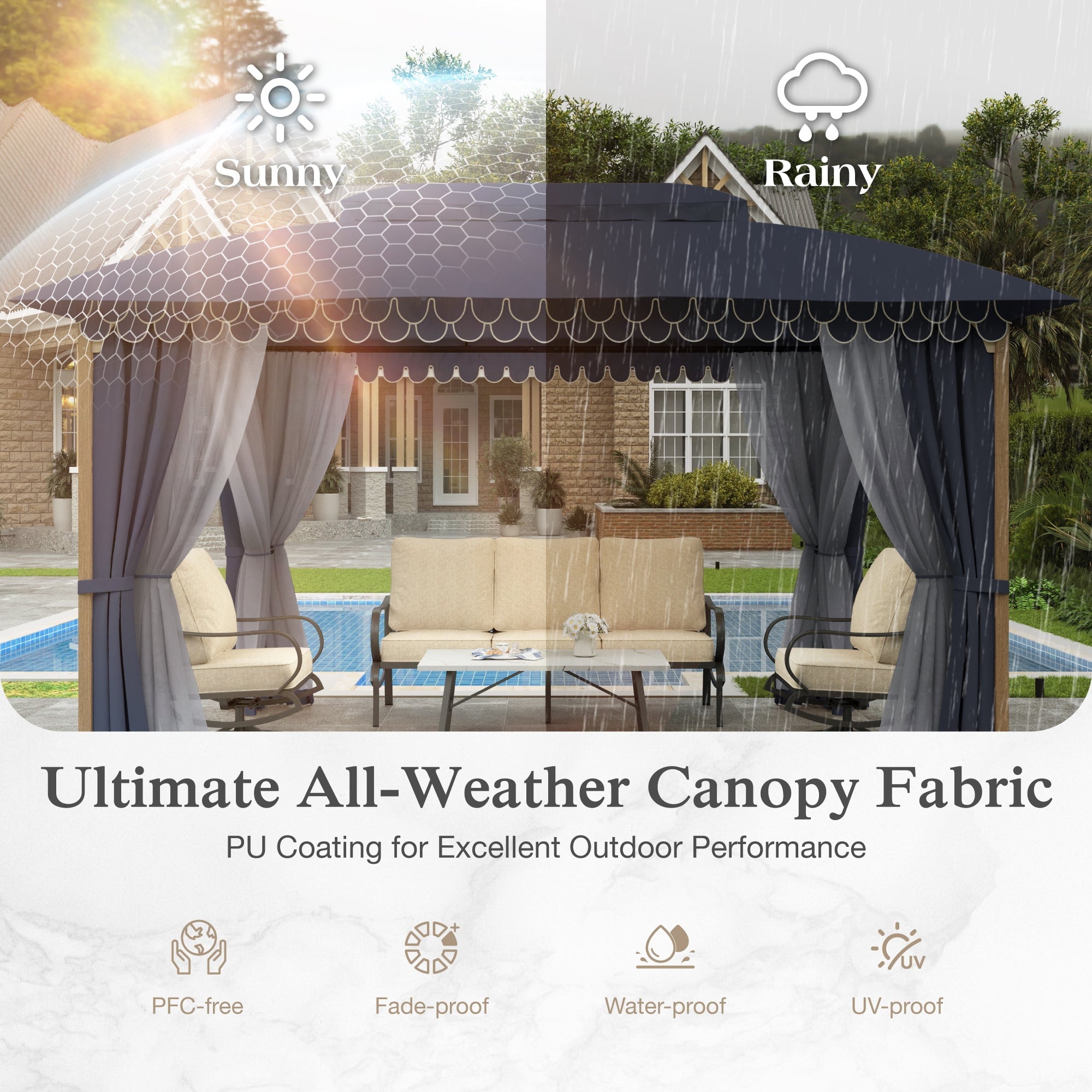 • All-Weather Protection:PU-coated double-layer top provides 100% waterproof shelter and wind-resistant stability, ideal for rain or shine.