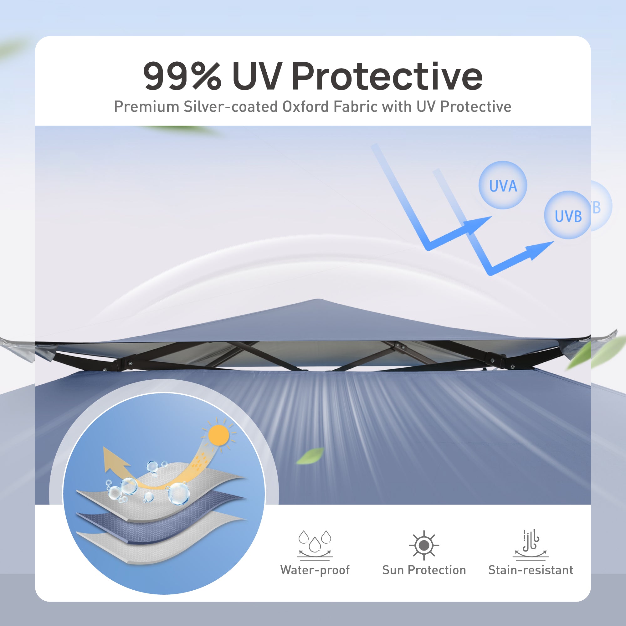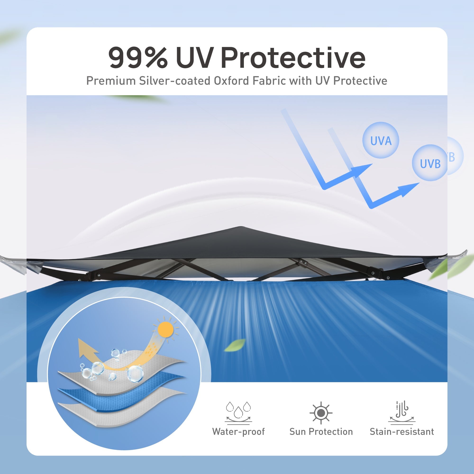 - Durable & Weather Resistant: Made from 150D Oxford cloth with a silver PU coating, this canopy offers outstanding waterproof protection. With UPF 50+ sun protection, you can relax comfortably and stay safe from harmful UV rays. Plus, multiple drain holes keep your shelter dry even on rainy days.
