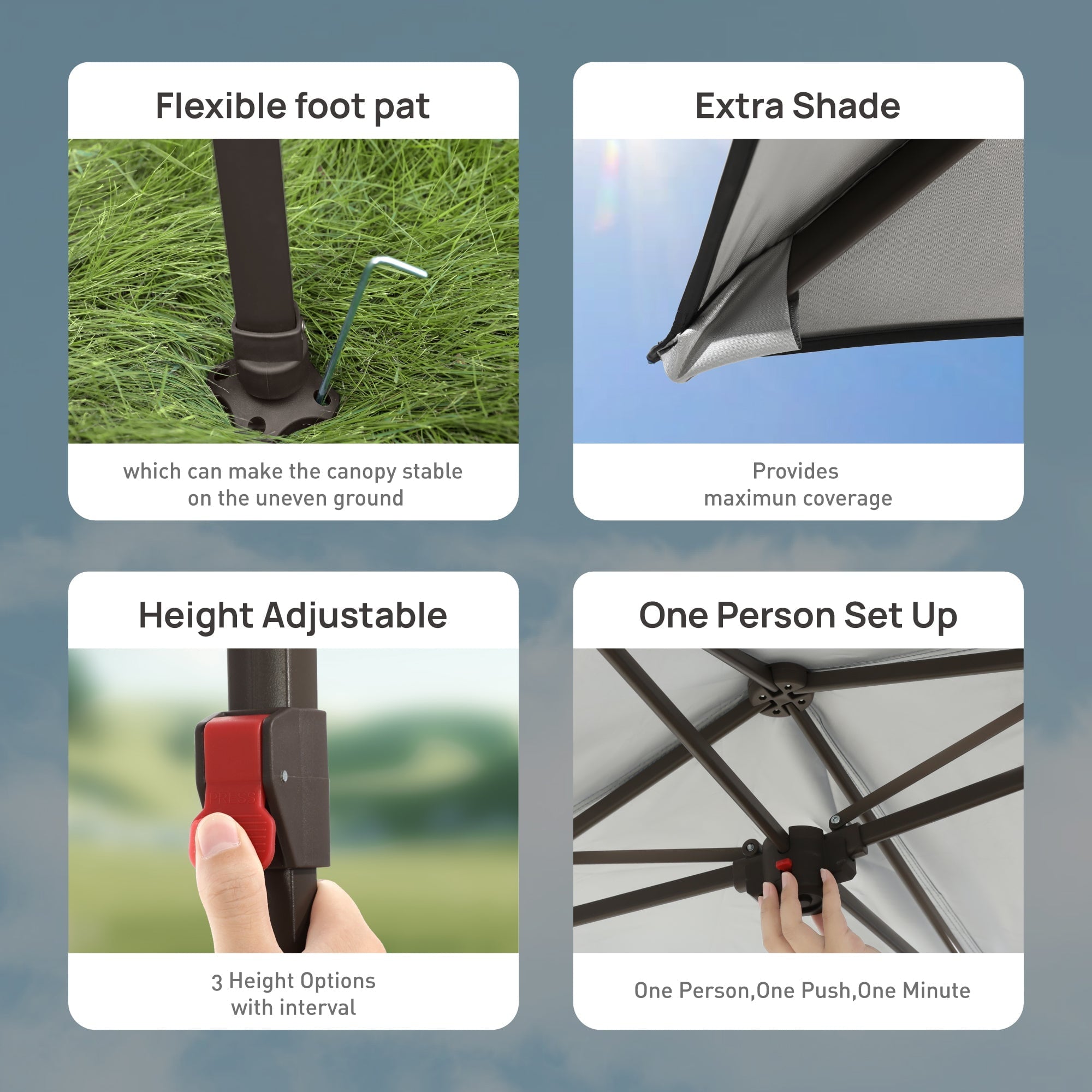 - Stable on Uneven Ground: With its flexible foot pad, this canopy remains stable even on uneven surfaces. It’s perfect for parks, beaches, or backyards—no more worries about it sliding or tipping over, so you can relax in your space stress-free!