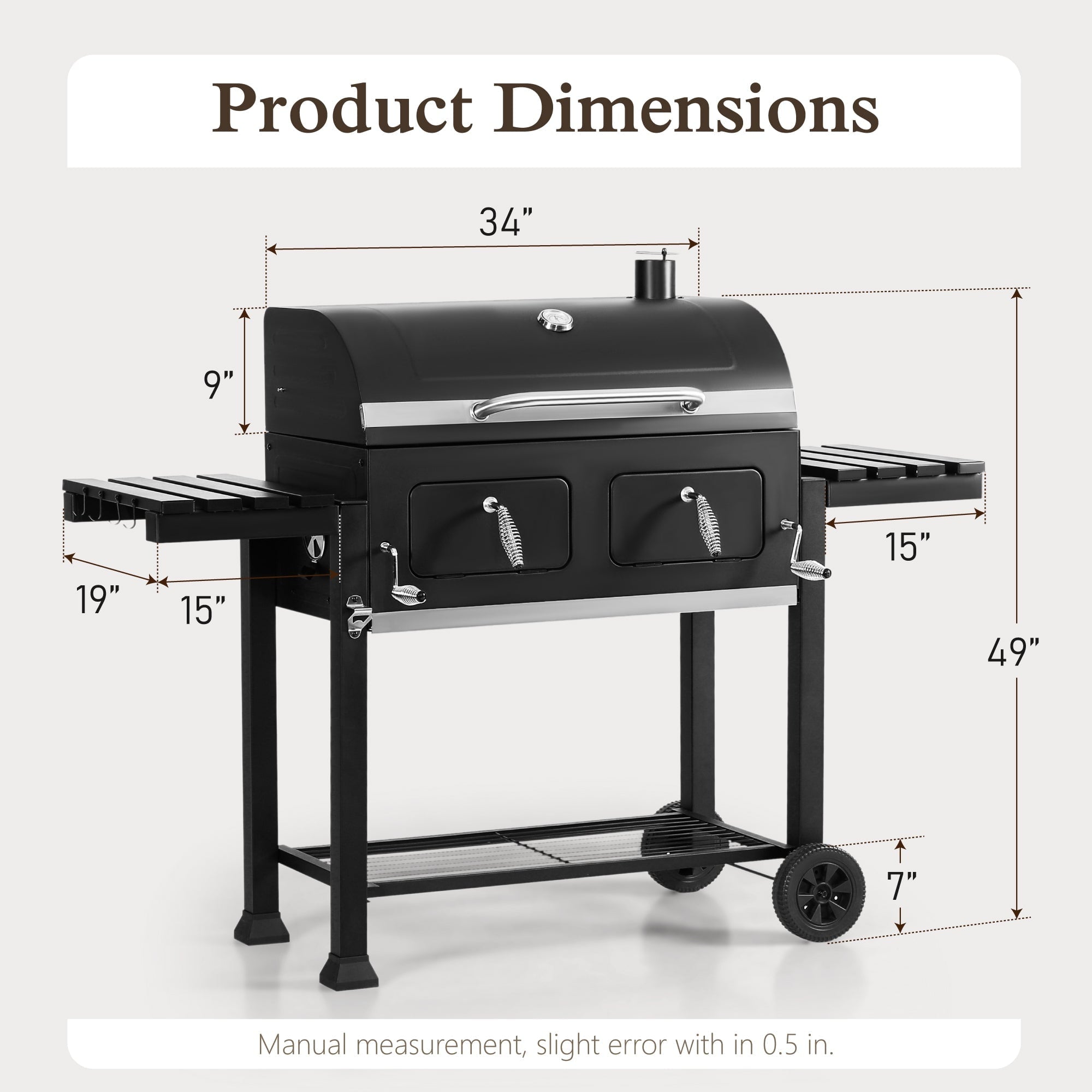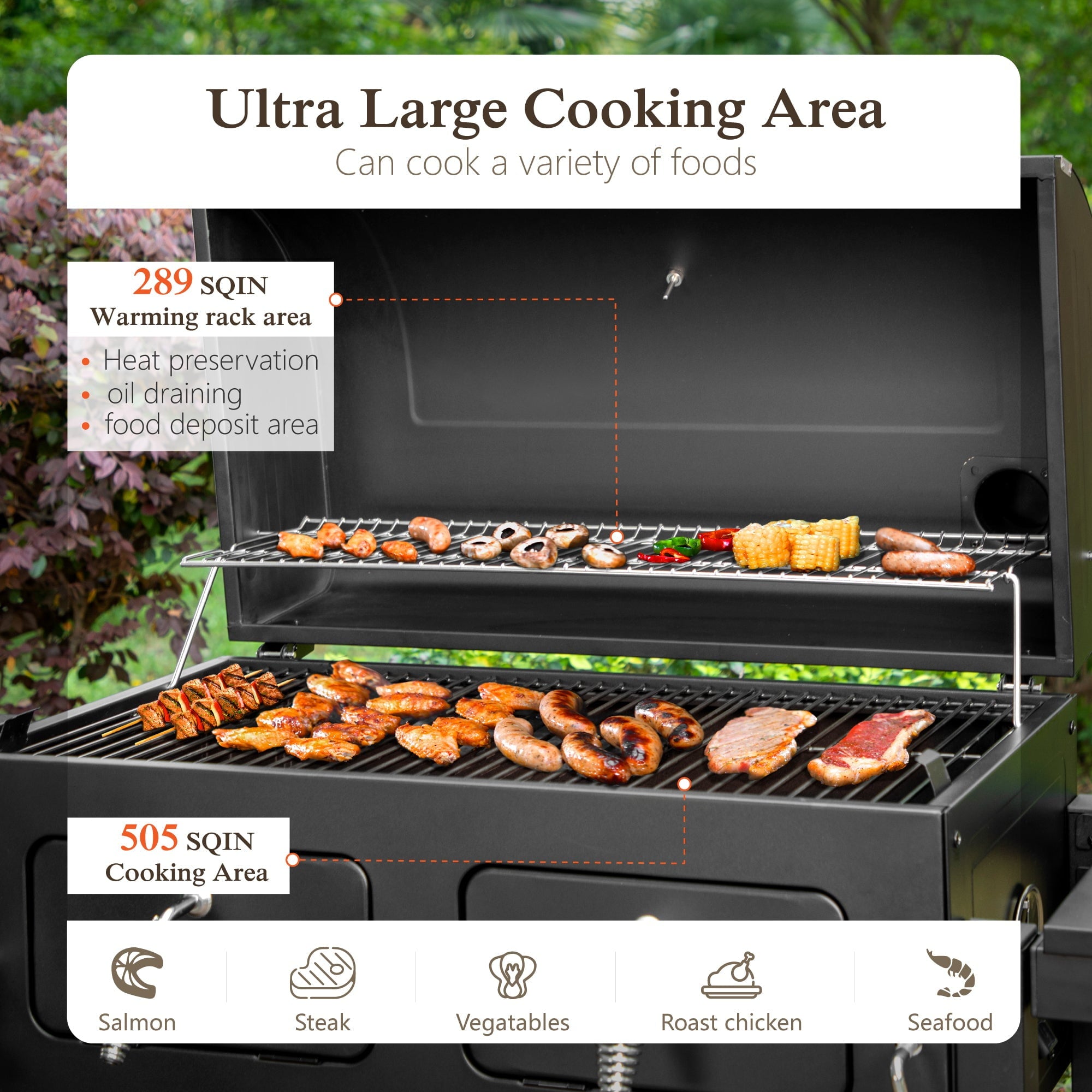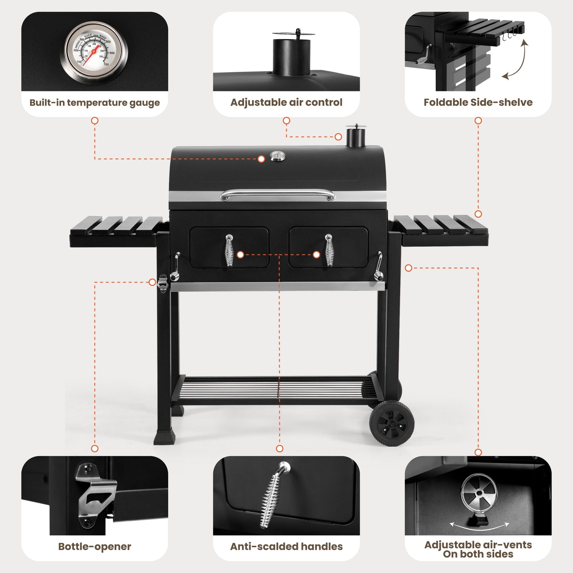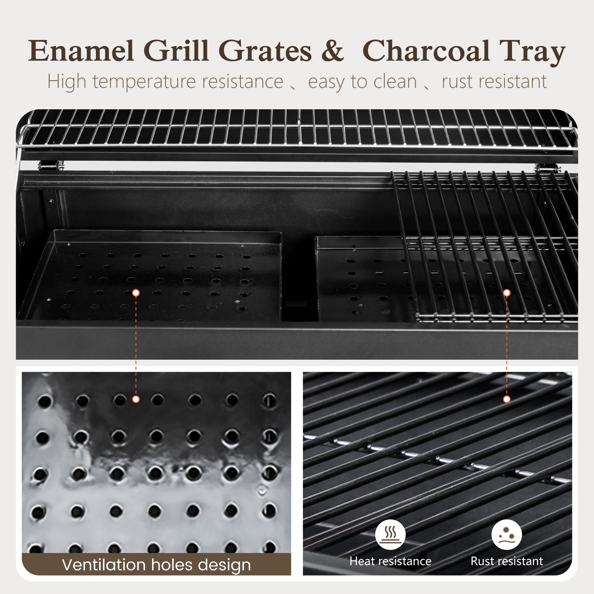 Crafted from durable steel with anti-rust properties, this Charcoal Barbecue Grill with 2 Adjustable Charcoal Pans ensures years of reliable use. Boasting a total cooking space of 794 sq. in., it provides ample room to cater to small gatherings or large parties. The porcelain-enameled grill grates and chromium-coated warming rack are both non-stick and durable. This BBQ also features two charcoal access doors, two adjustable charcoal pans, a pull-out ash tray, and a built-in, easy-to-read lid thermometer. The foldable side tables, complete with “S” hooks, offer convenient space for platters, marinades, and more. Additionally, large wheels ensure easy maneuverability around a porch, patio, or deck.
