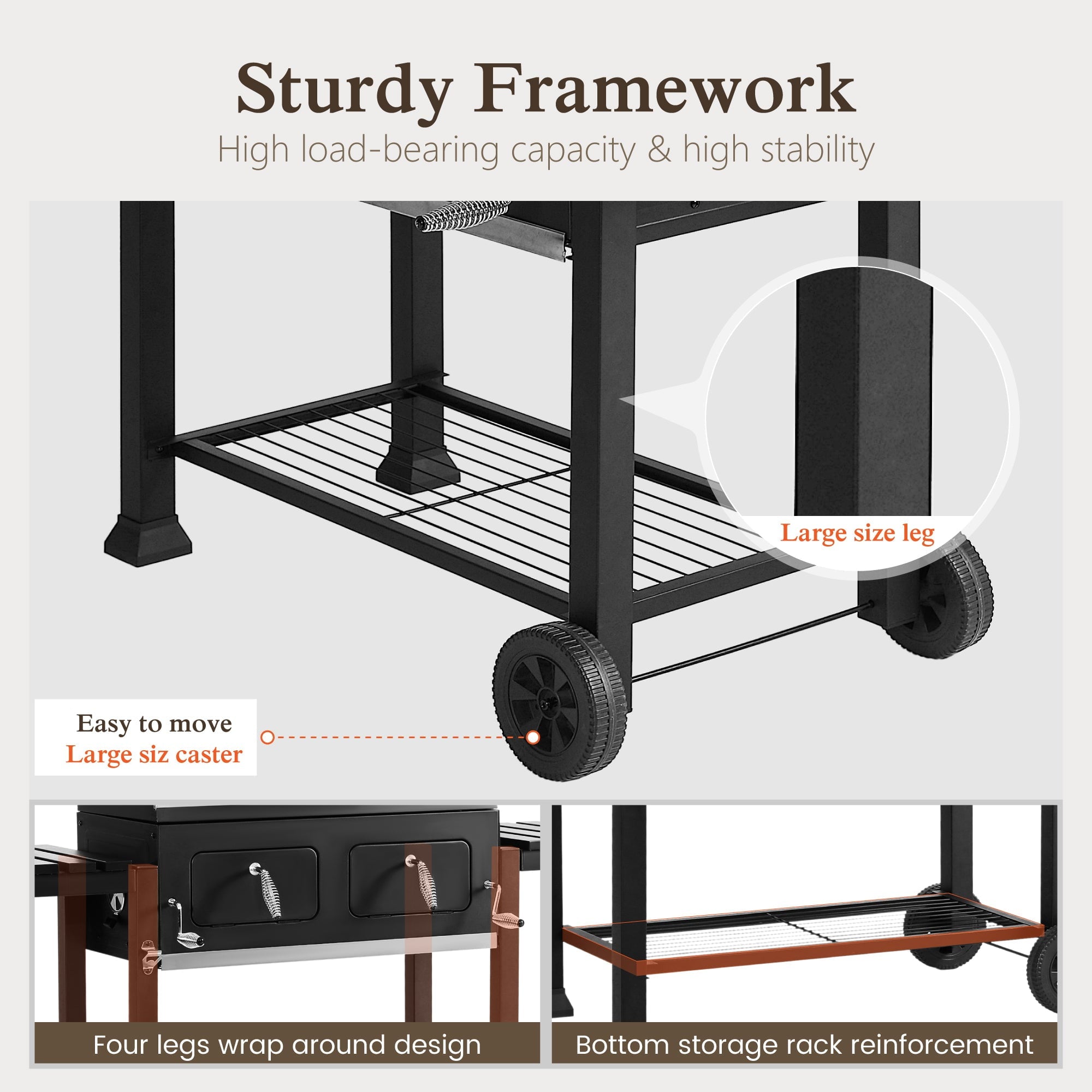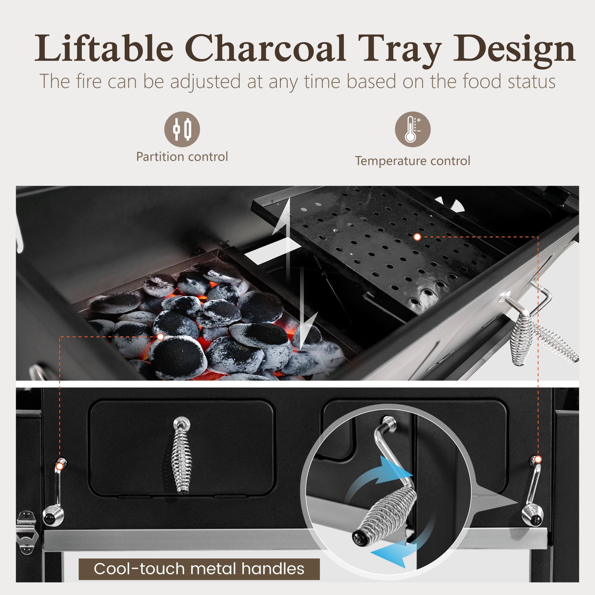 - The height-adjustable charcoal pans with ventilation holes allows you to fine-tune the temperature during grilling, ensuring optimal performance