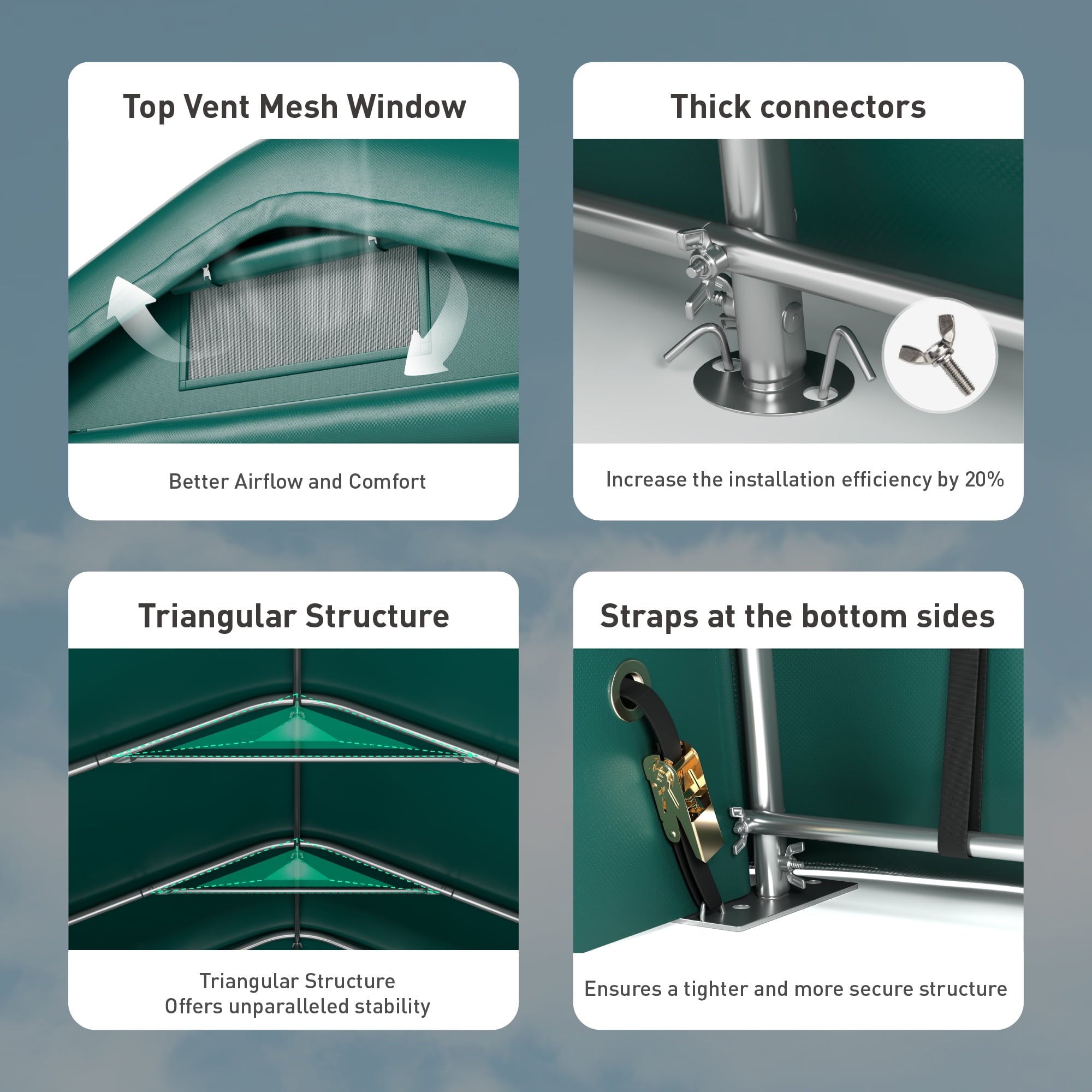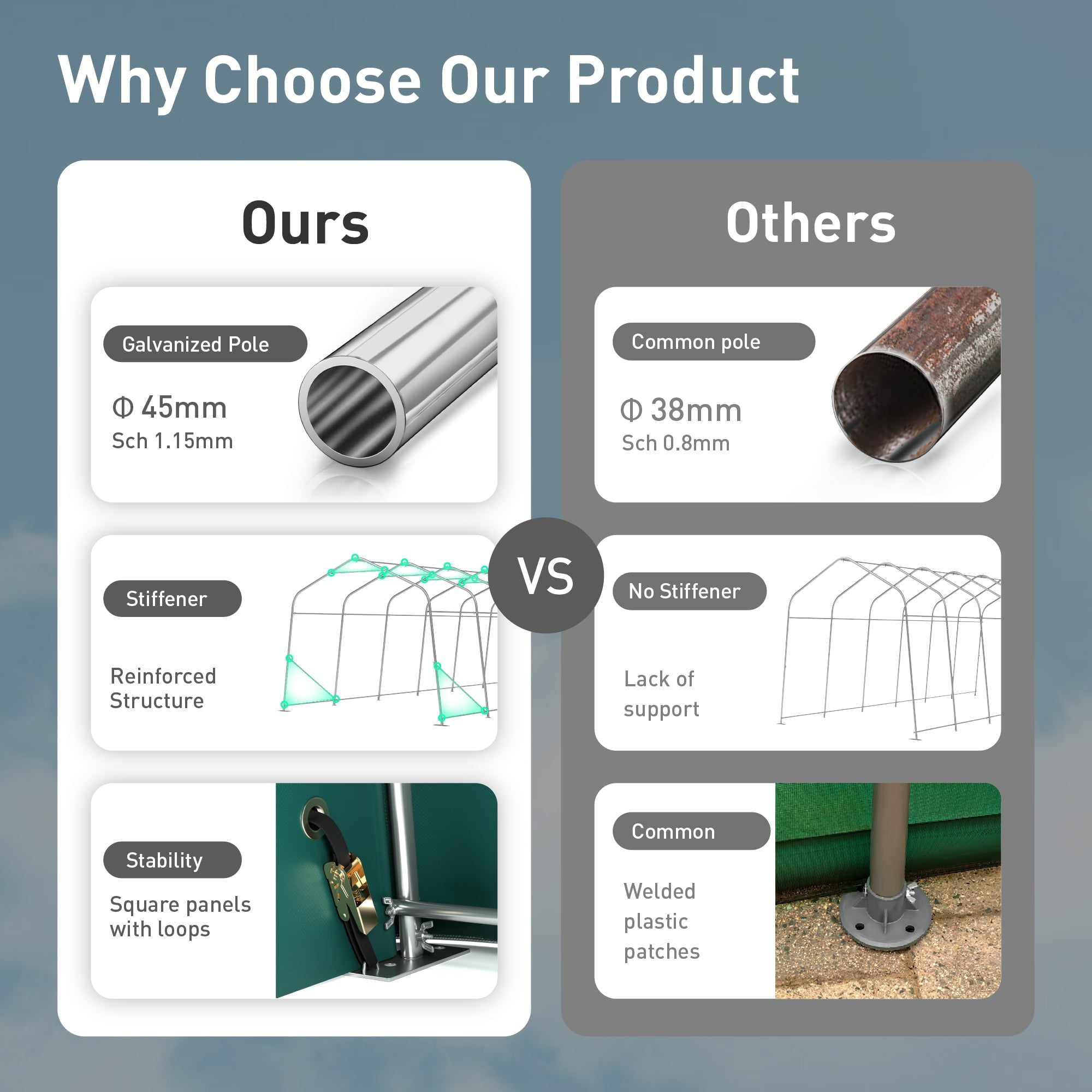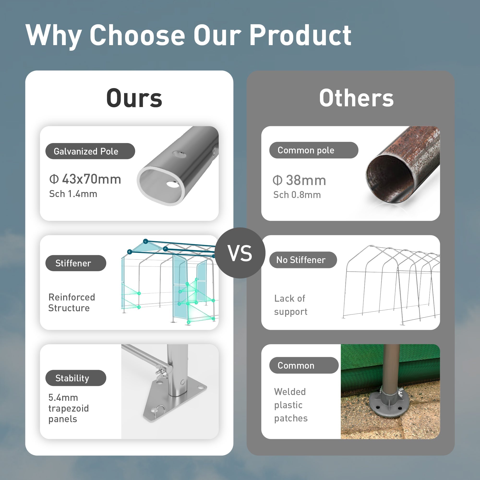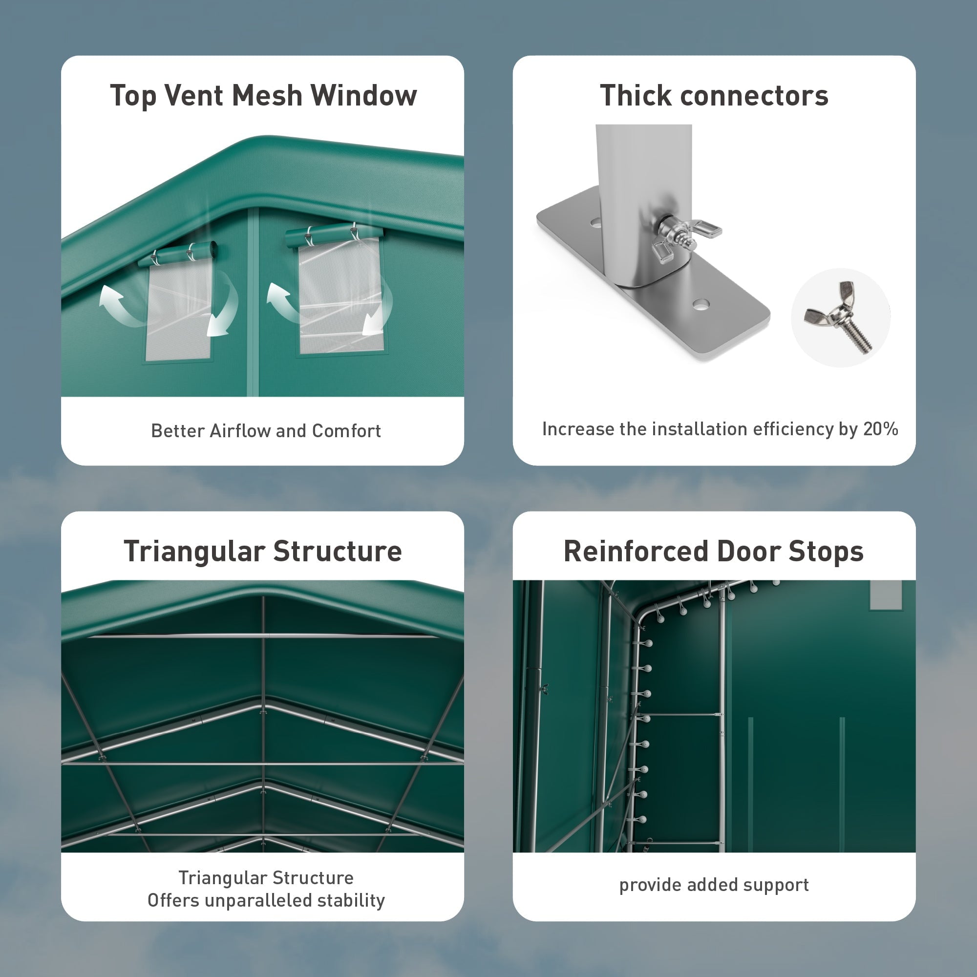 - Reliable Stability and Support: The Alpha Joy agricultural storage shed comes with tent clamps and 8 durable nail-type ground stakes (10*300mm) for a solid setup that meets all your outdoor needs. Its 5.4mm square ground panels and door tightening loops guarantee a secure hold, preventing wind lift and keeping your space safe and sound.
