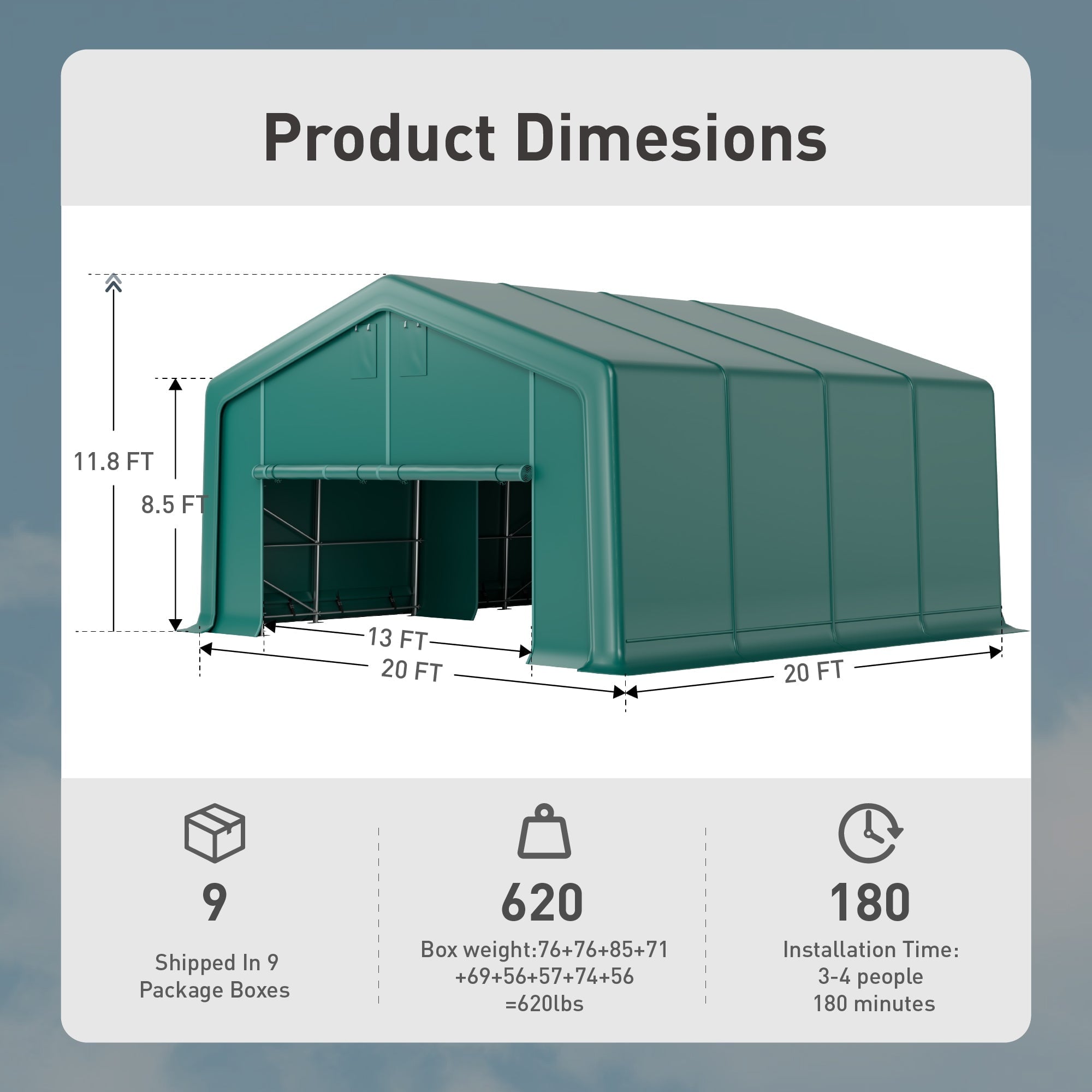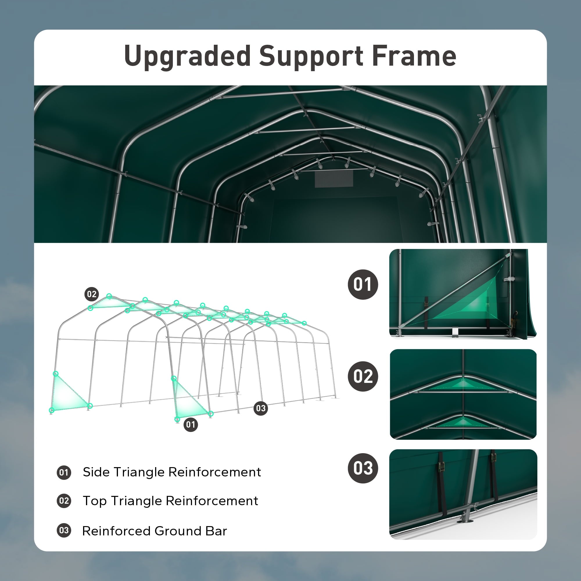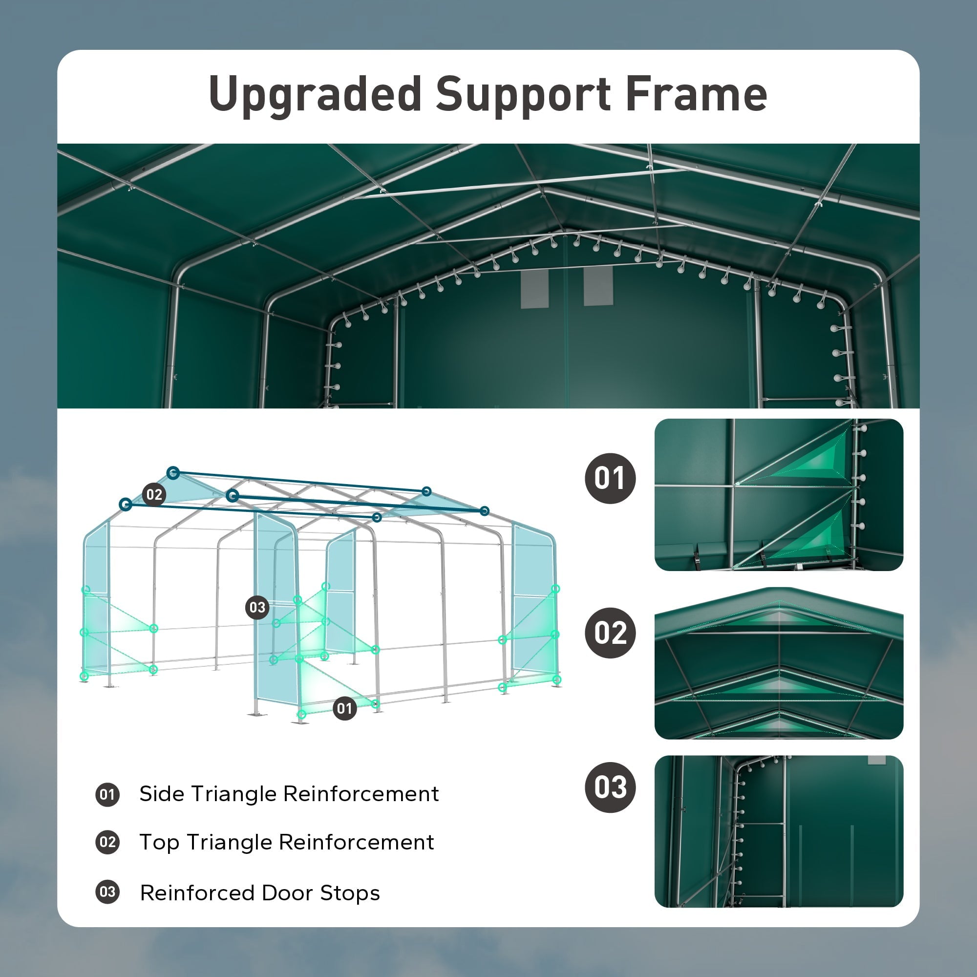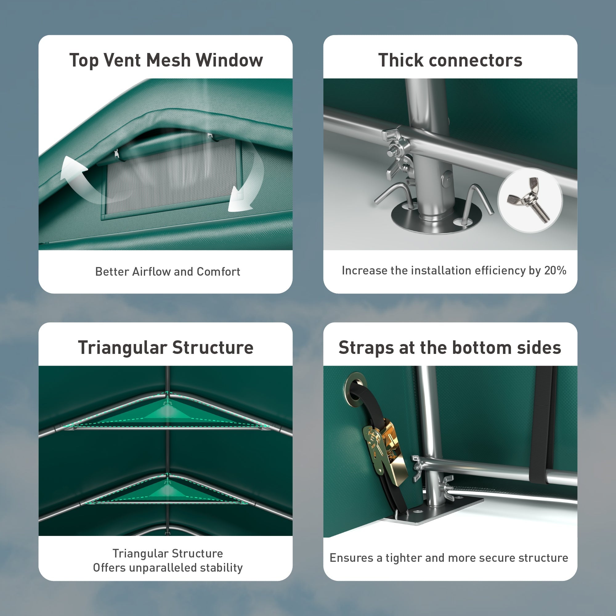 - Reliable Stability and Support: The Alpha Joy agricultural storage shed comes with tent clamps and 8 durable nail-type ground stakes (10*300mm) for a solid setup that meets all your outdoor needs. Its 5.4mm square ground panels and door tightening loops guarantee a secure hold, preventing wind lift and keeping your space safe and sound.