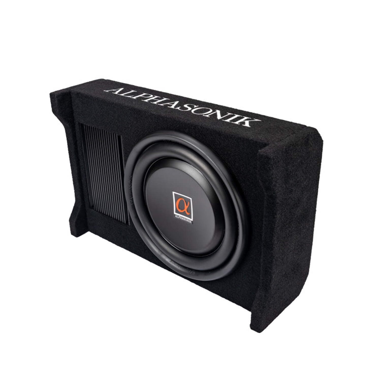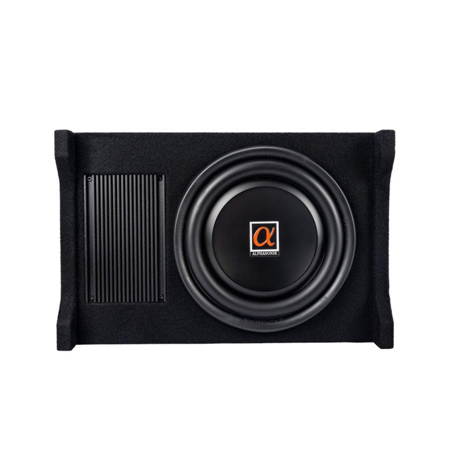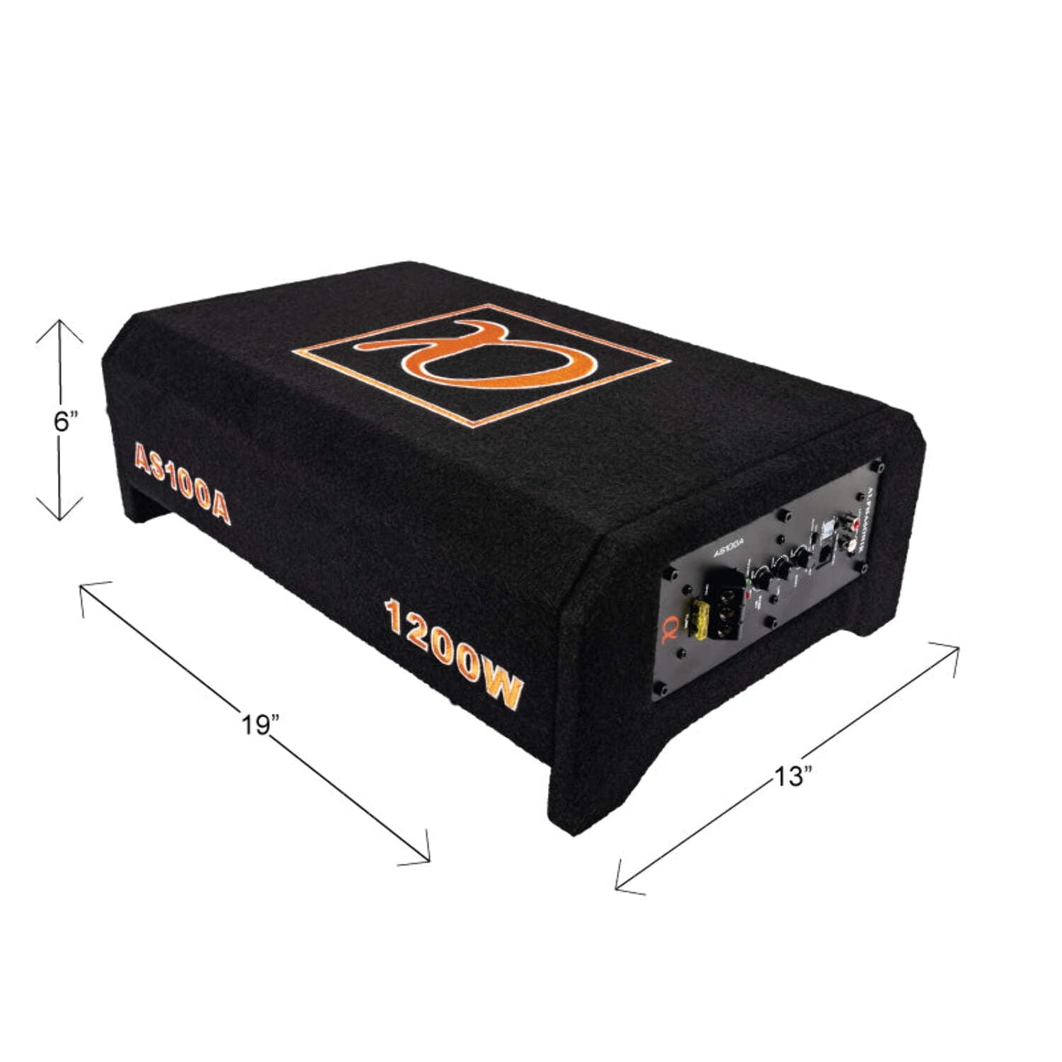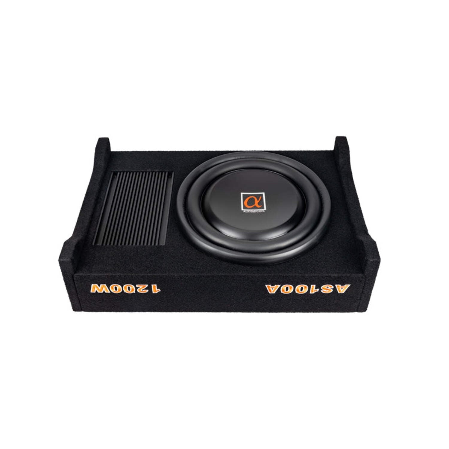 Alphasonik has added to the all successful AS Series downward facing enclosures. Introducing the all NEW AS100A Active down-firing enclosures with a built-in 400 Watt / 1200 Watt MAX amplifier. The amplifier features Hi and Low level inputs, crossover, 0-+12dB bass boost, solid nickel plated power terminal blocks and a remote bass knob. The enclosure allows for installation in most vehicles due to its versatile sizing and can be mounted vertically or horizontally. Constructed with Medium Density Fiberboard known as MDF helps reduce vibration and blended with a special bond sealer guarantees an air-sealed enclosure. A perfectly matched tuned loud speaker has been constructed to use with the enclosure and the end result gets the low frequencies at optimal levels and achieves the deep rich bass that your heart desires.