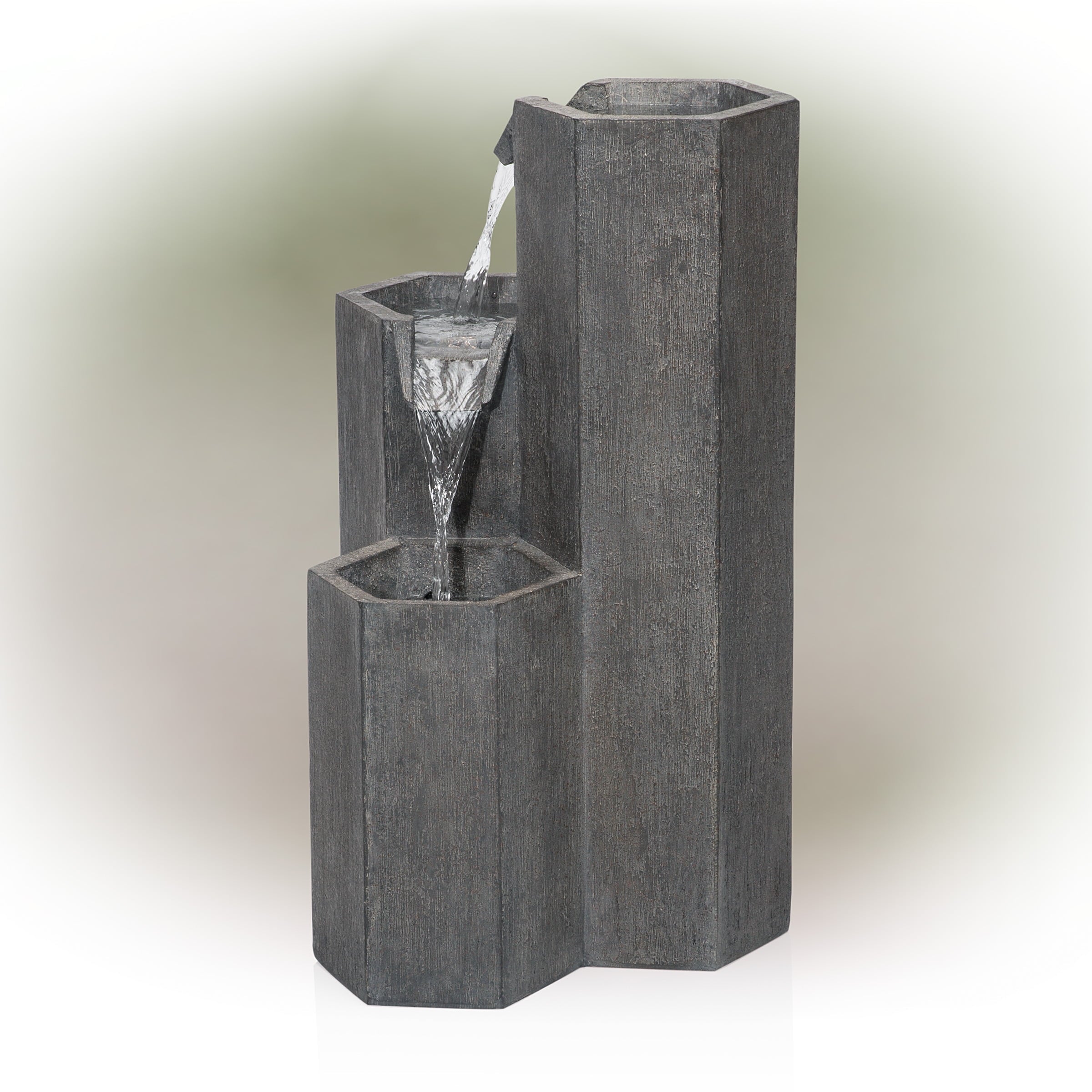 Enhance your indoor or outdoor living space with this 3-Tier Hexagonal Column Fountain with LED Light from Alpine Corporation. This 3-tier modern waterfall fountain floor statue provides a tranquil and soothing addition to your porch, backyard, or lawn. Constructed from durable polystone, this contemporary Zen water fountain is weatherproof, rust-resistant, and resilient. Relax to the sounds of the calming natural water flow as it trickles down from the tallest hexagonal column of the fountain, down to the lowest column. The weathered-looking columns have a rough texture that imitates natural stone. The fountain becomes illuminated with the integrated LED lights, providing you an ambient light source to your home’s interior or exterior decor. Not only will the fountain provide you with serenity, it will also attract birds to your outdoor area, which in turn promotes healthy gardens.. This standing fountain measures 14″L x 14″W x 25″H to fit almost any outdoor or indoor area and includes a one year manufacturer’s warranty from date of purchase.